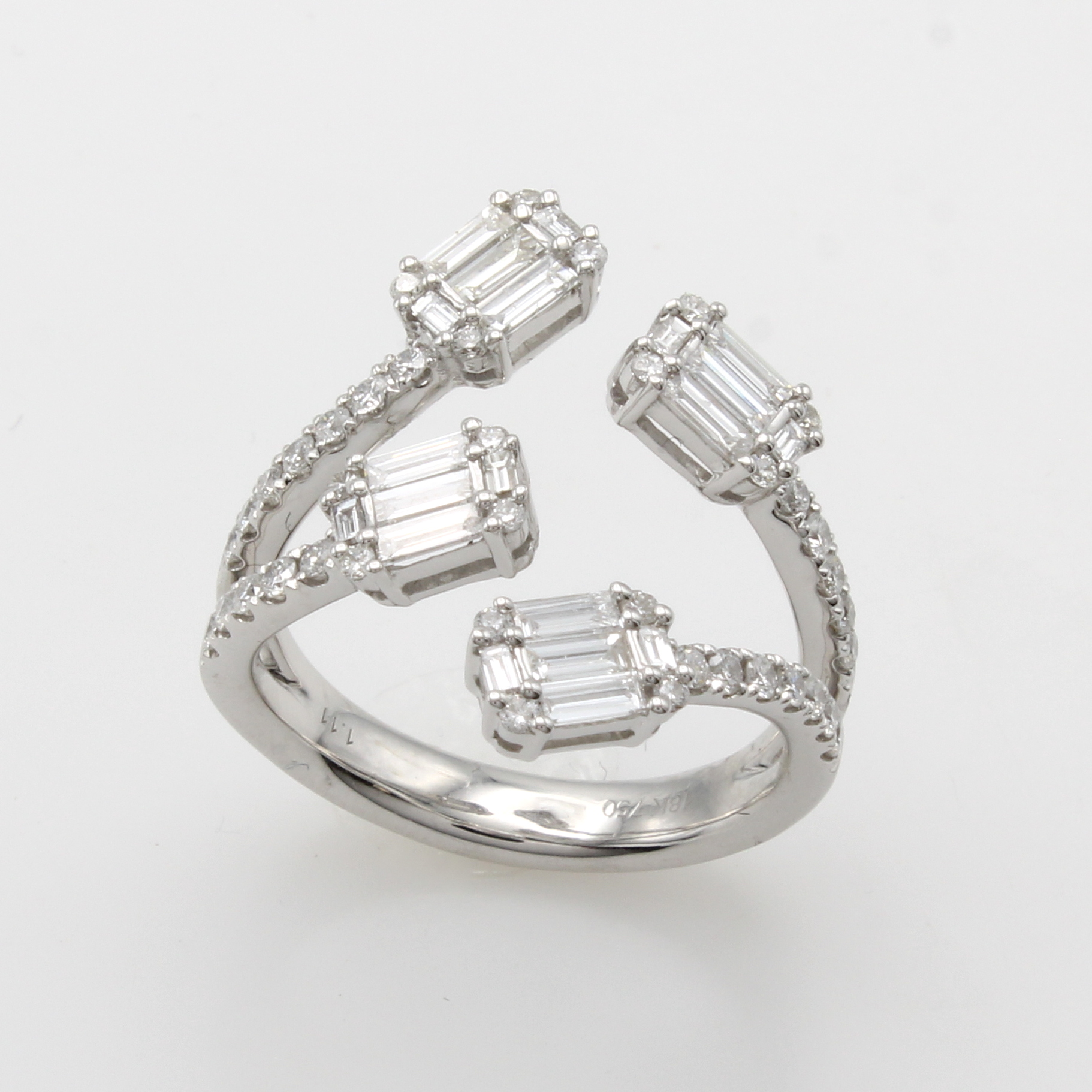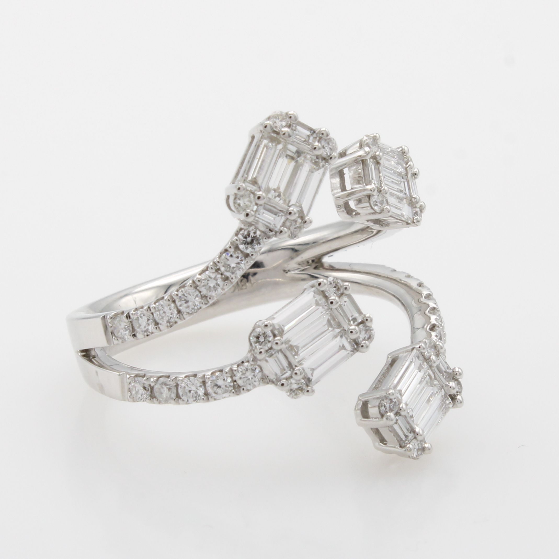 Ring mit Diamanten und Brillanten, WG 750/ 000, Diamantbaguettes zus. ca. 0.68 ct u. Brill. zus. ca. 0.43 ct feines Weiß-Weiß/si, 2-rhg., versetzte Form, RW ca. 54 Schätzpreis: 6320, - EUR