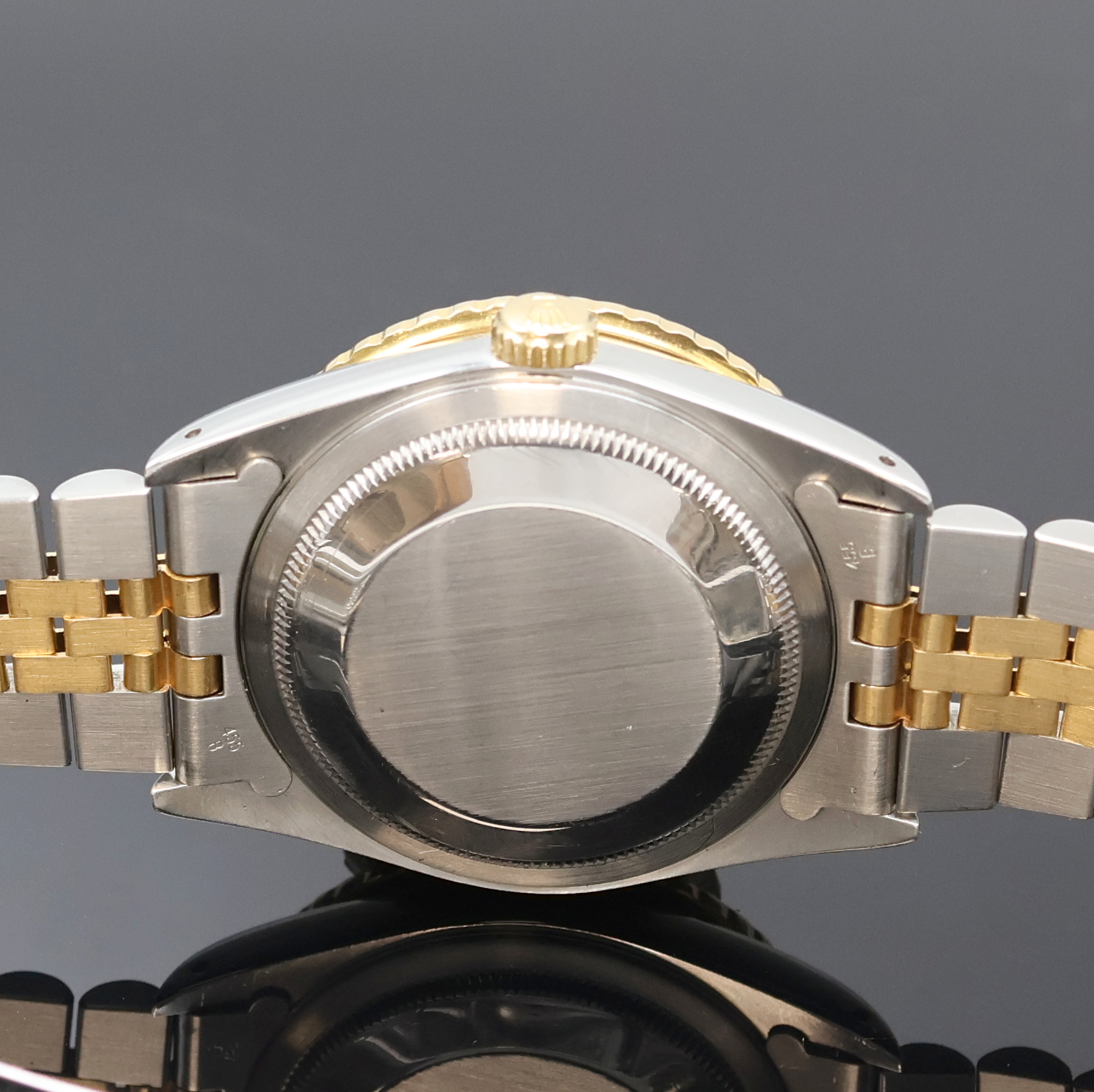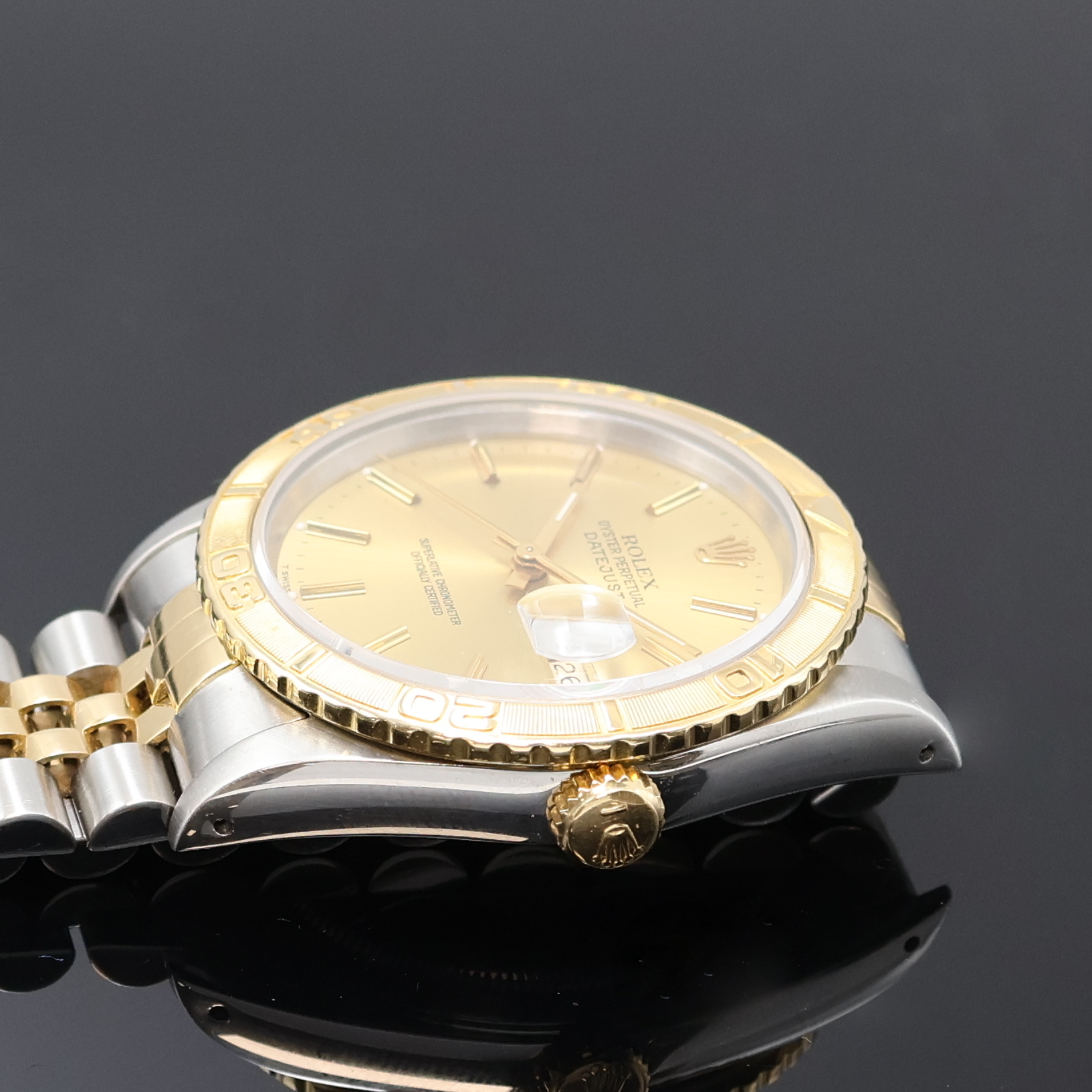 ROLEX Oyster Perpetual Datejust Turn-O-Graph Herrenarmbanduhr Referenz 16263, Schweiz um 1991, Automatik, Chronometer der Superlative in Stahl/Gold, orig. Jubileeband m. Faltschl., Boden u. Krone verschr., Lünette m. 60er Teilung beids. drehb., champagnerfarb. Zifferbl. m. aufges. Std.- Ind., gold. Zeiger, Datum b. 3, Kal. 3135, 31 St., 5 Adj., D. ca. 36 mm, L. ca. 19,5 cm, EZ 2