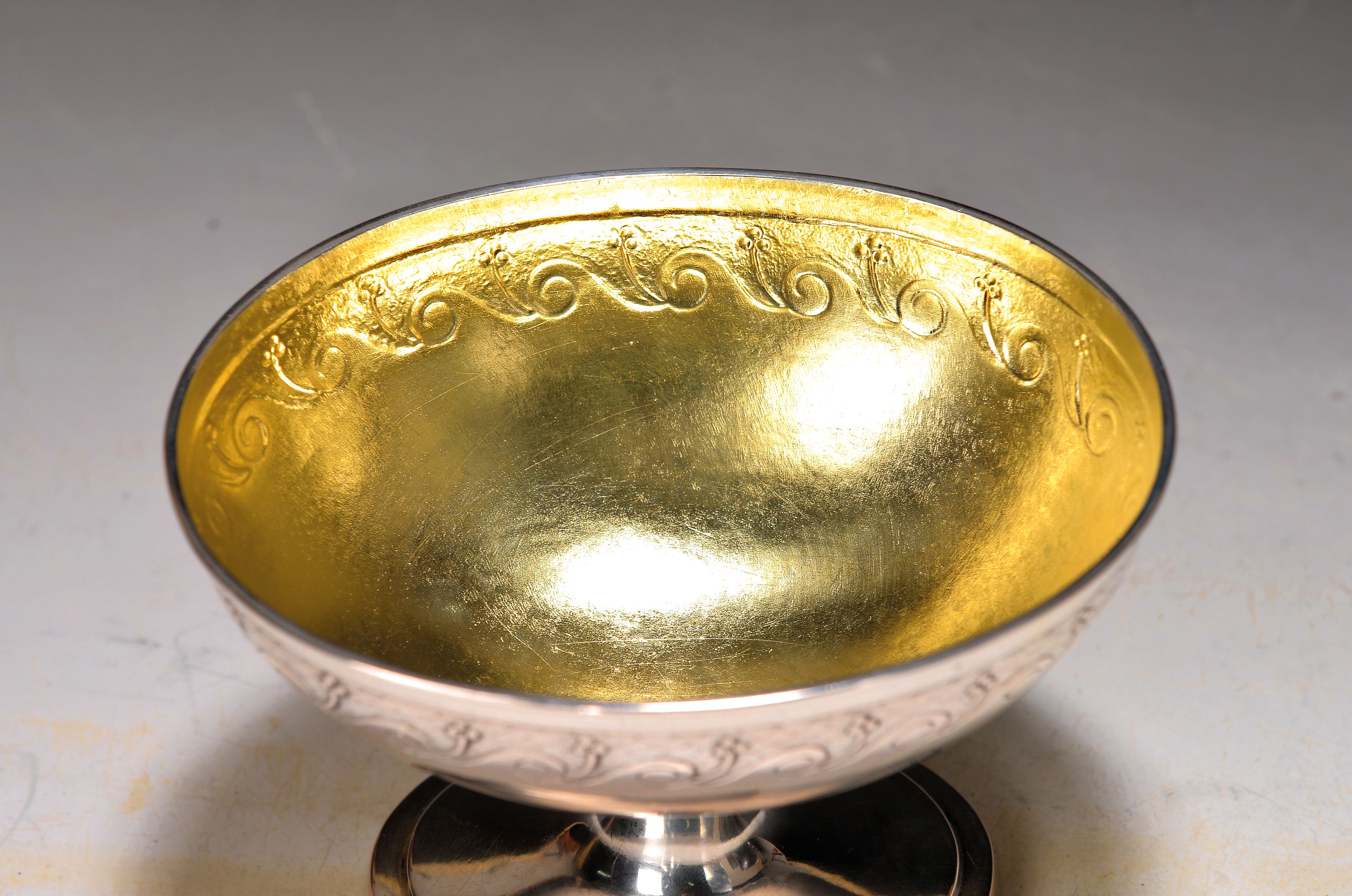 und Blüten, profilierter Fuß und Deckel, getrieben, Innen vergoldet, Altersspuren,