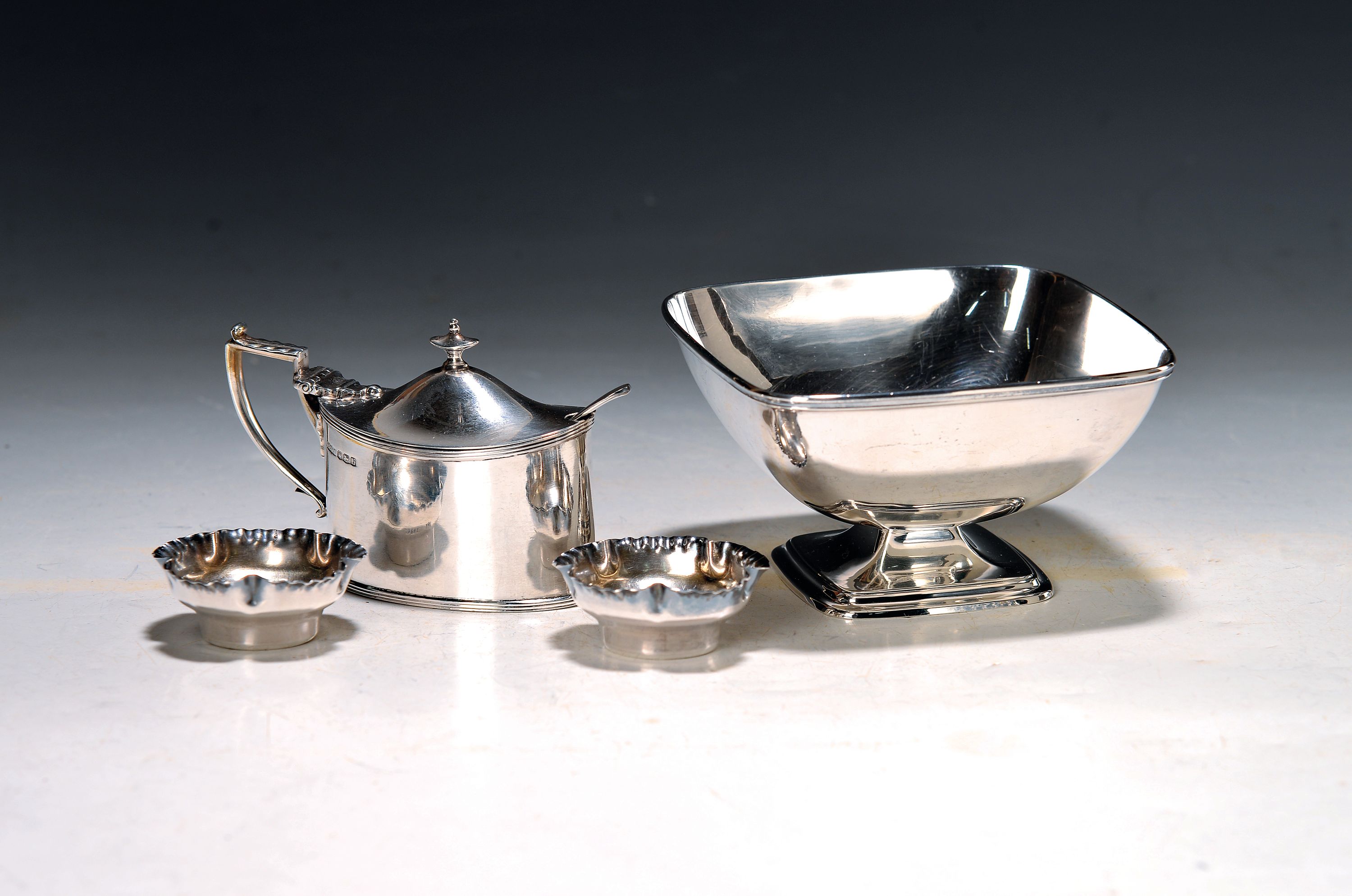 Vier Teile silbernes Tafelzubehör, Sterlingsilber, um 1900 und später, Senfgefäß,