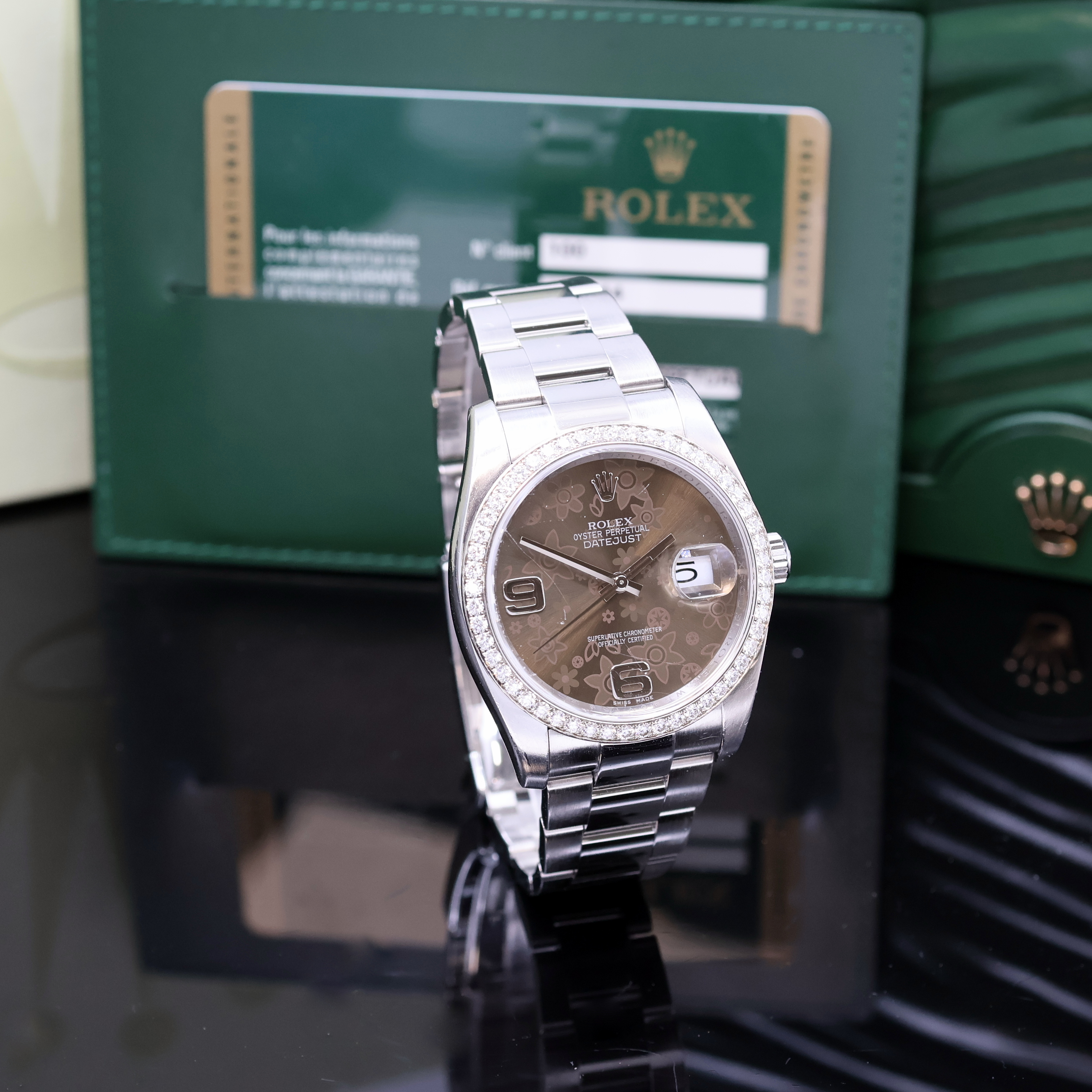 in Edelstahl inkl. Oysterband m. Faltschl., Lünette aufw. m. Brillanten bes., florales