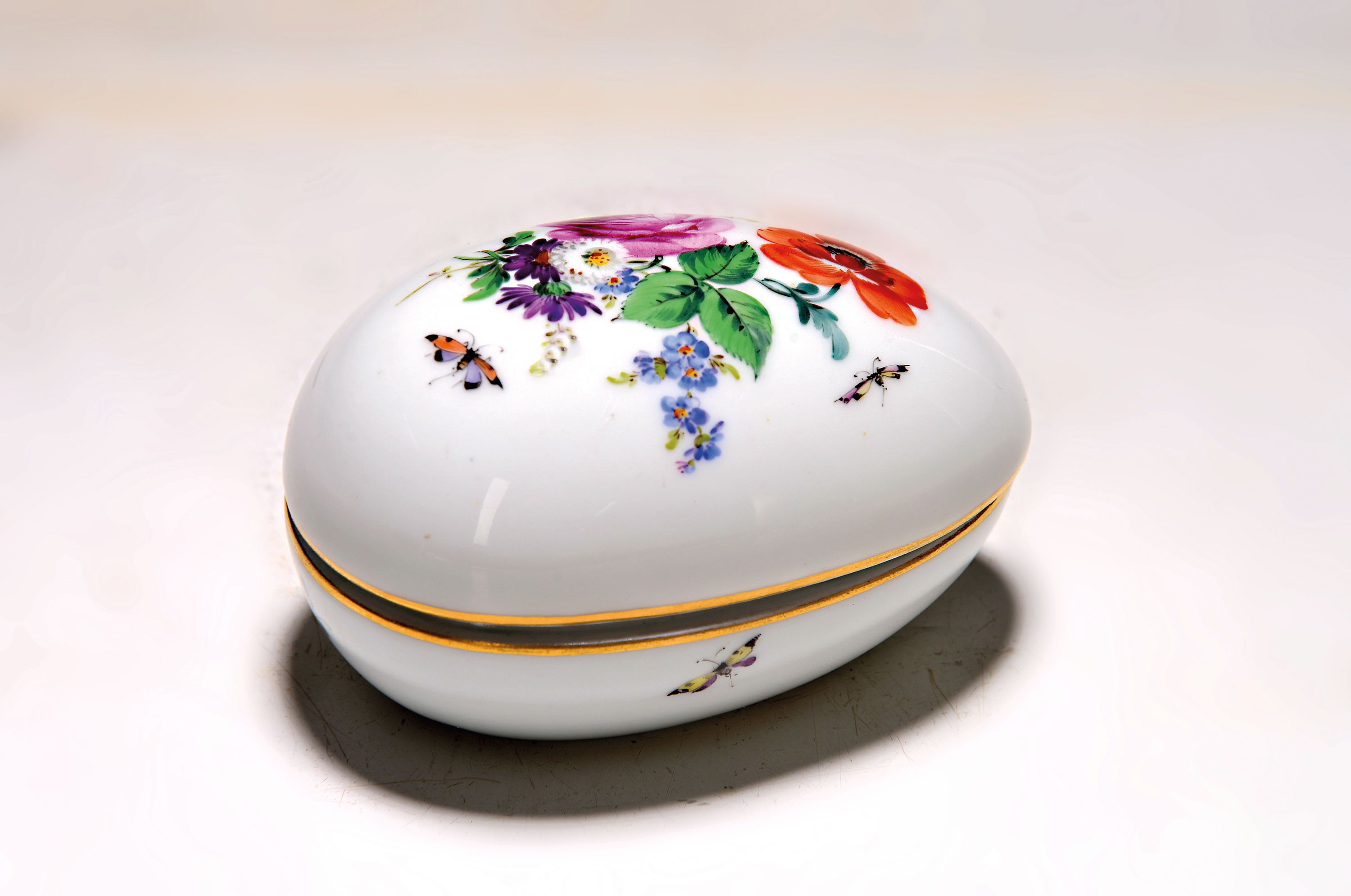 Deckeldose in Form eines Eies, Meissen, um 1900, 1. Wahl, feine bunte Blumenmalerei