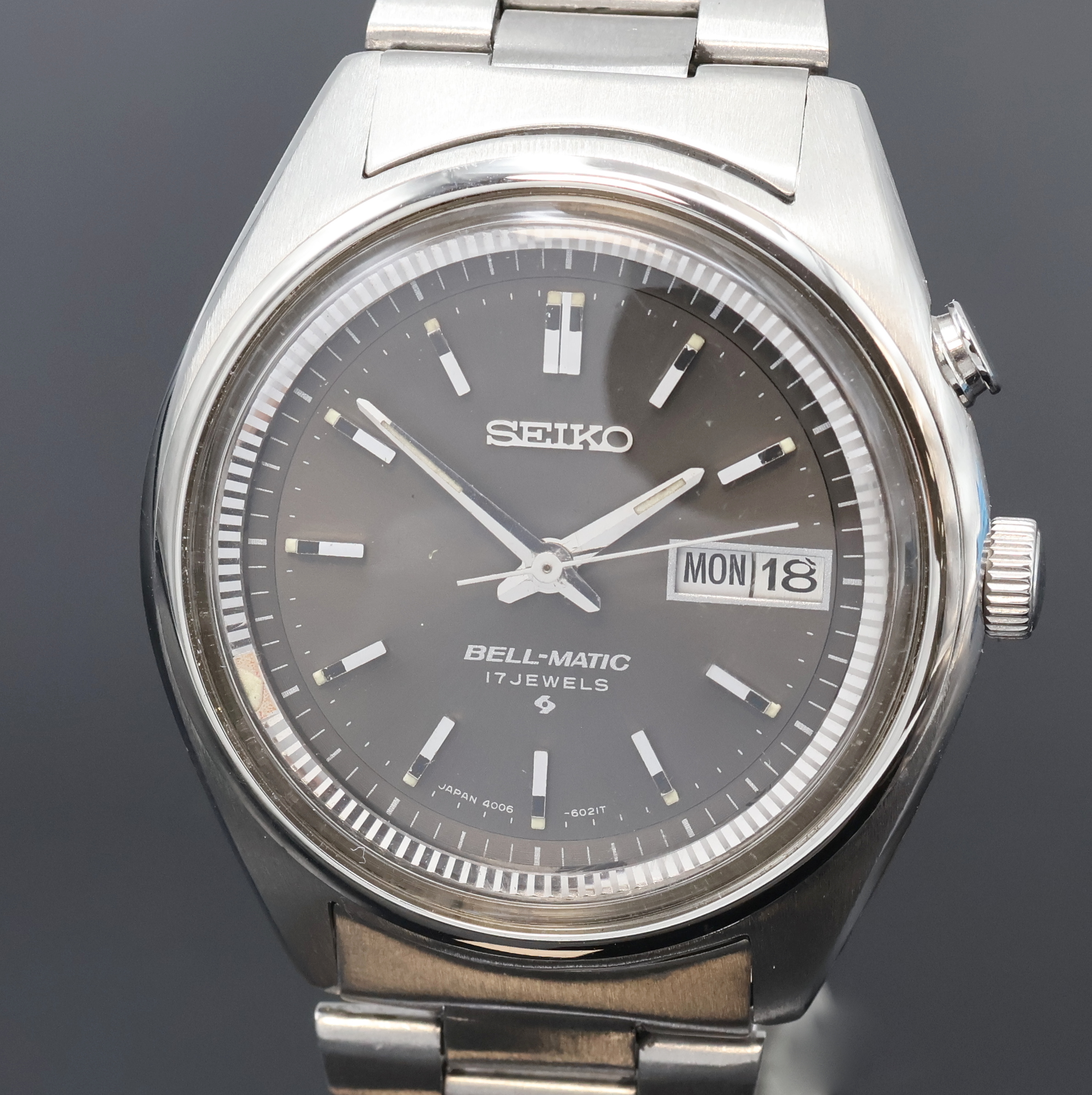 SEIKO Bell-Matic Herrenarmbanduhr mit Wecker in Stahl Referenz 4006-7020, Japan um