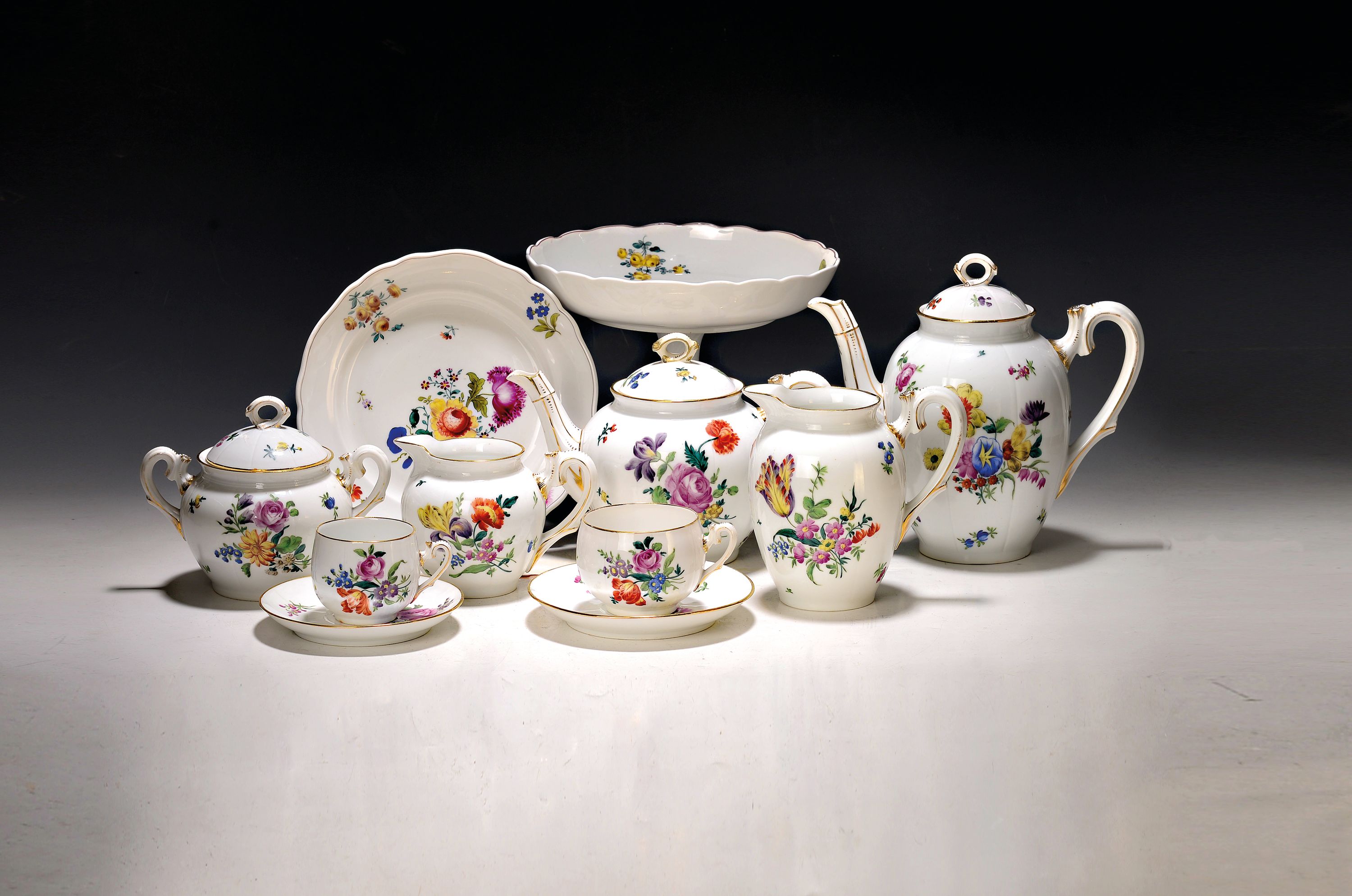 Sahnegießer, 6 Kaffeetassen mit Untertassen, 5 Teetassen mit Untertassen, 12 Kuchenteller,