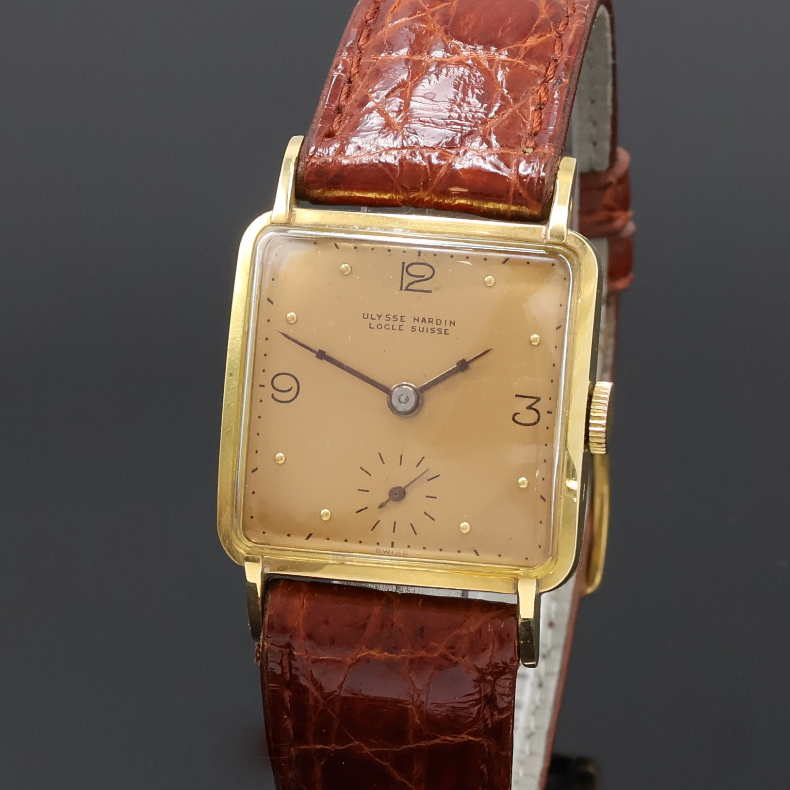 ULYSSE NARDIN viereckige Armbanduhr in GG 750/000, Schweiz um 1940, Handaufzug, Boden