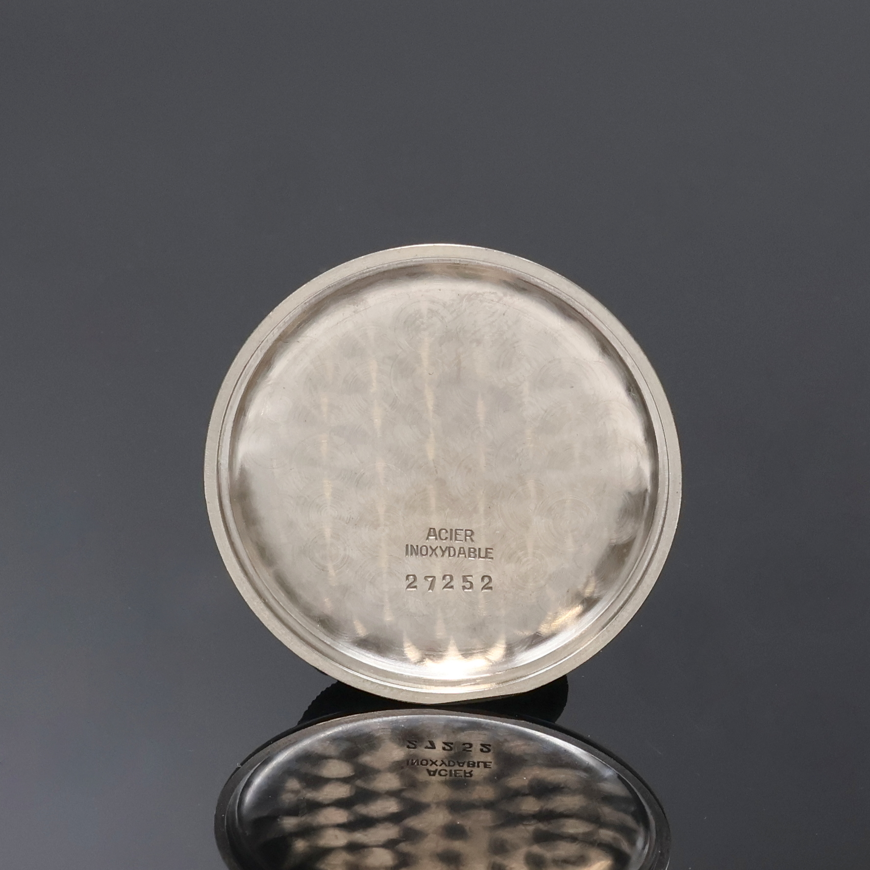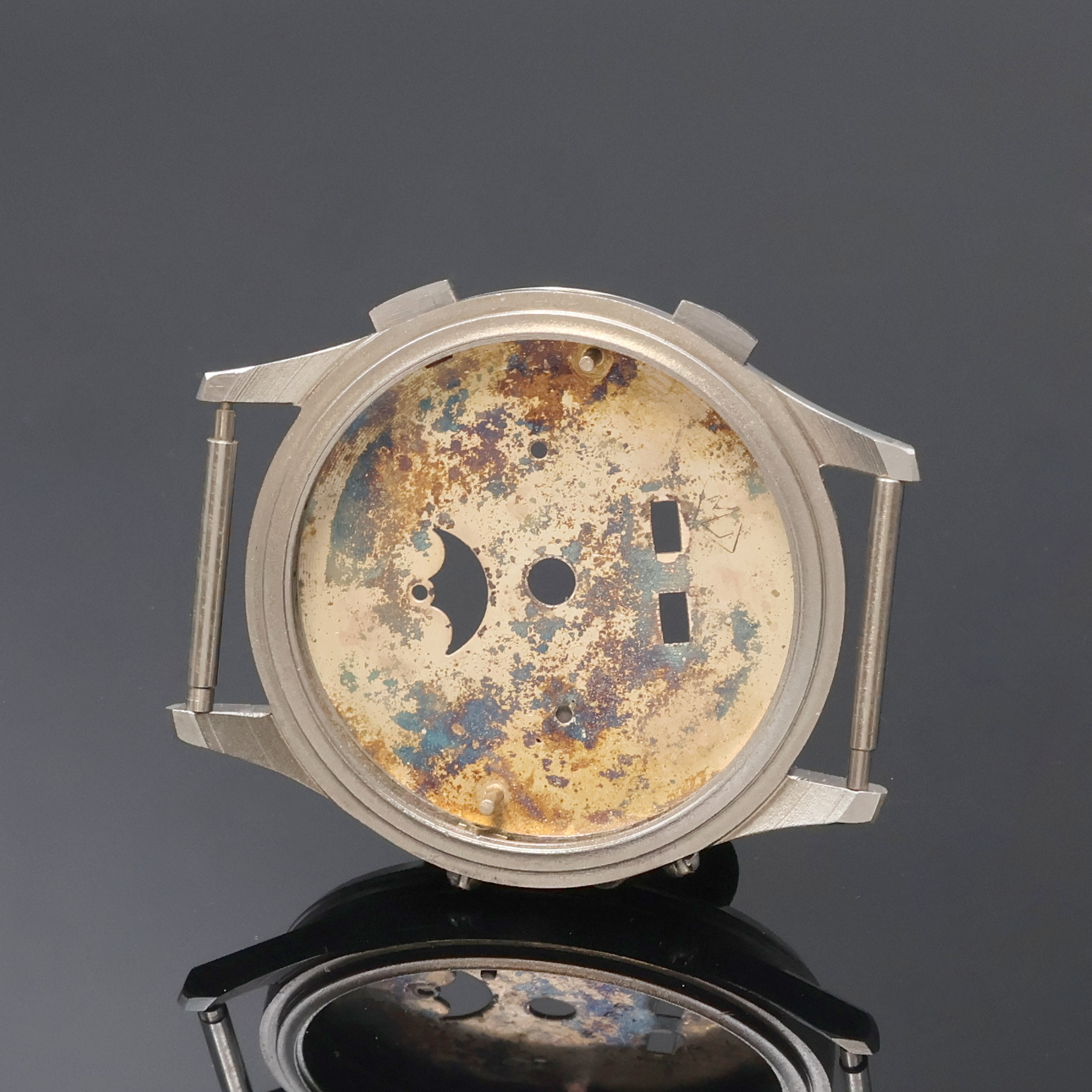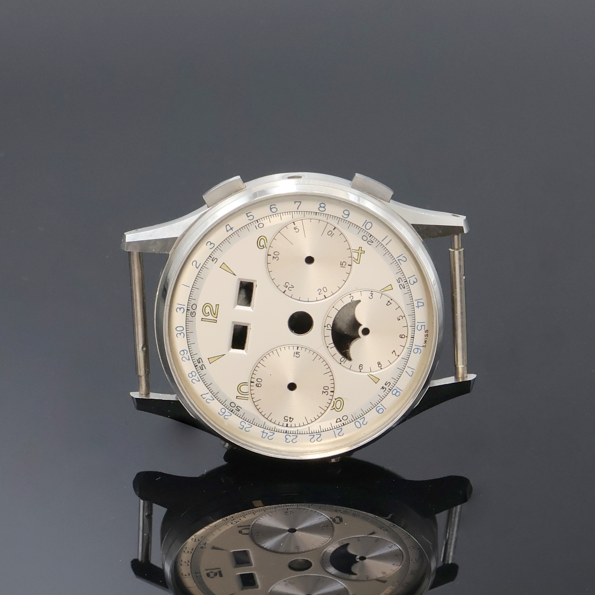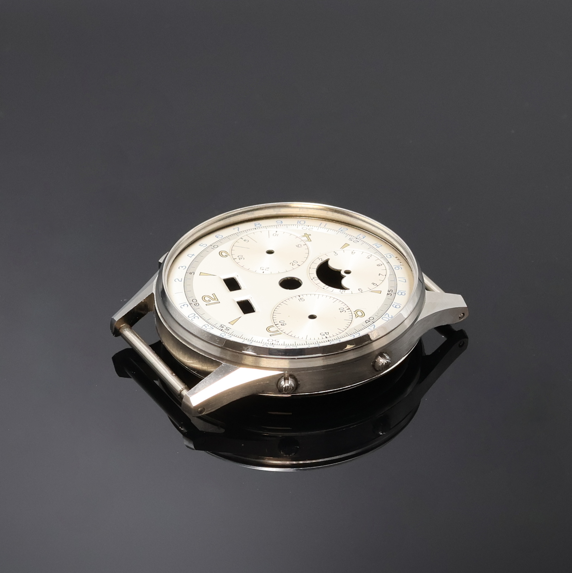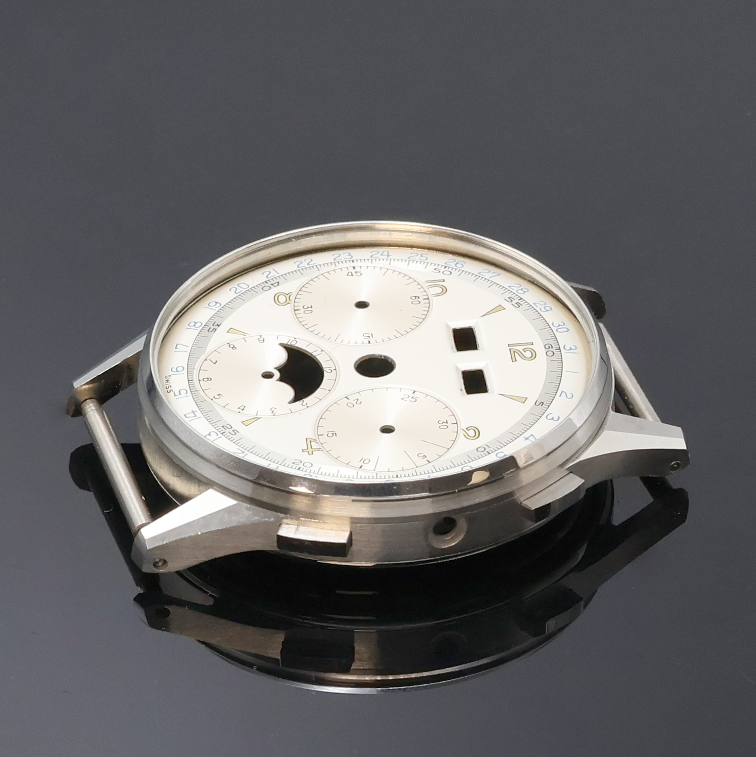 Unsigniertes, nahezu neuwertiges Stahlgehäuse mit Zifferblatt für das Kaliber Valjoux