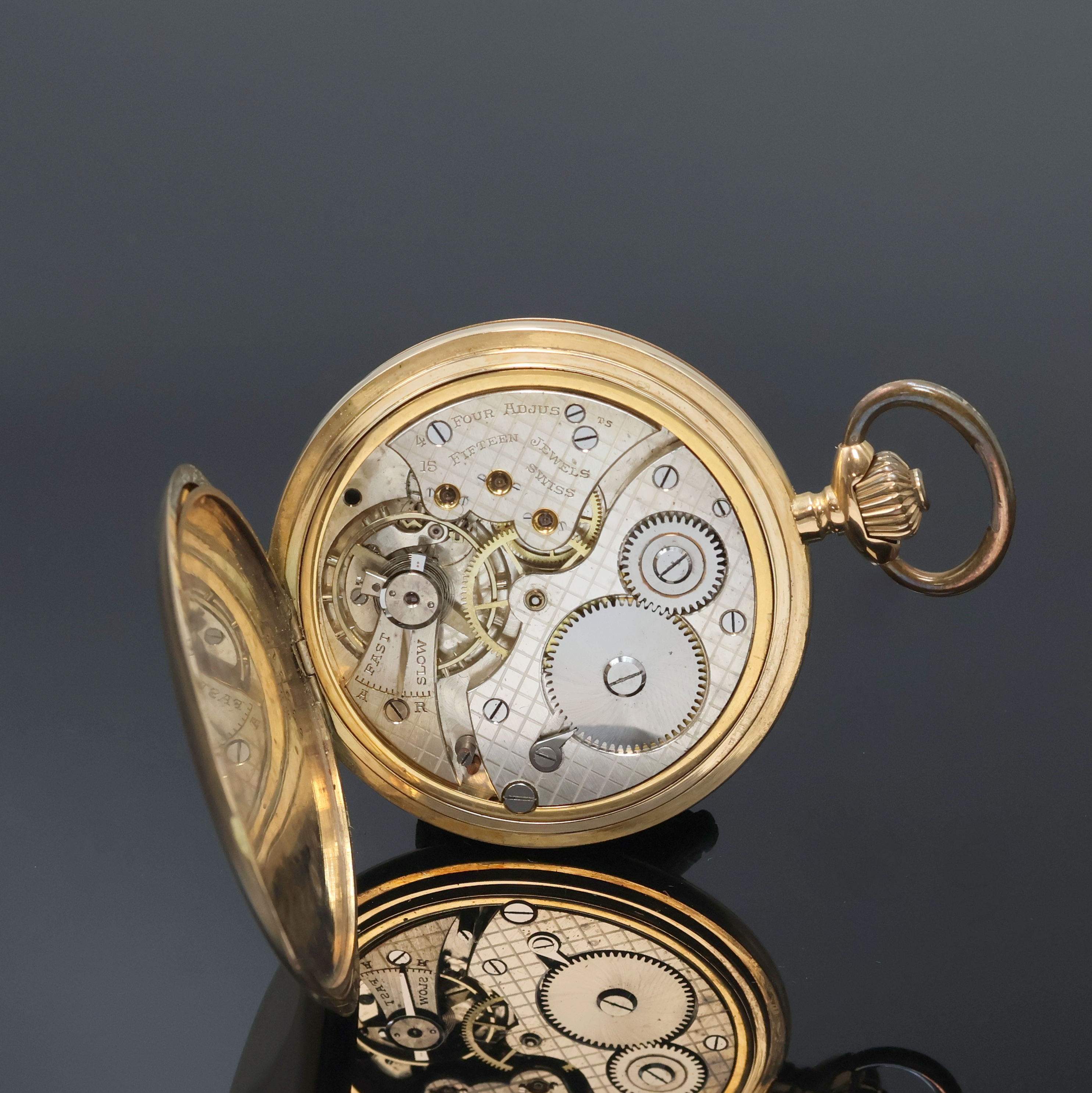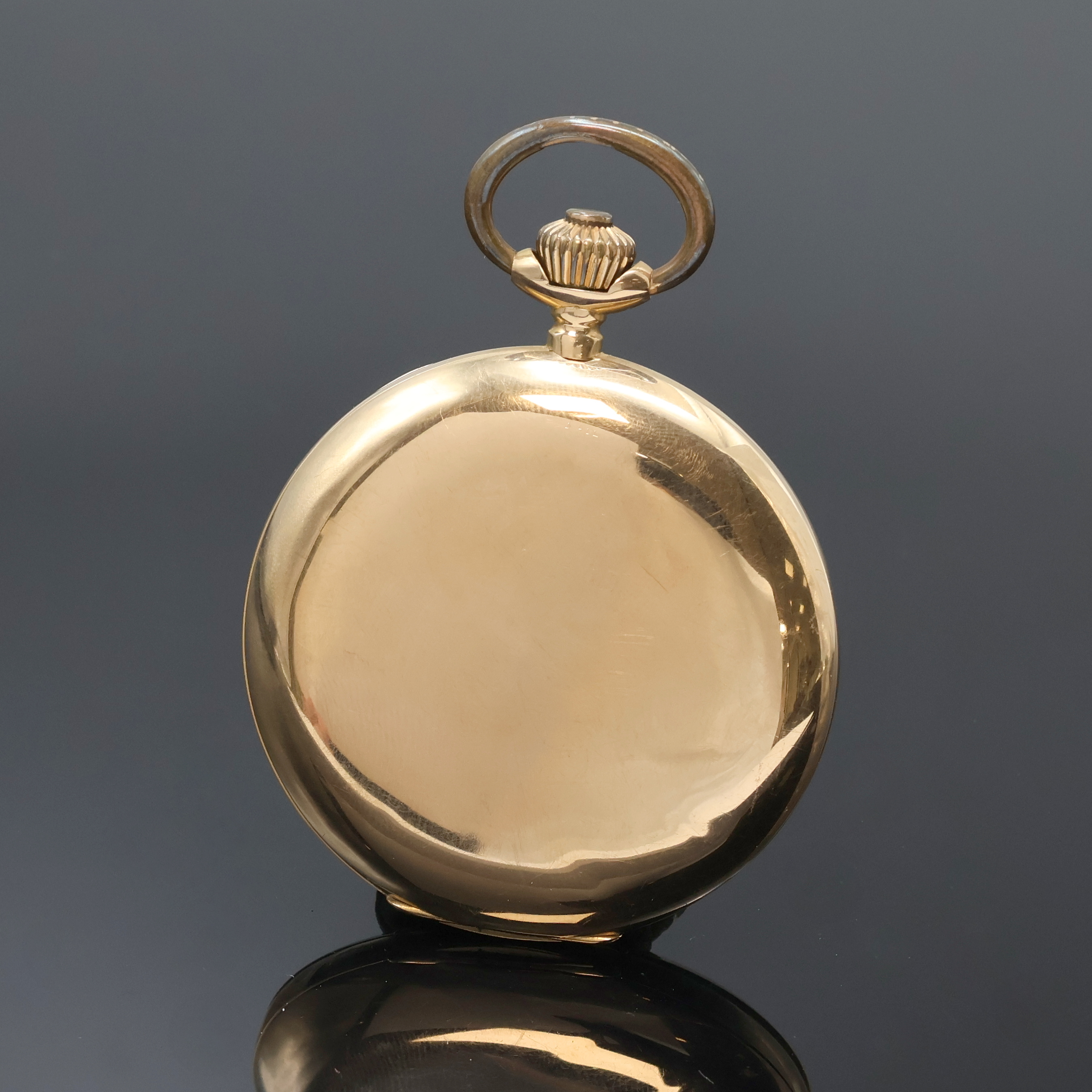 MOVADO Herrensavonette in RoseG 585/000, Schweiz um 1920, glattes Geh. dell., Metallcuvette, Emailzifferbl. riss., röm. Zahlen, gold. Zeiger, kl. Sek. b. 6, vers. Ankerwerk m. Schmuckschliff, 15 St., 4 Adj., Unr. m. Breg.-Spir. u. Anker antimag., 3 verschr. Chatons, D. ca. 51 mm, Gew. ca. 84g, Überh. empf., EZ 2-3, aus Sammlungsauflösung
