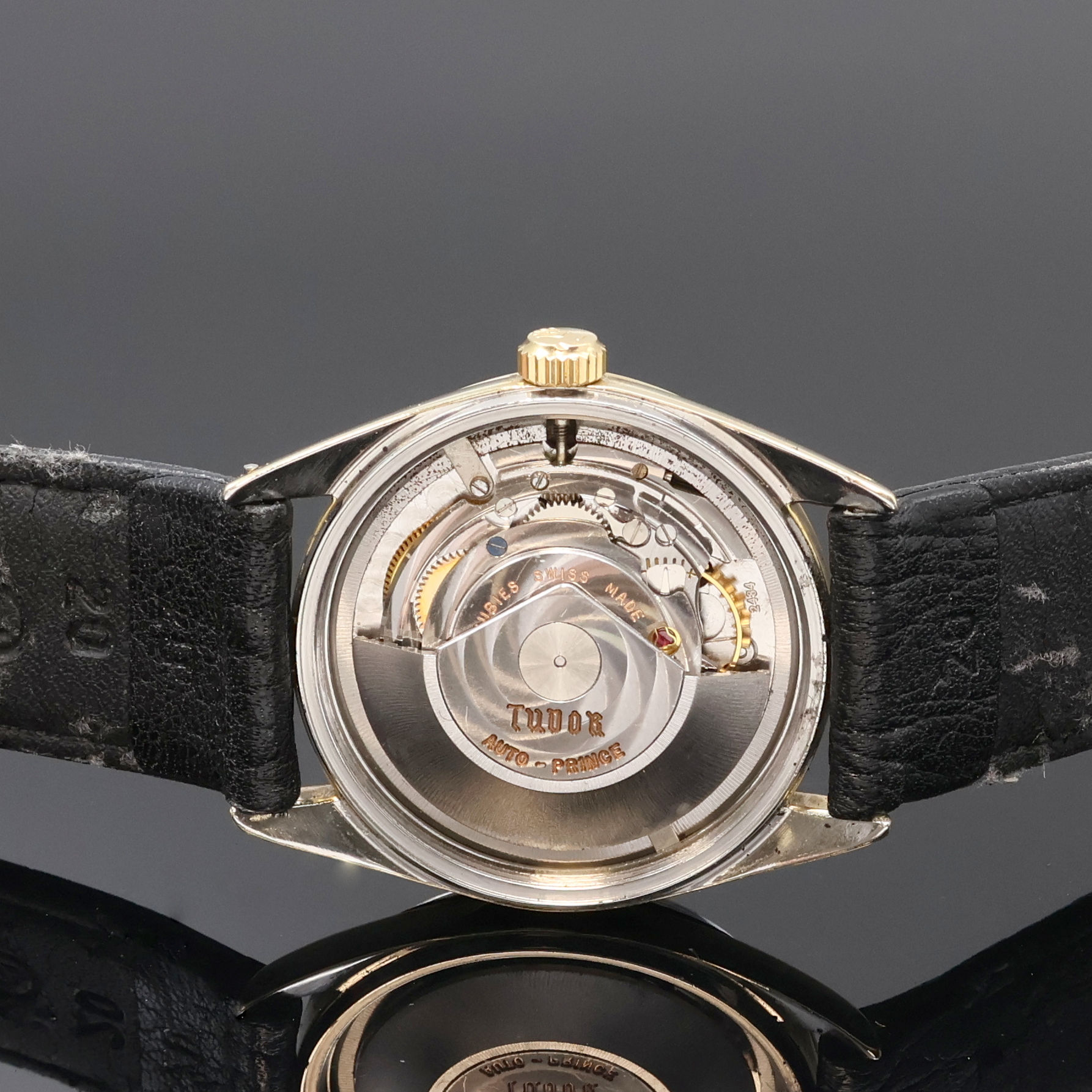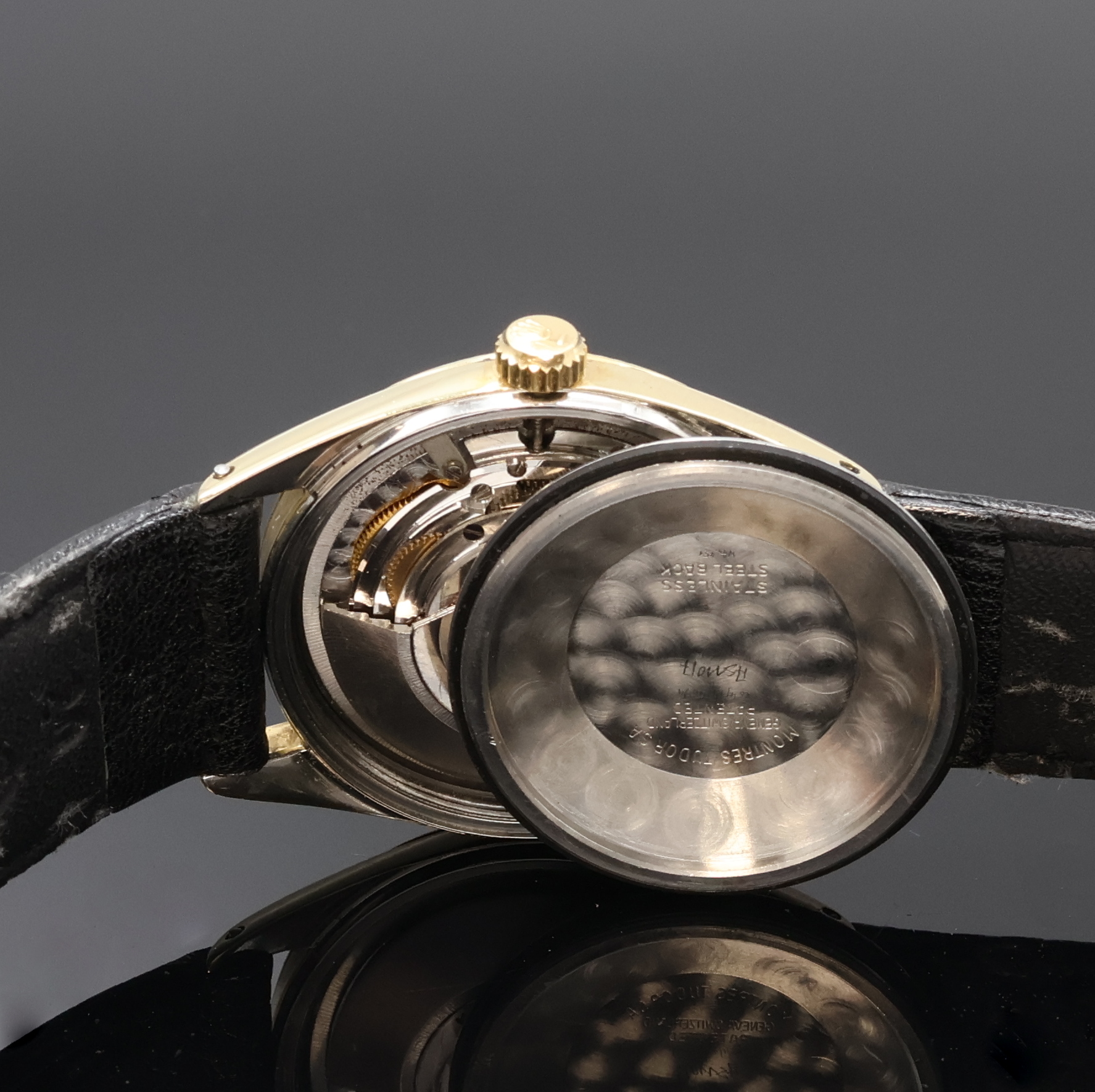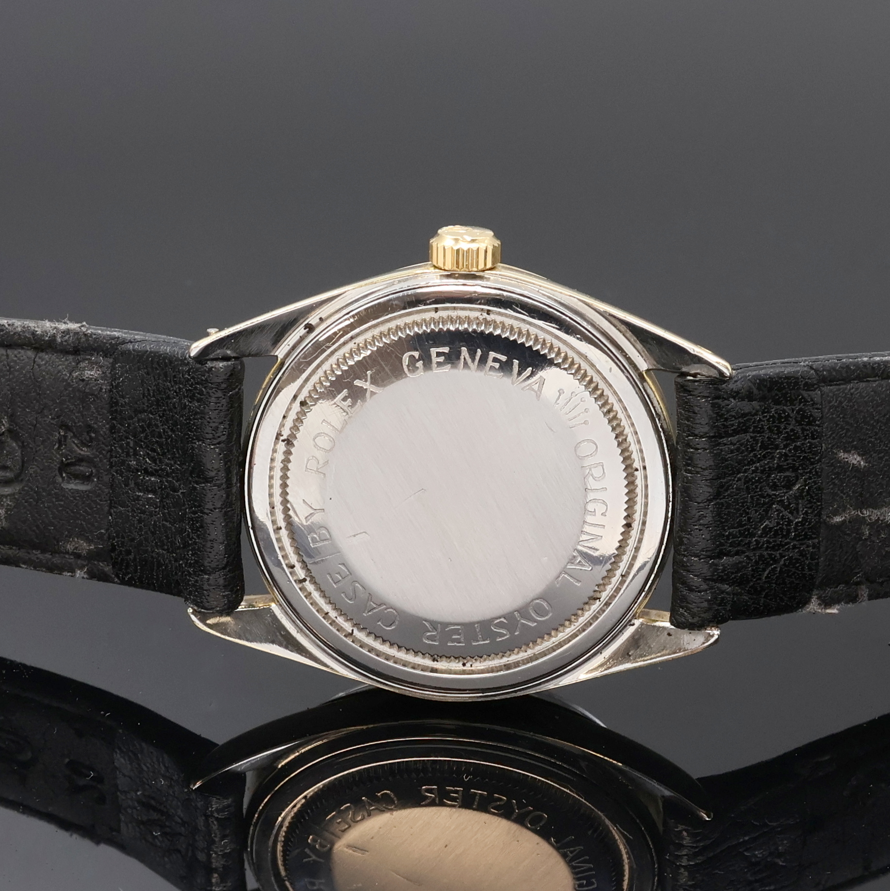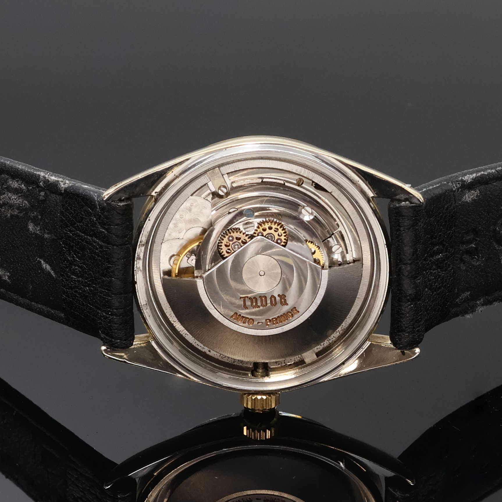 case back and winding crown screwed down, well preserved black Rose dial with gilded