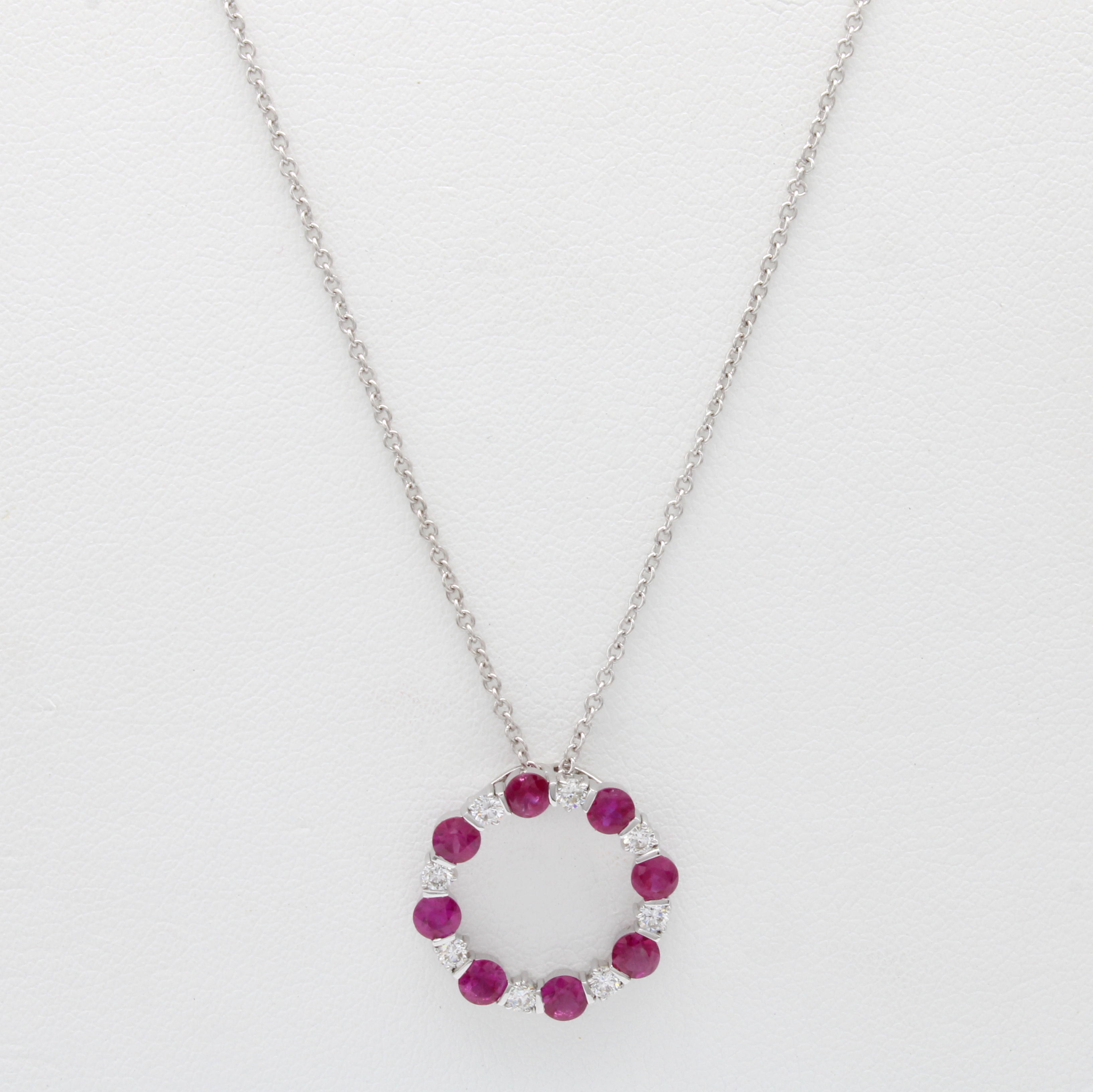Anhänger mit Brillanten und Rubinen an Kette , WG 750/000, 8 Brill. zus. ca. 0.27 ct Weiß/si, 8 Rubine zus. ca. 1.15 ct, in L. ca. 41, 43 u. 45 cm tragbar Schätzpreis: 3130, - EUR