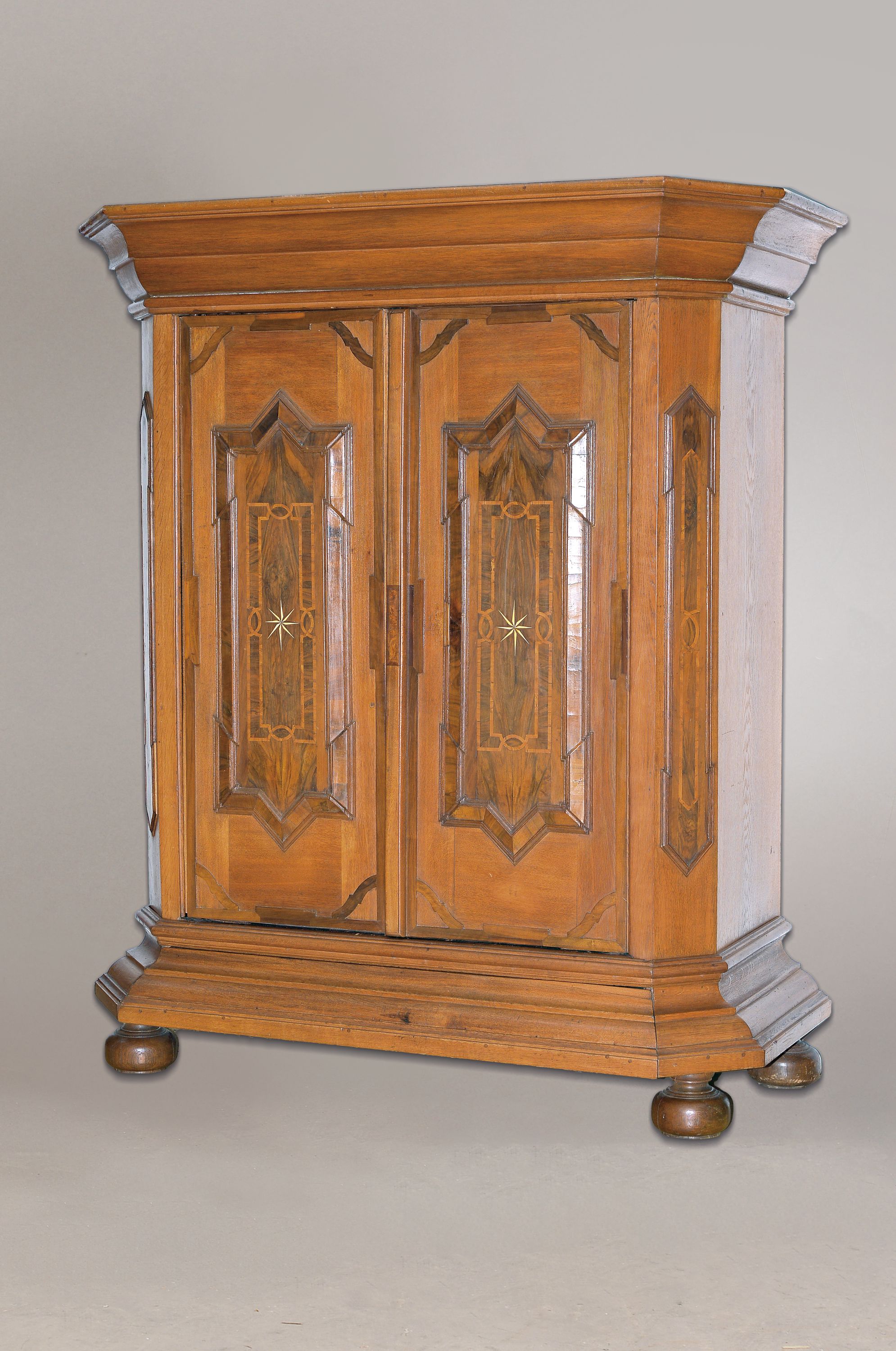Stern und Bandintarsieneinlagen, profilierter Sockel und Gesims, zweitürig mit Bastionsfüllungen