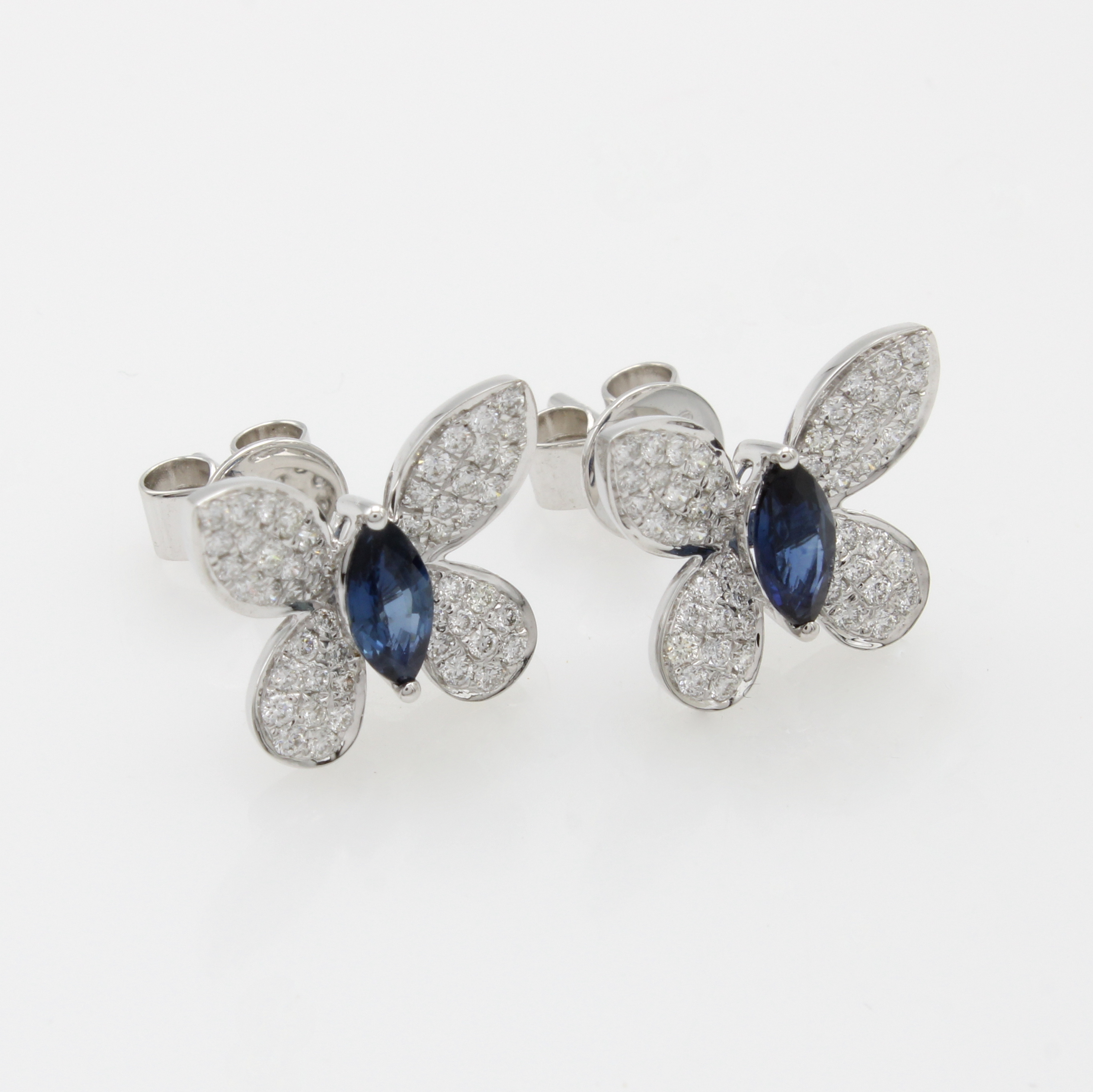 Paar Ohrstecker "Schmetterlinge" mit Saphiren und Brillanten, WG 750/000, 2 Saphirnavettes als Körper zus. ca. 0.56 ct, Flügel bes. m. insges. 104 Brill. zus. ca. 0.41 ct Weiß/si Schätzpreis: 2900, - EUR