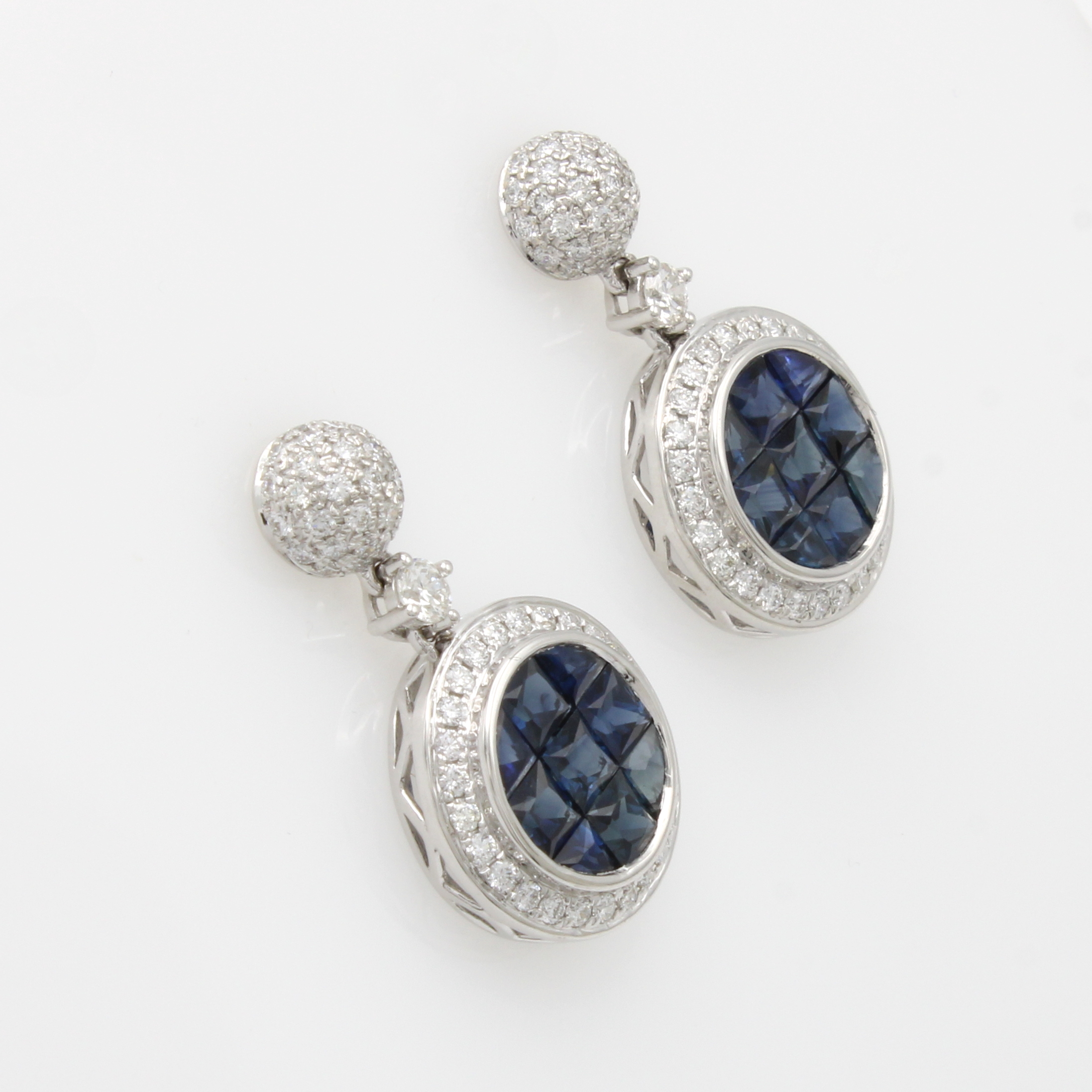 Paar Ohrstecker mit Saphiren und Brillanten, WG 750/000, runde Elemente bes. m. insges. 116 Brill. zus. ca. 0.94 ct Weiß/si, fac., Saphire zus. ca. 3.03 ct Schätzpreis: 7900, - EUR