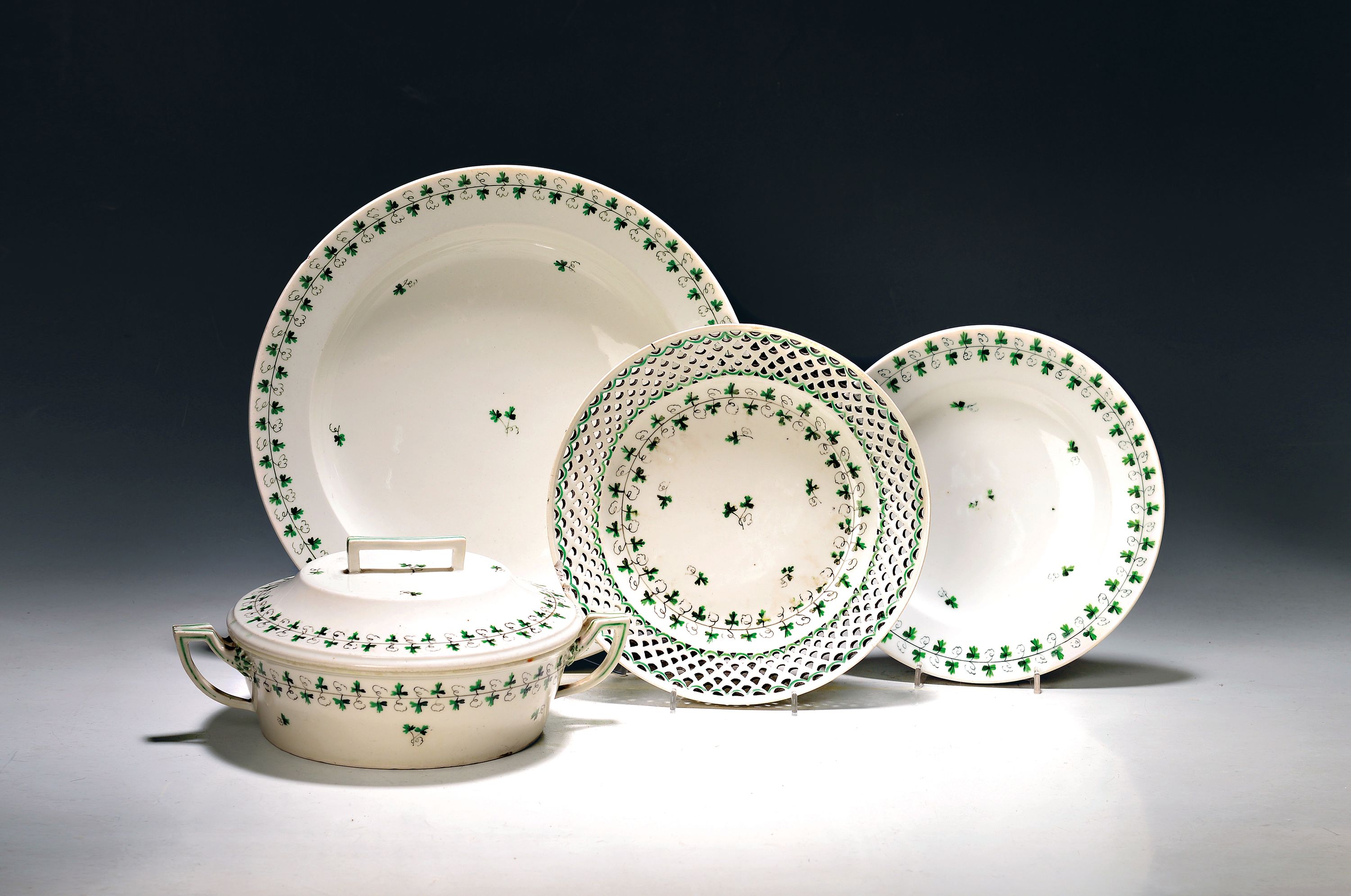 8 Serviceteile, Wien, 18. Jh., Petersiliendekor, Deckelschüssel, zwei Teller rest.,