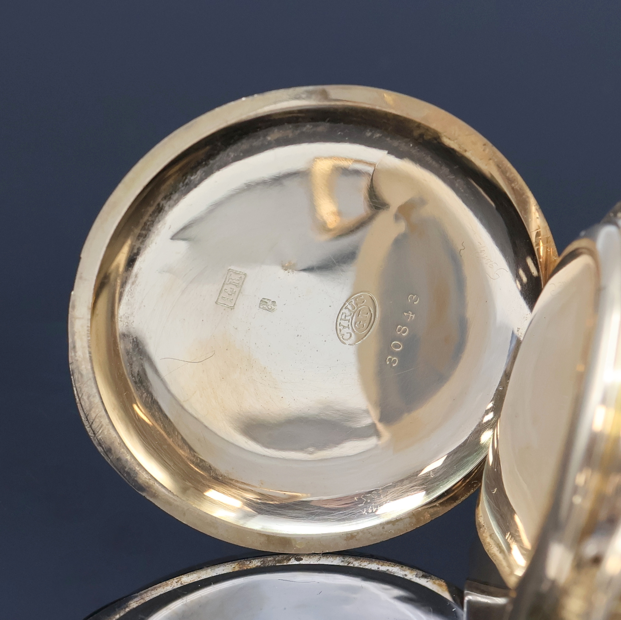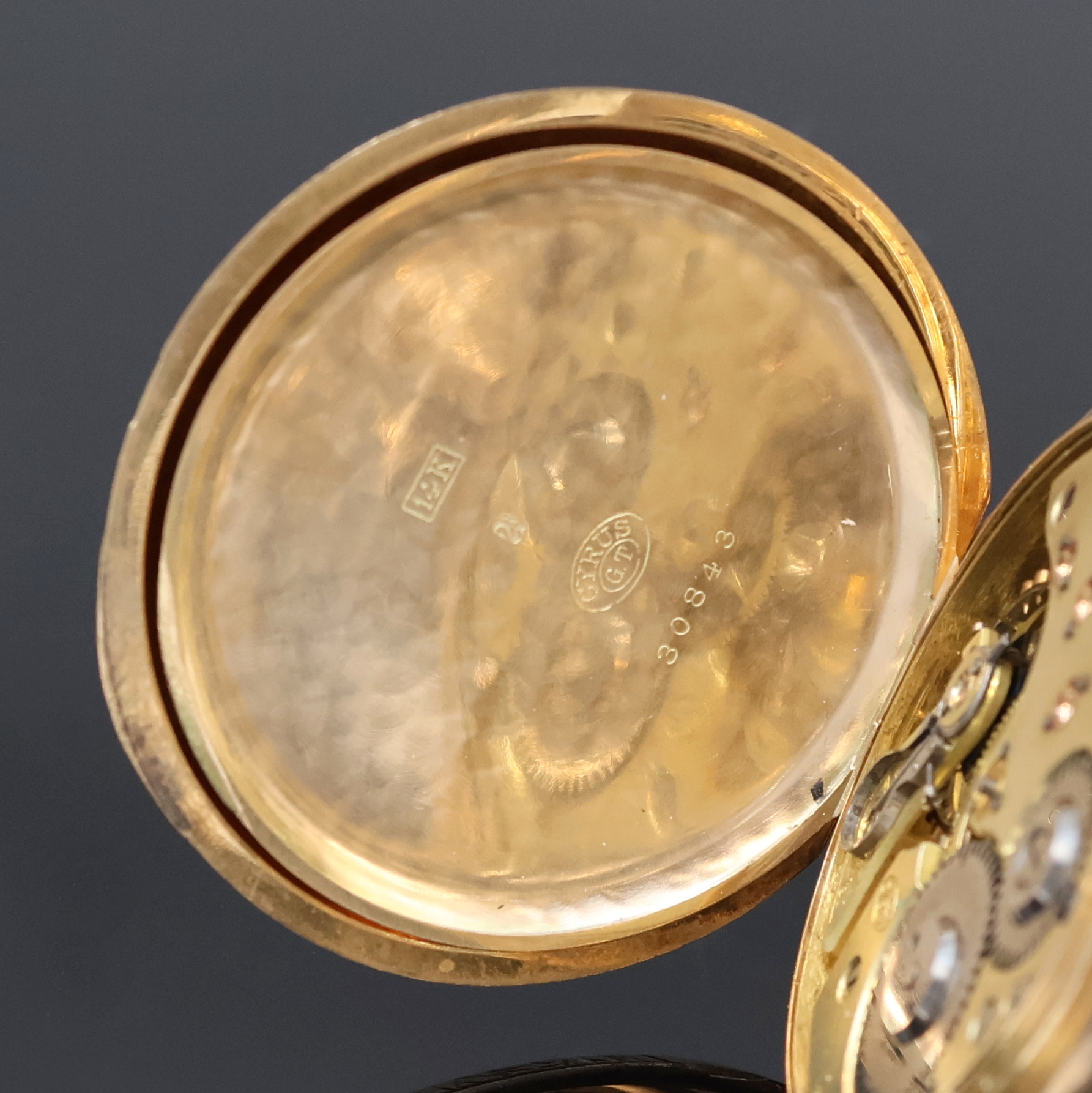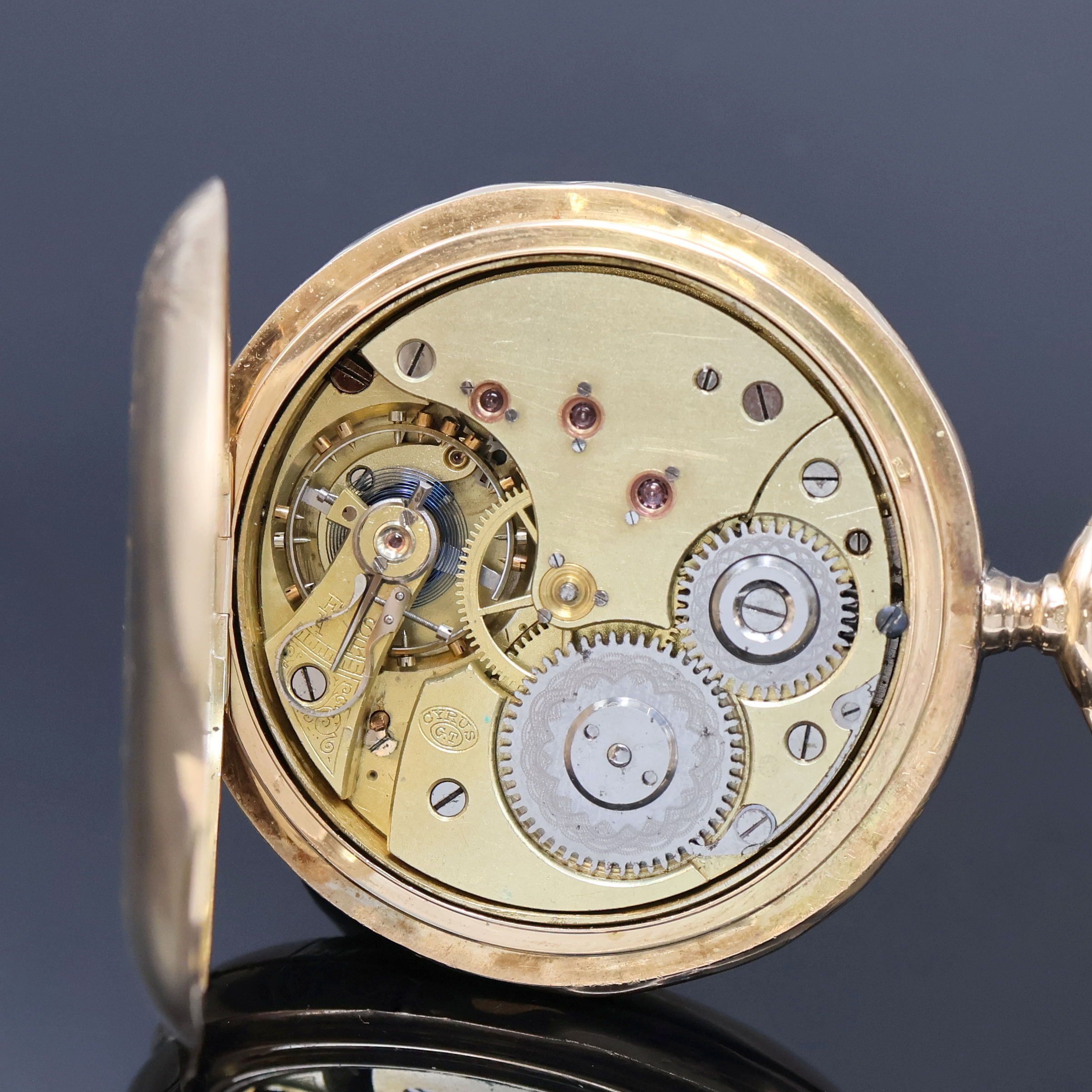 CYRUS Herrensavonette in GG 585/000, Schweiz um 1890, glattes, floral grav. 3-Deckel- Goldgeh. dell., Emailzifferbl. riss., Zeiger später, verg. Werk, 15 St., 3 verschr. Chatons, Komp.-Unruh m. Breg.-Spir., Feinreg., D. ca. 53 mm, Gew. ca. 103 g, Überh. empf., EZ 3, aus Sammlungsauflösung