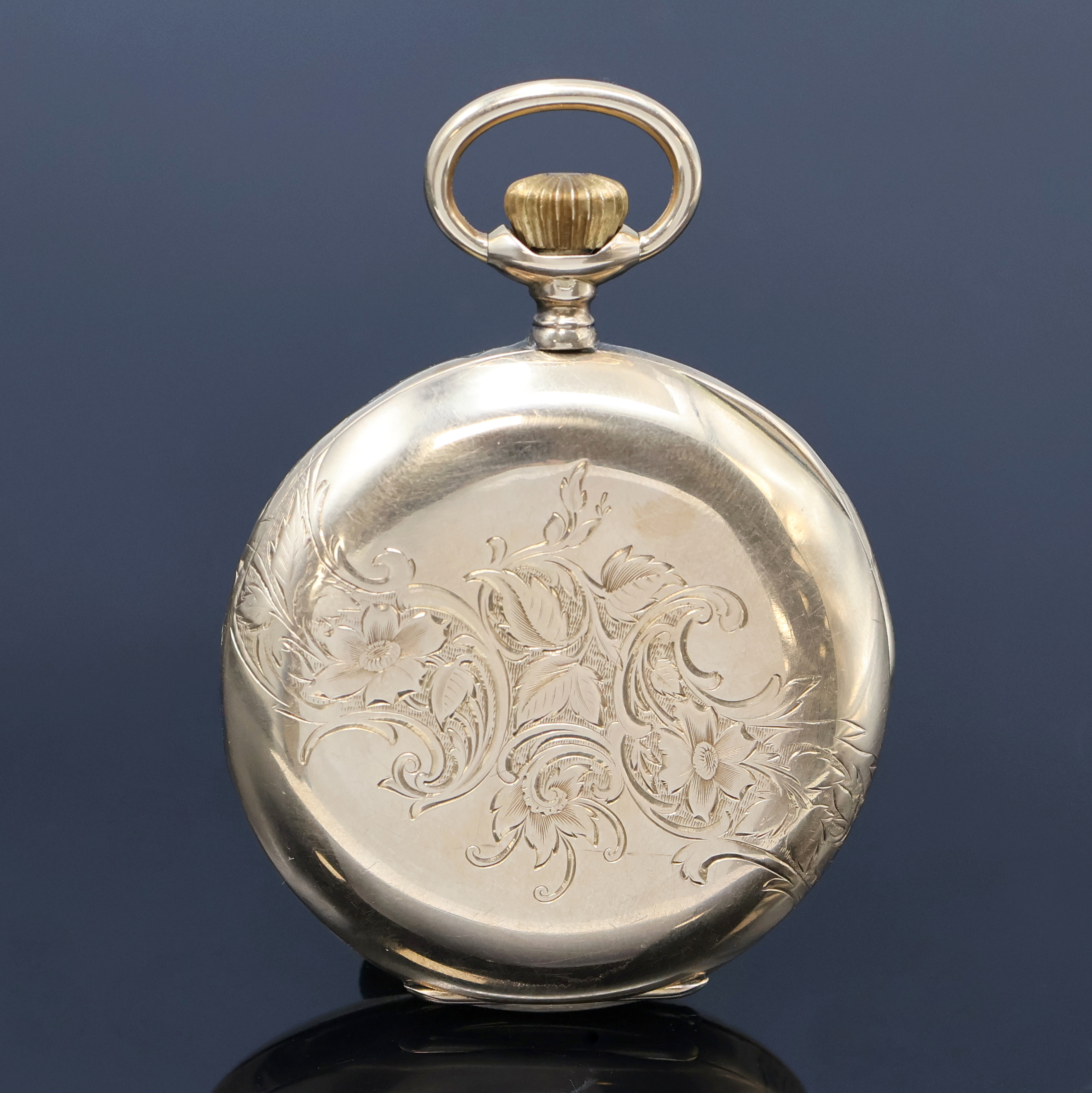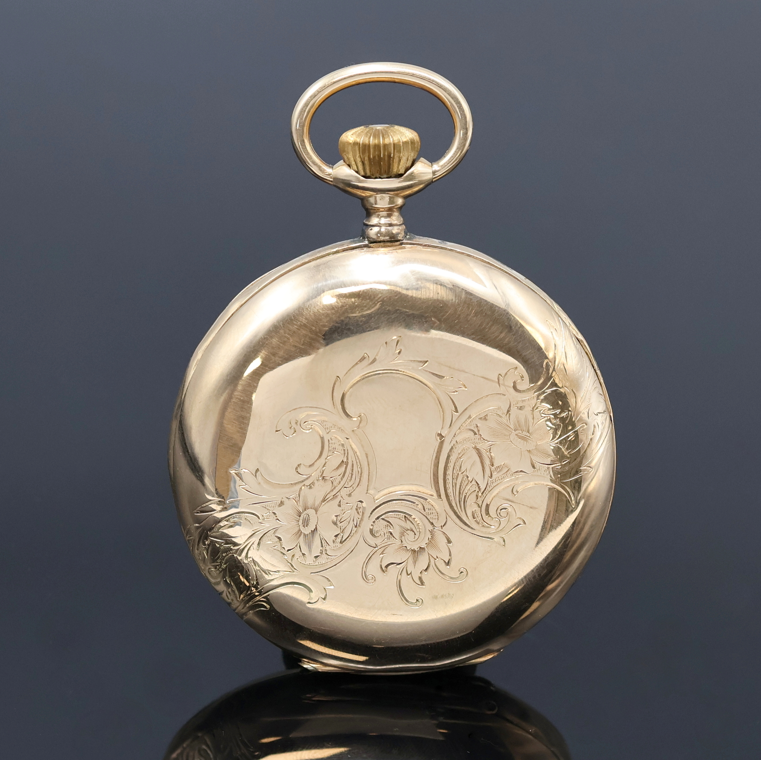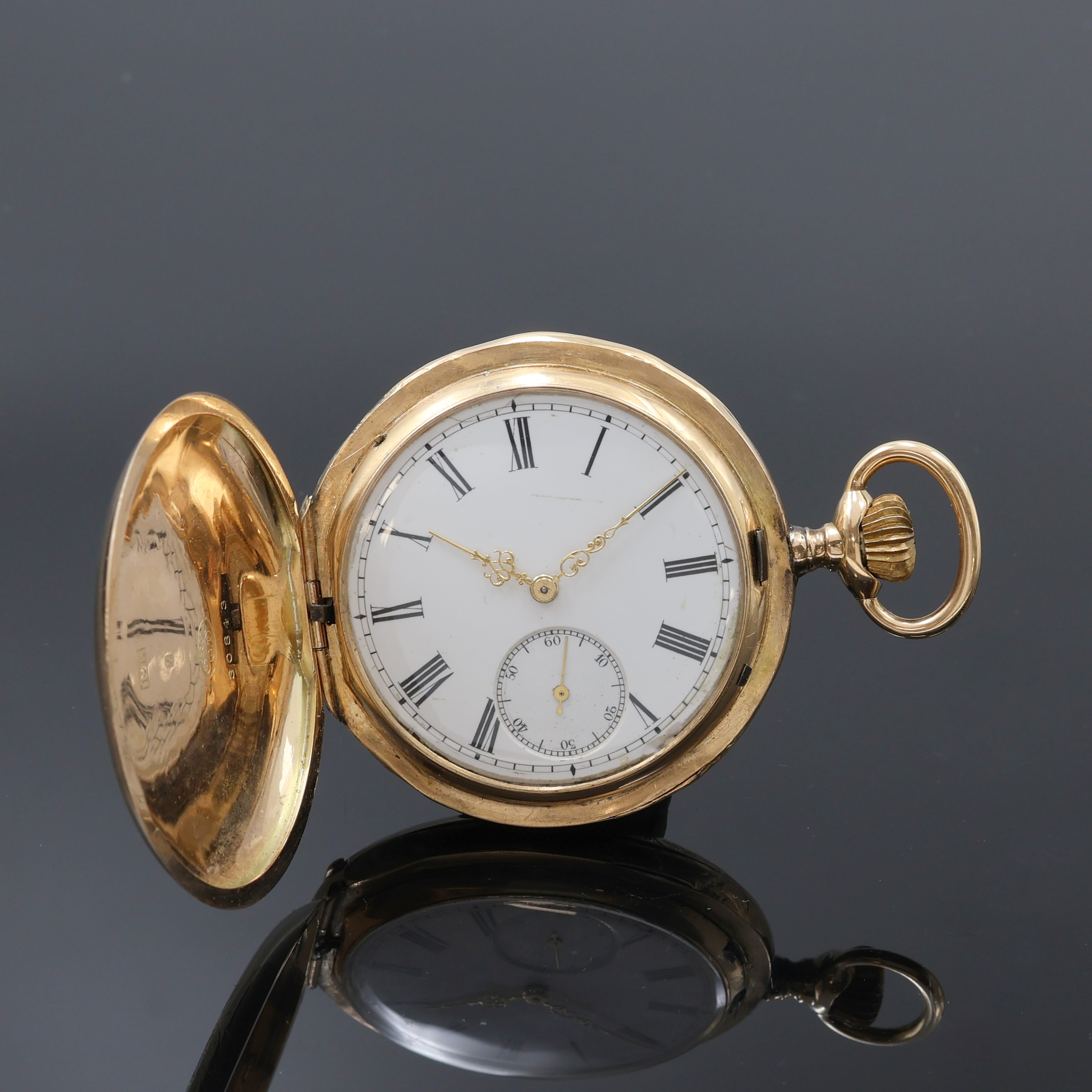 CYRUS Herrensavonette in GG 585/000, Schweiz um 1890, glattes, floral grav. 3-Deckel- Goldgeh. dell., Emailzifferbl. riss., Zeiger später, verg. Werk, 15 St., 3 verschr. Chatons, Komp.-Unruh m. Breg.-Spir., Feinreg., D. ca. 53 mm, Gew. ca. 103 g, Überh. empf., EZ 3, aus Sammlungsauflösung