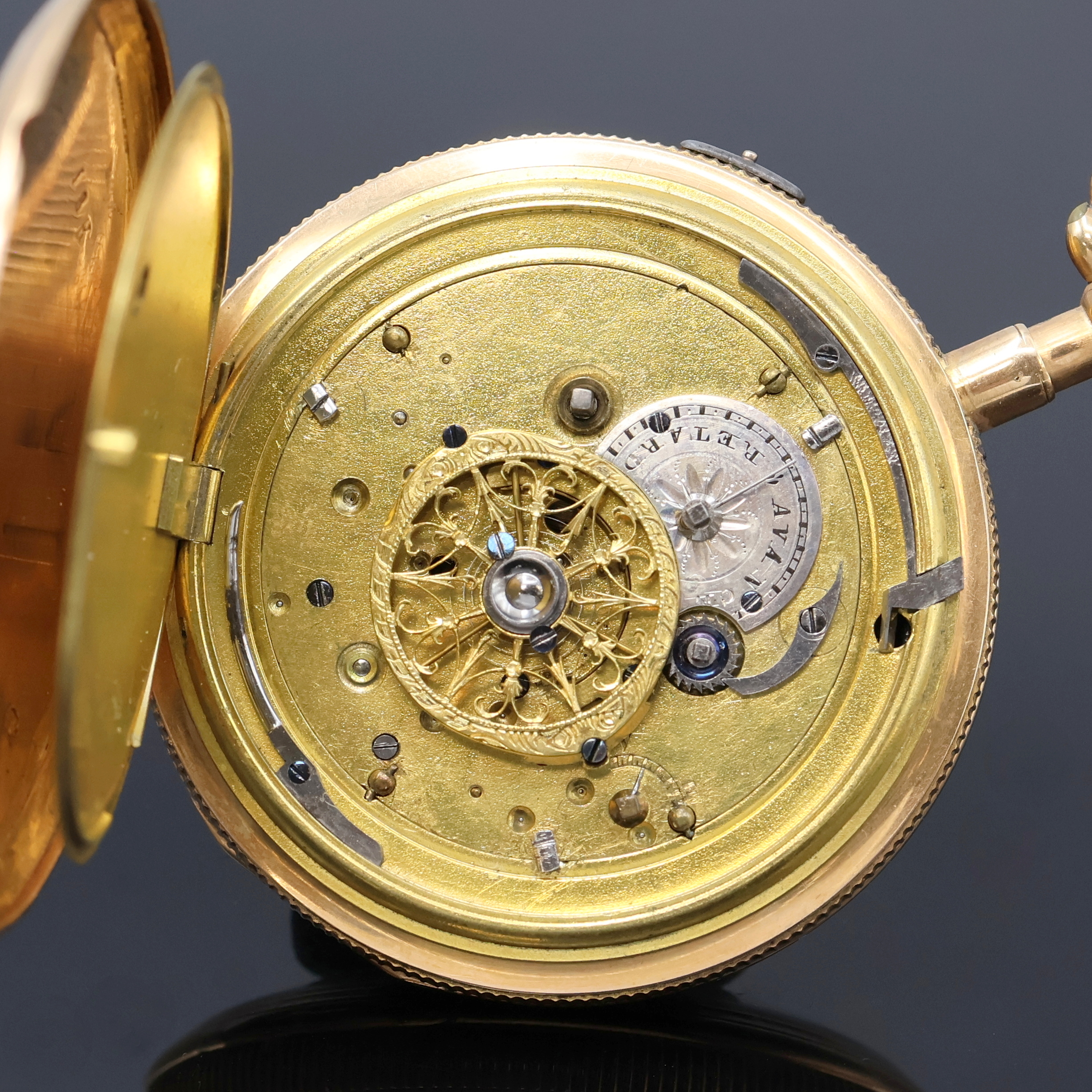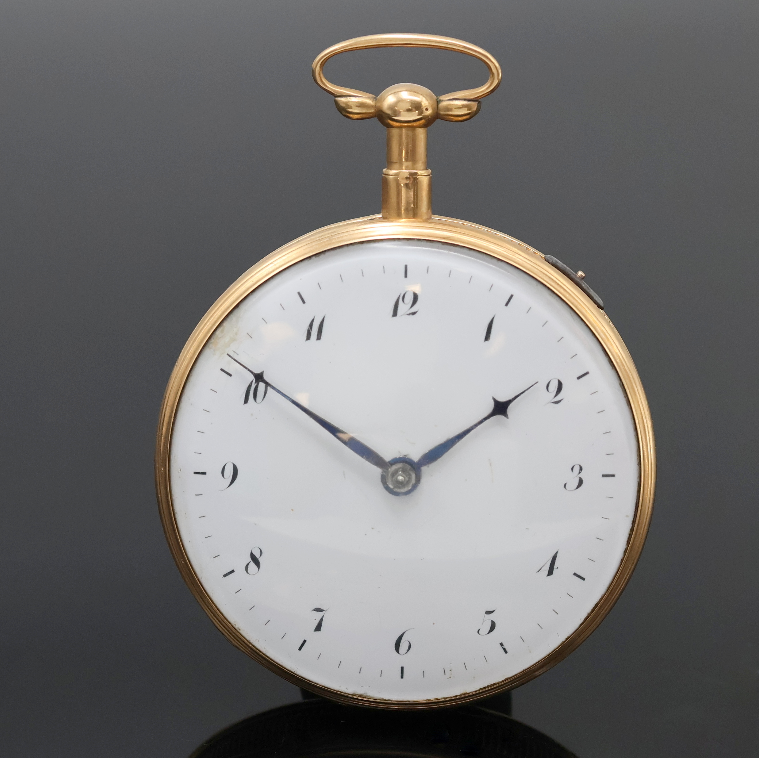 Spindeltaschenuhr mit 1/4 Stunden-Repetition als Carillon in RG 750/000, Schweiz um 1820, Schlüsselaufzug, guill. Geh. m. geripptem Rand, Schlagwerk-Auslösung über Pendant, Emailzifferbl. besch., gebl. orig. Zeiger, verg. Cuvette als Sprungdeckel, verg. Werk m. Kette/Schnecke, durchbr. u. grav. Unruhbrücke, Schlag auf 3 Tonfedern, D. ca. 55 mm, Gew. ca. 119g, Kette zu rep., Überh. unerl., EZ 3, aus Sammlungsauflösung