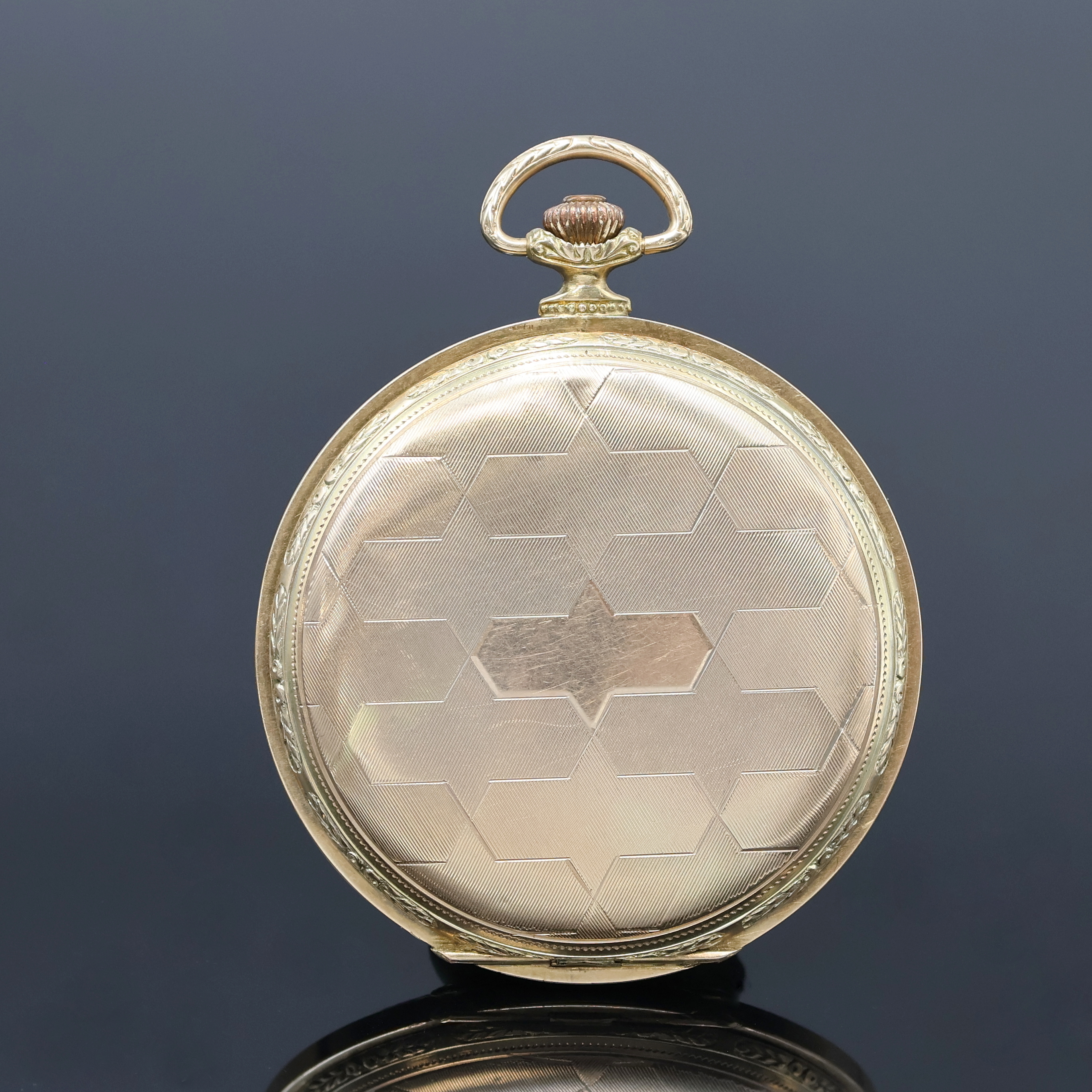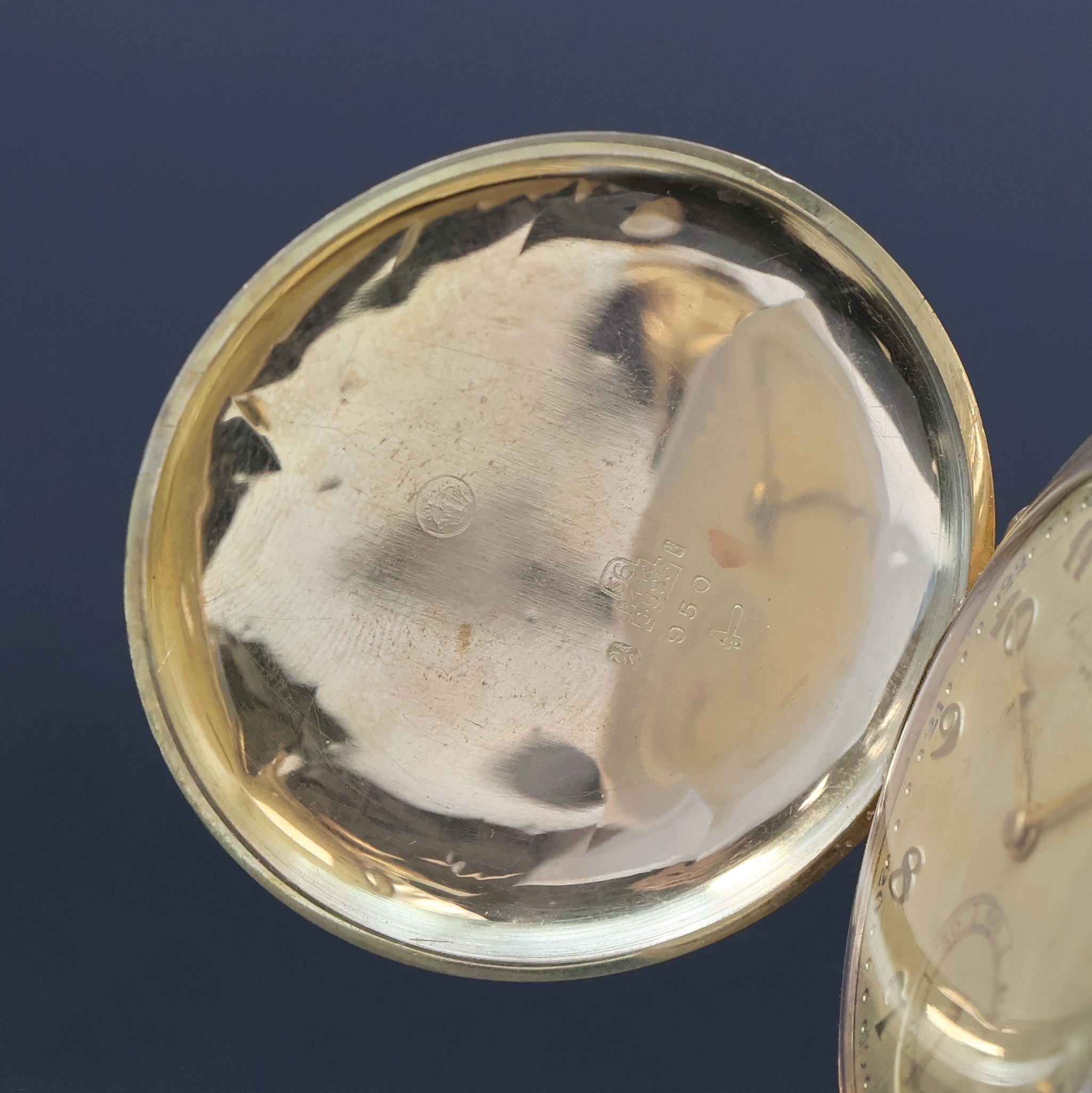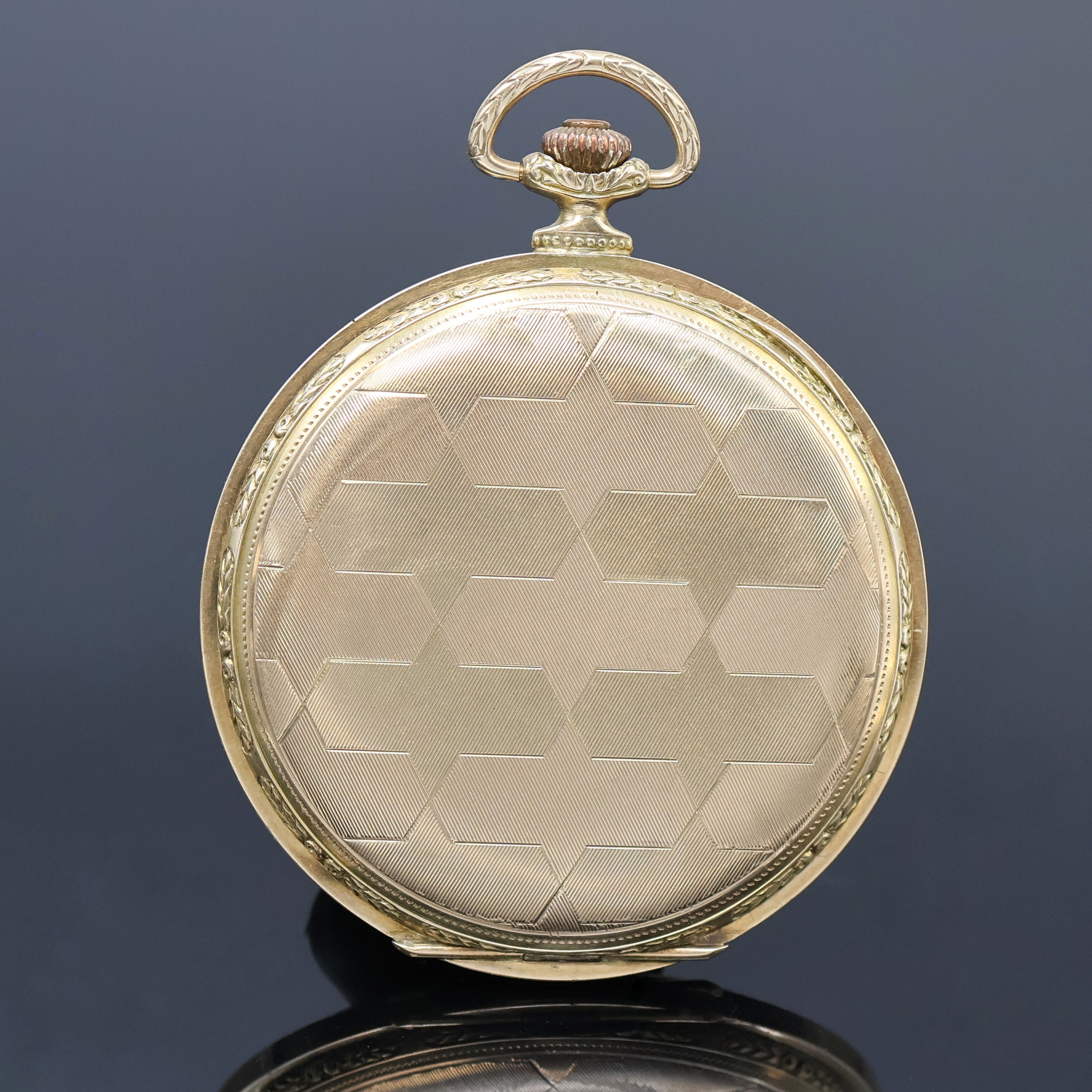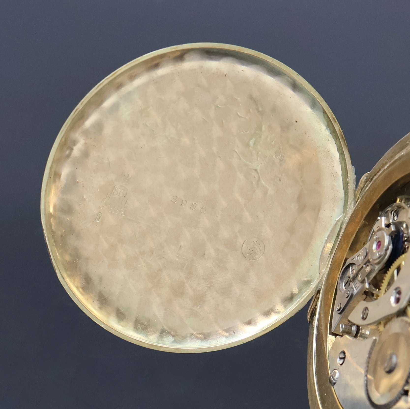 CORGEMONT WATCH hunting cased pocket-watch in 14k yellow gold, Switzerland around 1930, geometrical engine-turned 3-cover-gold case dent/hinge of back cover has to be repaired, cuvette with medals-engraving, gilded dial patinated/rubbed, gilded Breguet-numerals, constant second at 6, gilded hands, nickel plated movement, 16 jewels, screw balance with Breguet-hairspring, precision adjustment, diameter approx. 50 mm, weight approx. 64 g, needs to be overhauled, condition 3, property of a collector