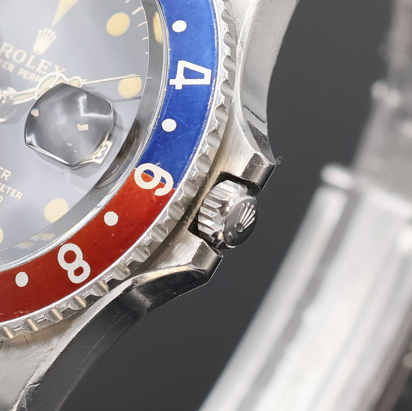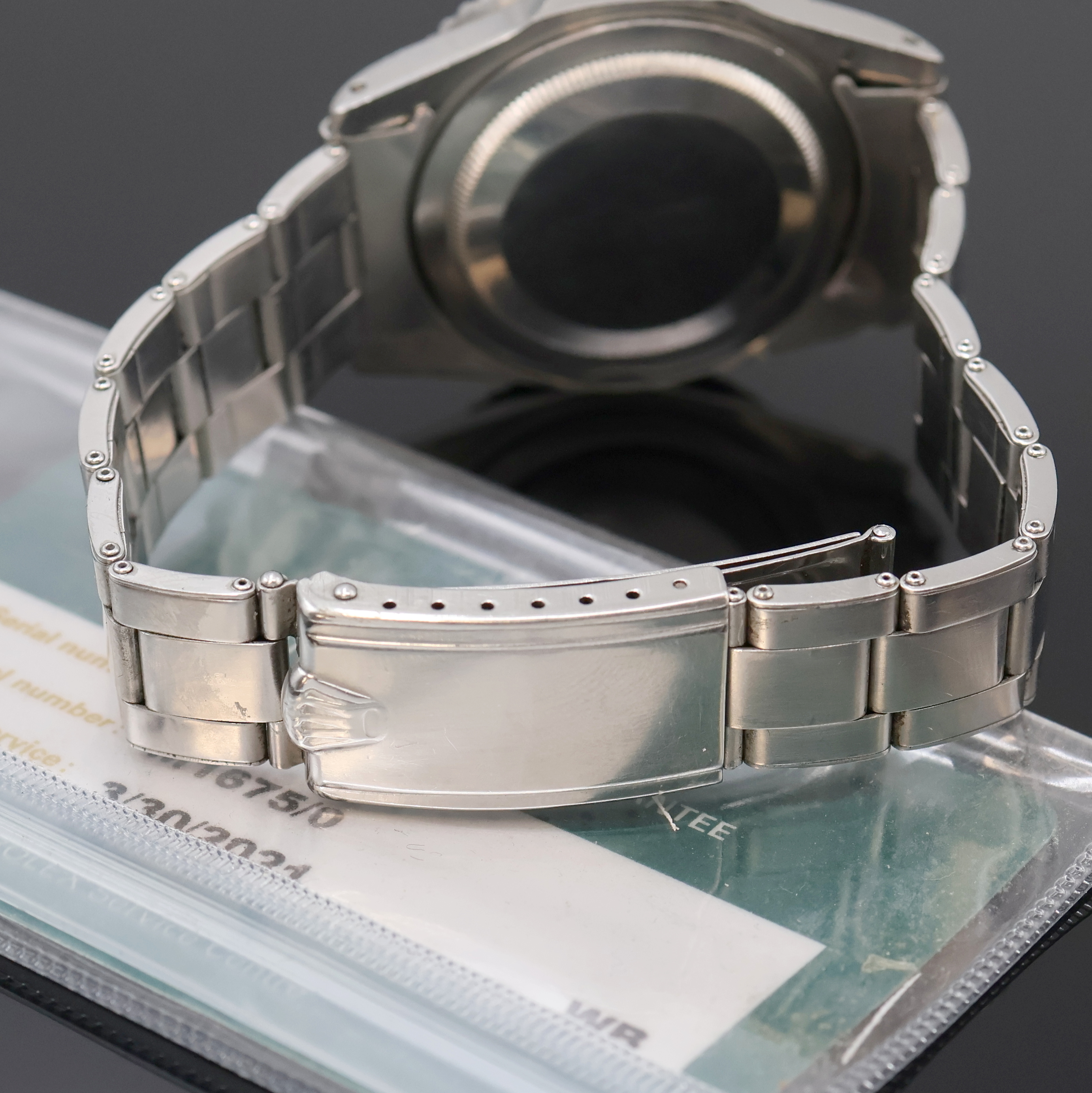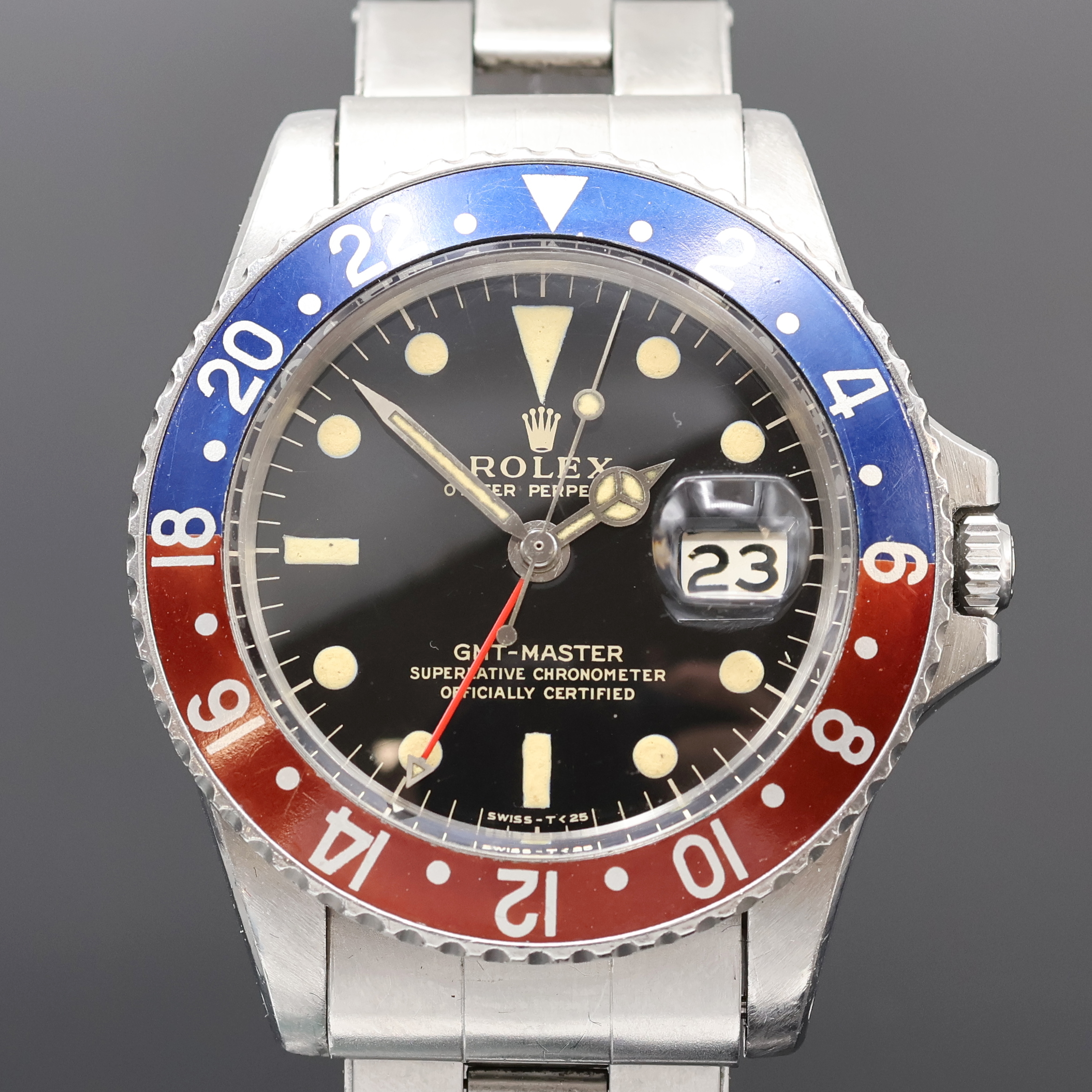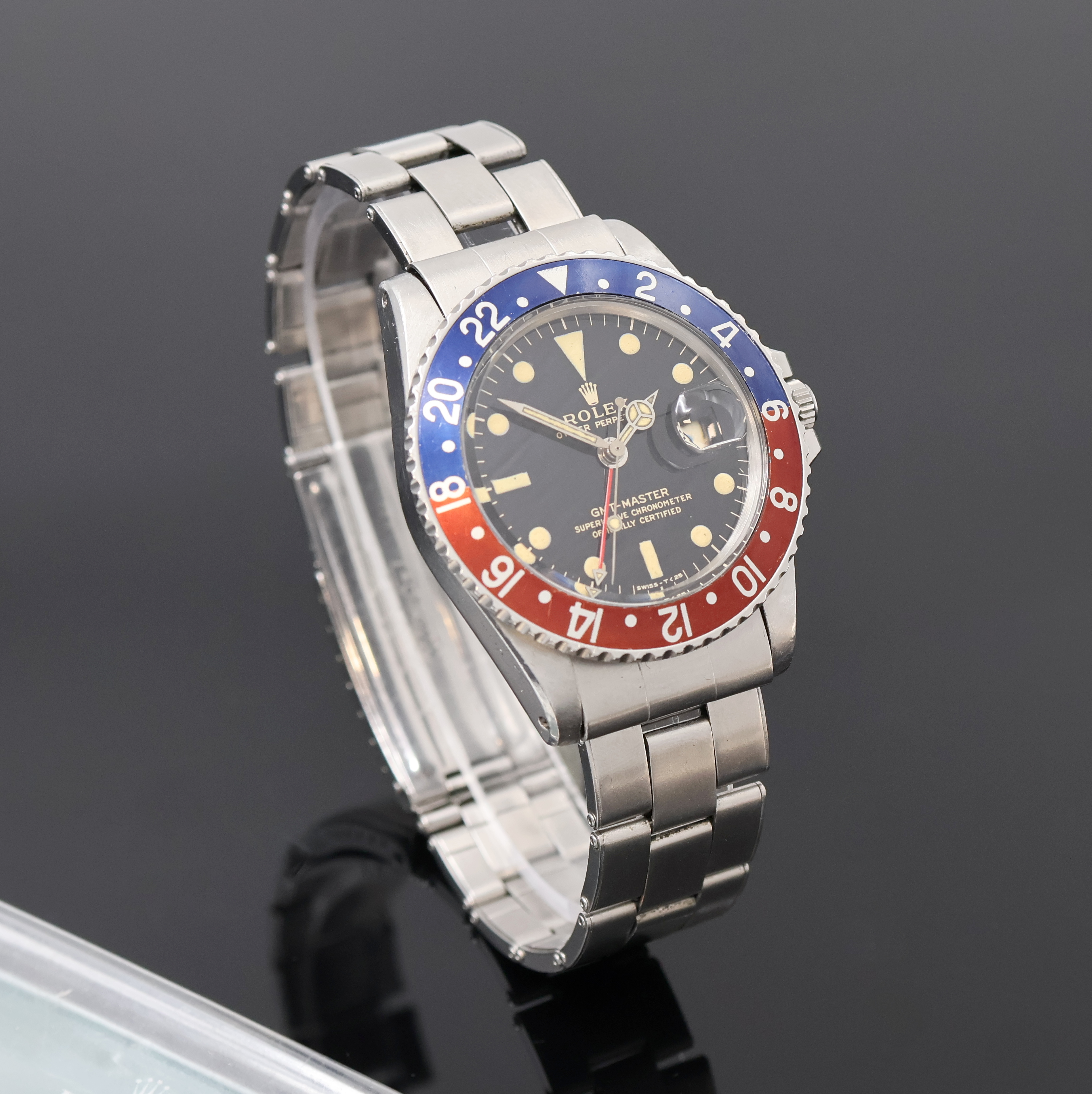 ROLEX GMT-Master Referenz 1675 von 1966 mit fantastischem original Glanzzifferblatt, Automatik, verschr. Oystergeh. im Boden bez. 2. Quartal 1966, beids. drehb. Lünette m. orig. Insert in blau/rot-braun, orig. ROLEX USA Oyster-Zugband von 1/65, schwarz. Glanz- Zifferbl., Leuchtindizes, orig. Leuchtzeiger inkl. kleinem GMT-Zeiger, Datum unter Lupe b. 3, rhod. Werk Kal. 1570, 26 Steine, 5 Adj., ROLEX Service-Garantie v. 2021 anbei, D. ca. 40 mm, L. ca. 21 cm, EZ 2, aus Sammlungsauflösung