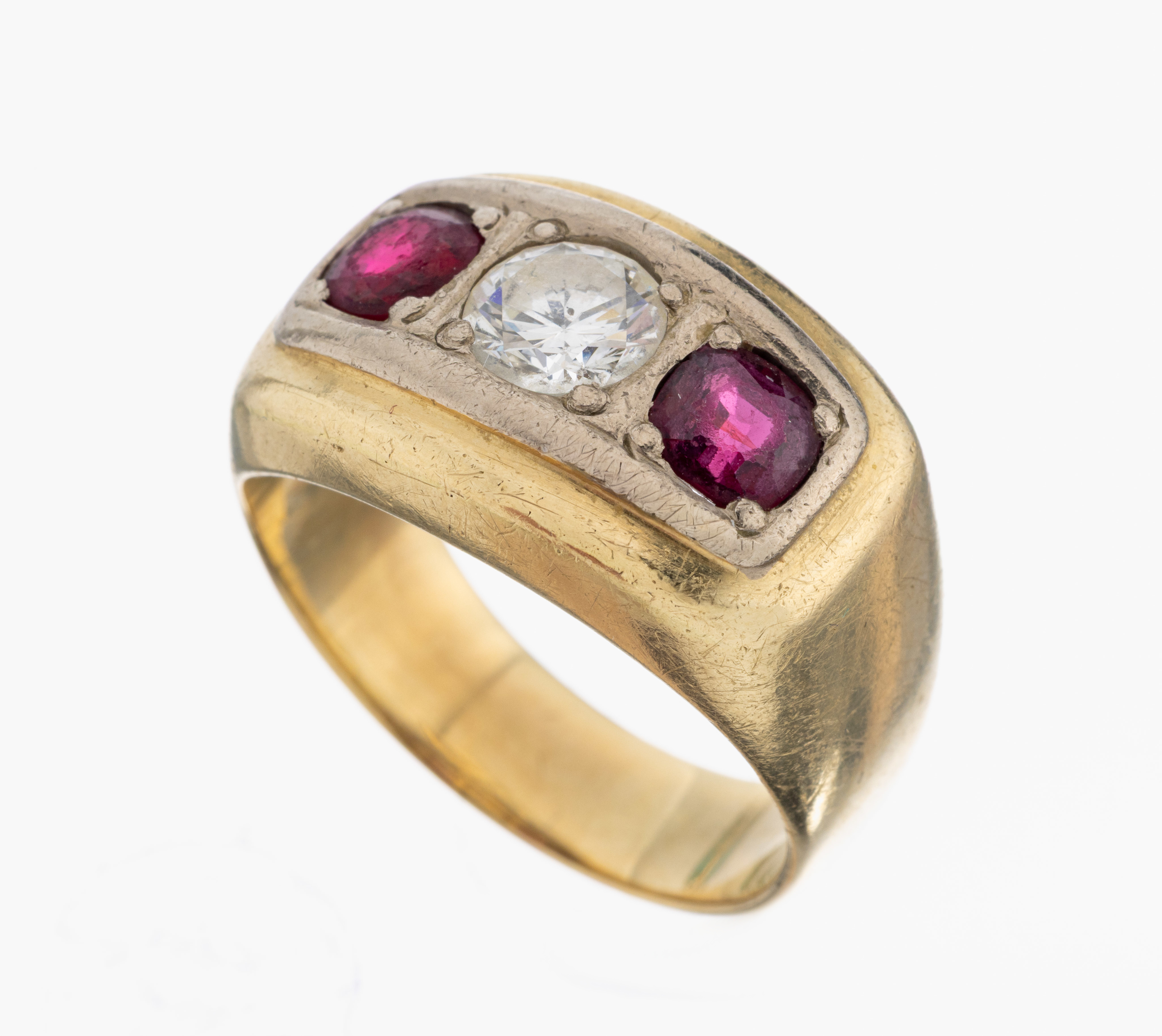 14 kt Gold Brillant-Rubin-Ring, GG/WG 585/000, mittig Brillant ca. 0.72 ct Weiß/p1,