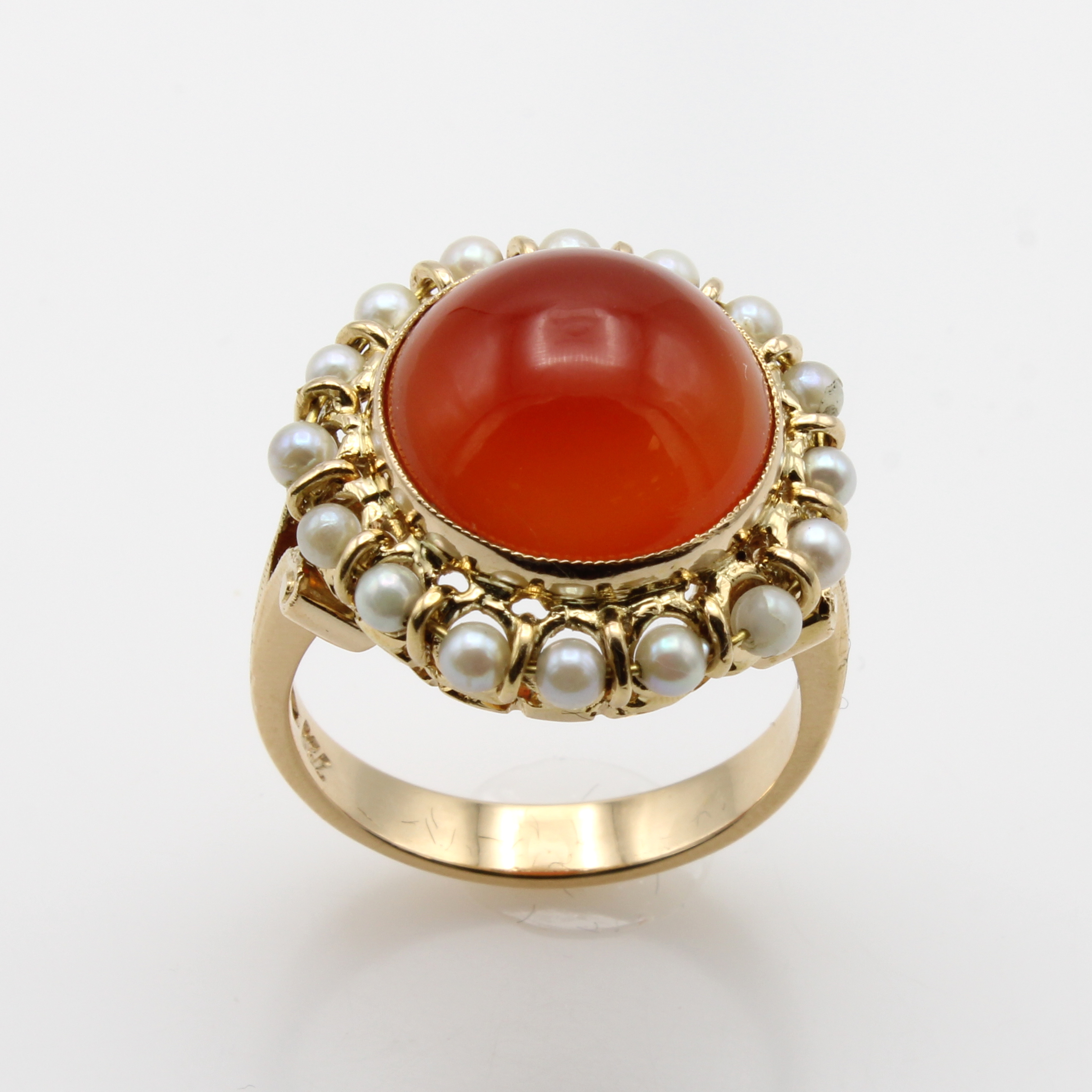Ring mit Karneol und Perlchen, GG 750/000, Karneolcabochon umgeben von Flussperlchen, RW ca. 57 Schätzpreis: 2200, - EUR