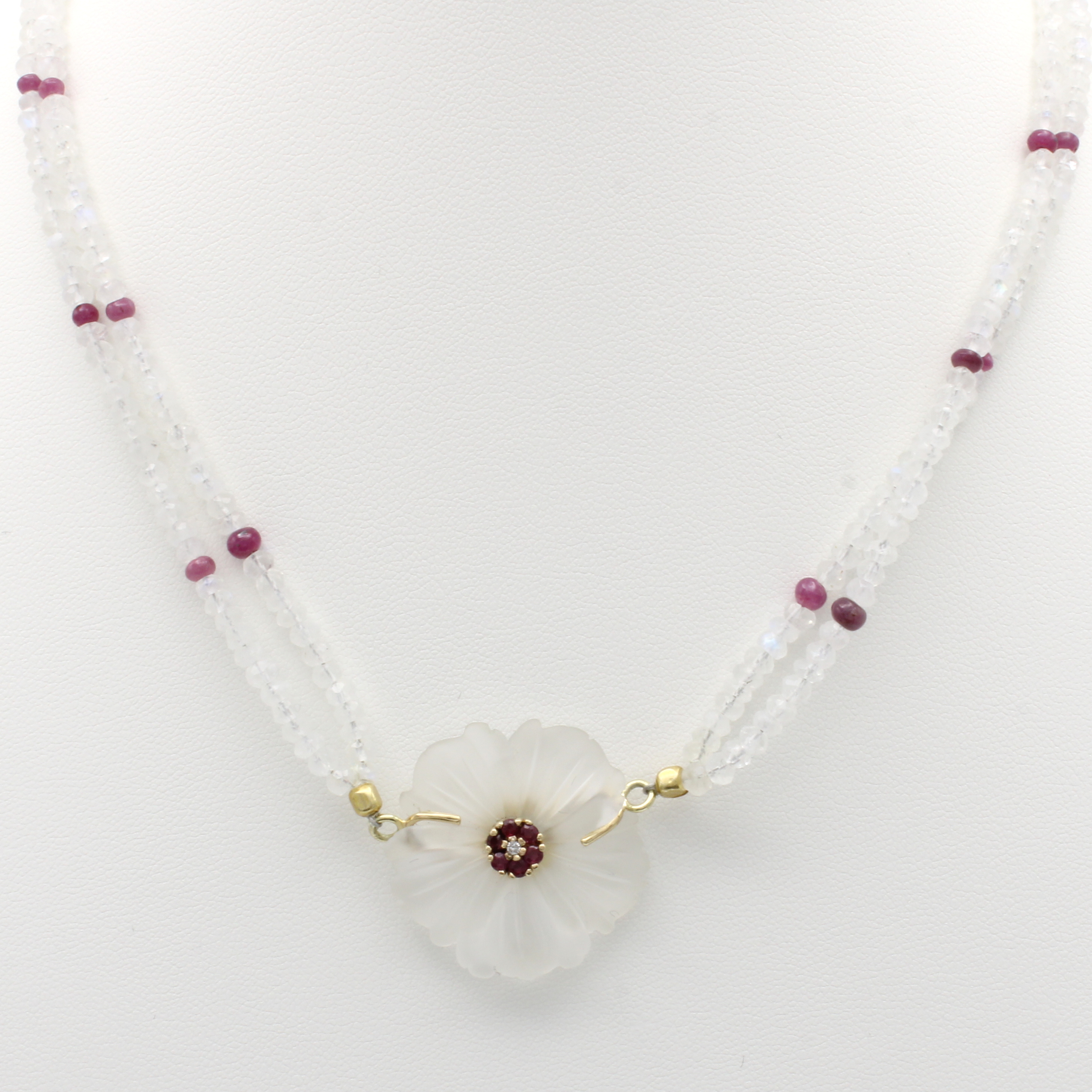 2-reihige Kette mit Bergkristallen, Brillantenund Farbsteinen, GG 585/000, Karabinerschl.,Mittelteil in Form einer Blüte aus Bergkristall mit Brill. ca. 0.02 ct Weiß/si und Rubinen, L. ca. 40 cm Schätzpreis: 900, - EUR