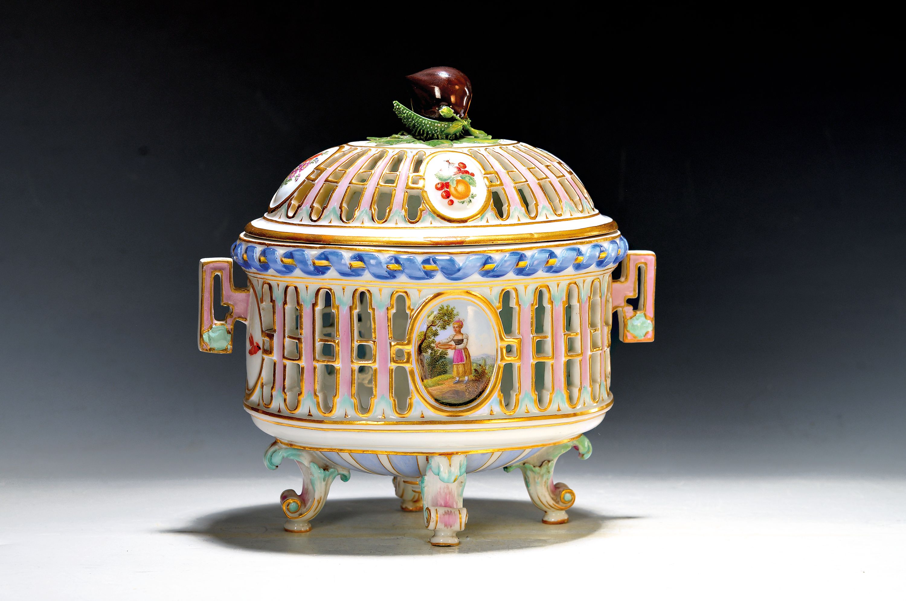 einer Kastanie, Medaillons mit feiner Figurenmalerei, Früchte u. Blumengebinde auf
