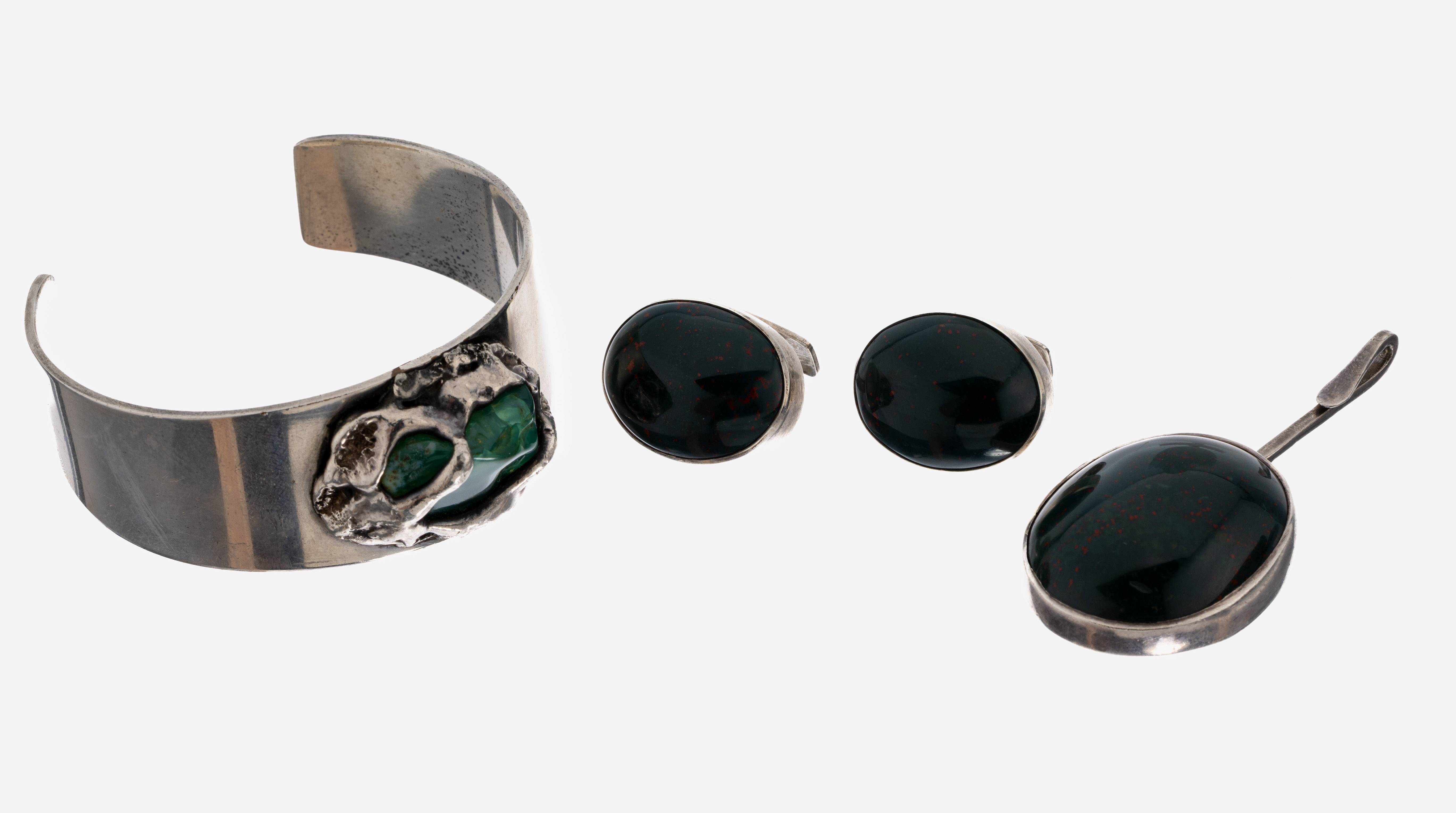mit großem Heliotrop-Cabochon, Anhänger bez. Hansen, Manschettenknöpfe GD & Co.,