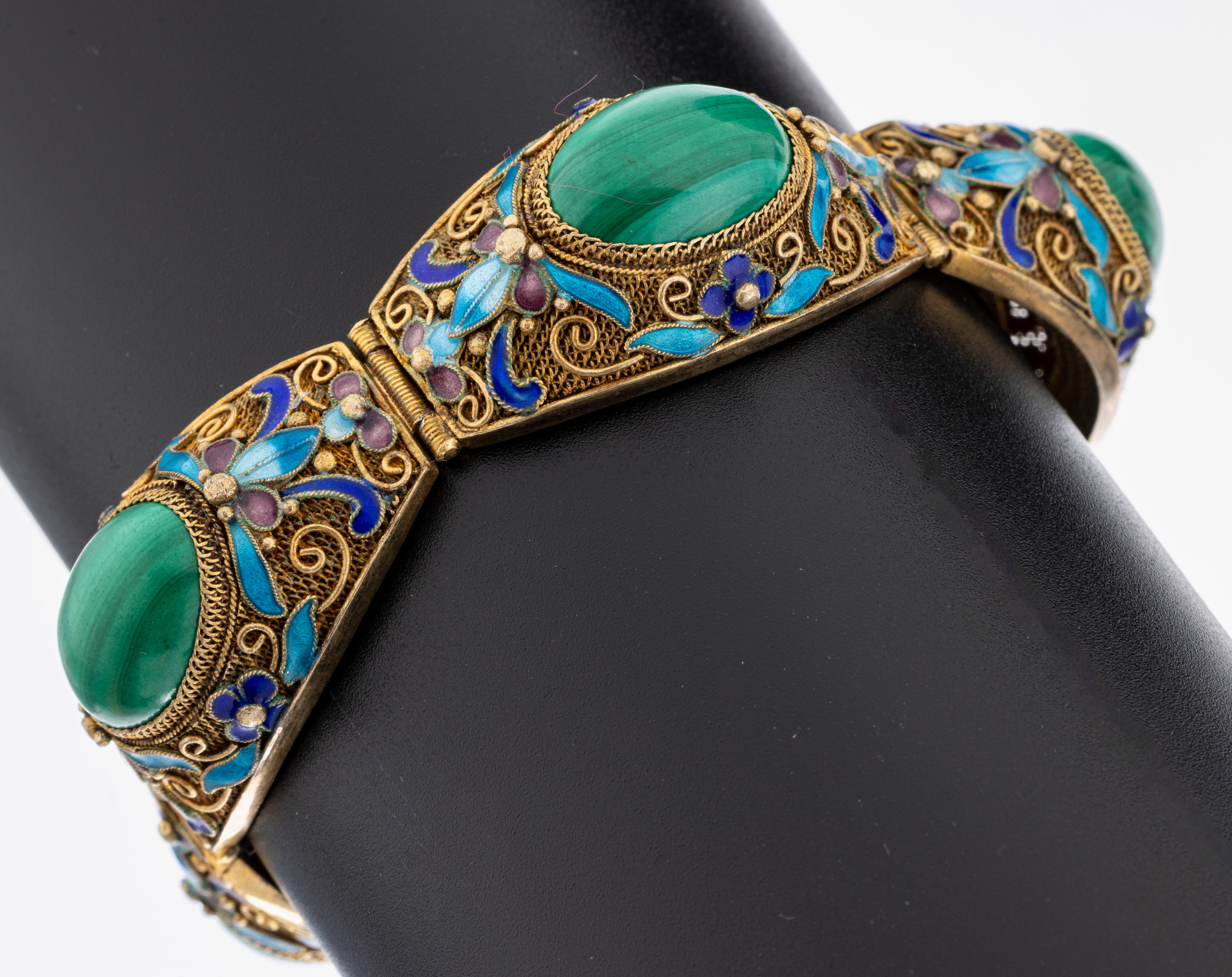 Malachit-Email-Armband, China 1960er Jahre, Silber verg., ovale Glieder mit Malachit-