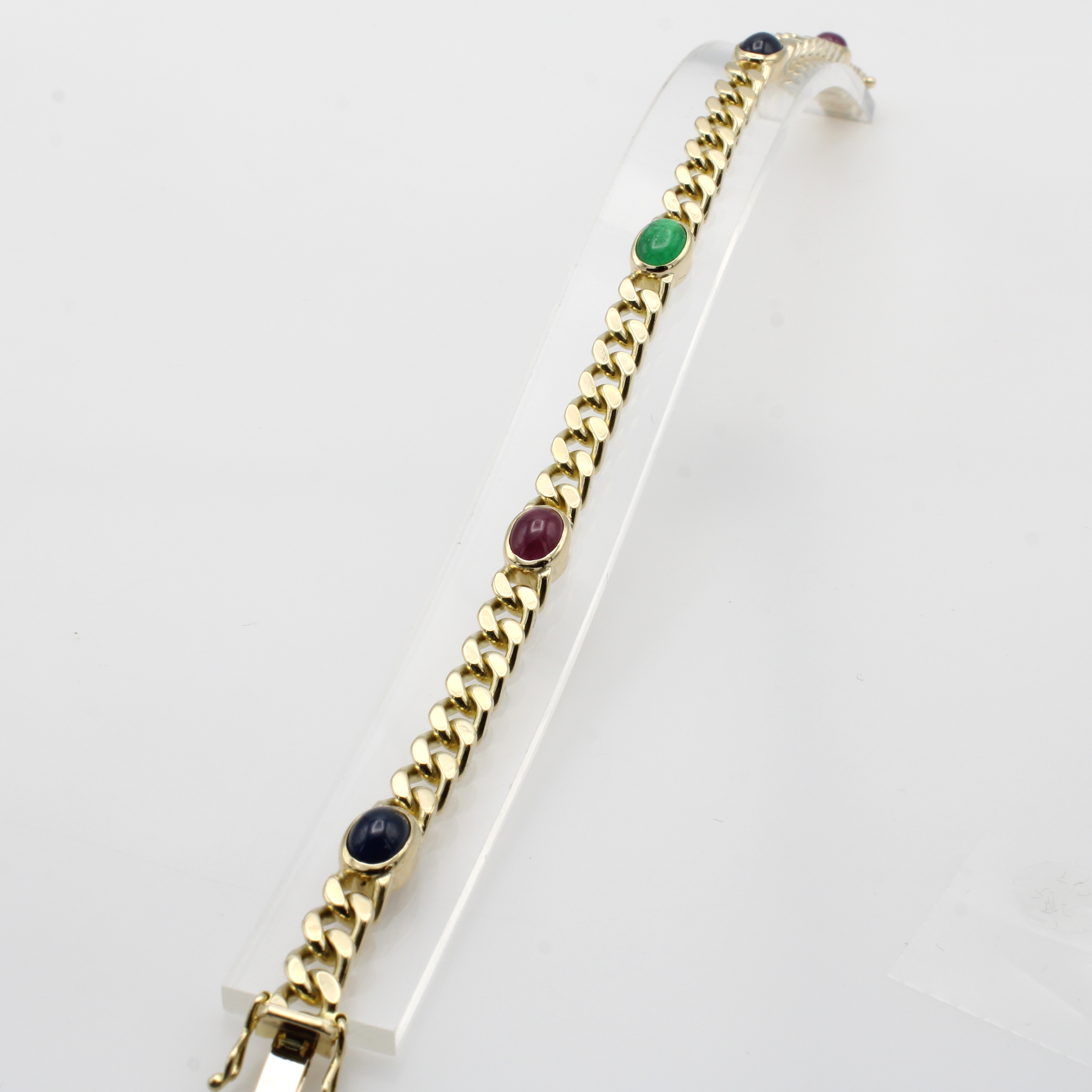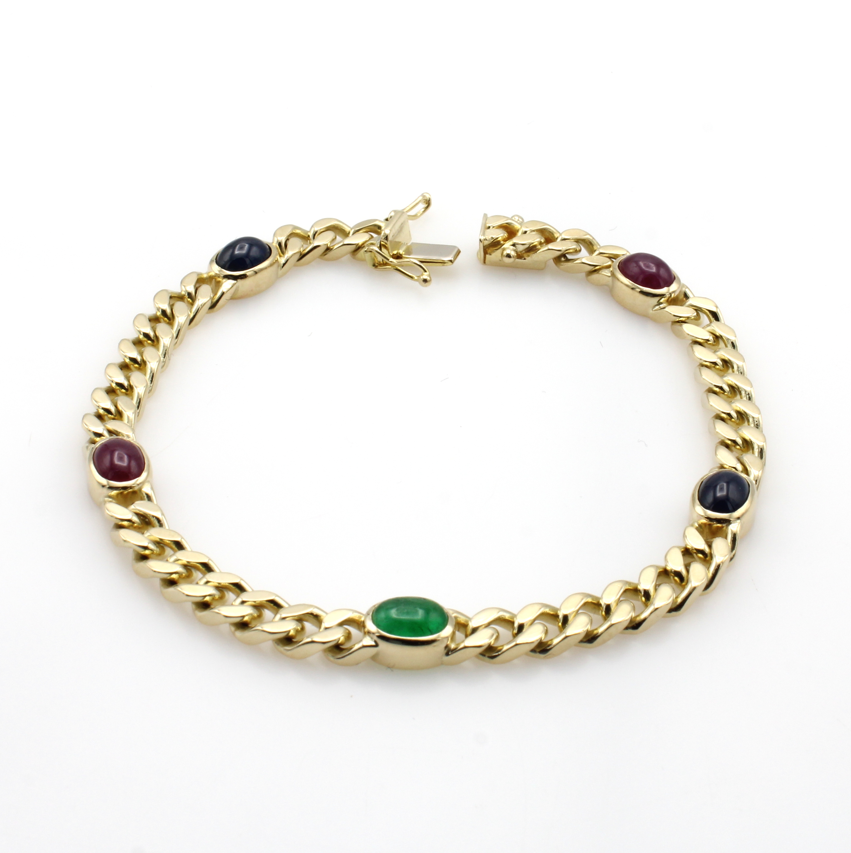 Massives Panzerarmband mit Farbsteinen, GG 585/000, 2 Saphircabochons, 2 Rubincabochons und 1 Smaragdcabochon zus. ca. 6.0 ct, Kasten-schl. m. Sicherheitsacht, L. ca. 20 cm Schätzpreis: 6000, - EUR
