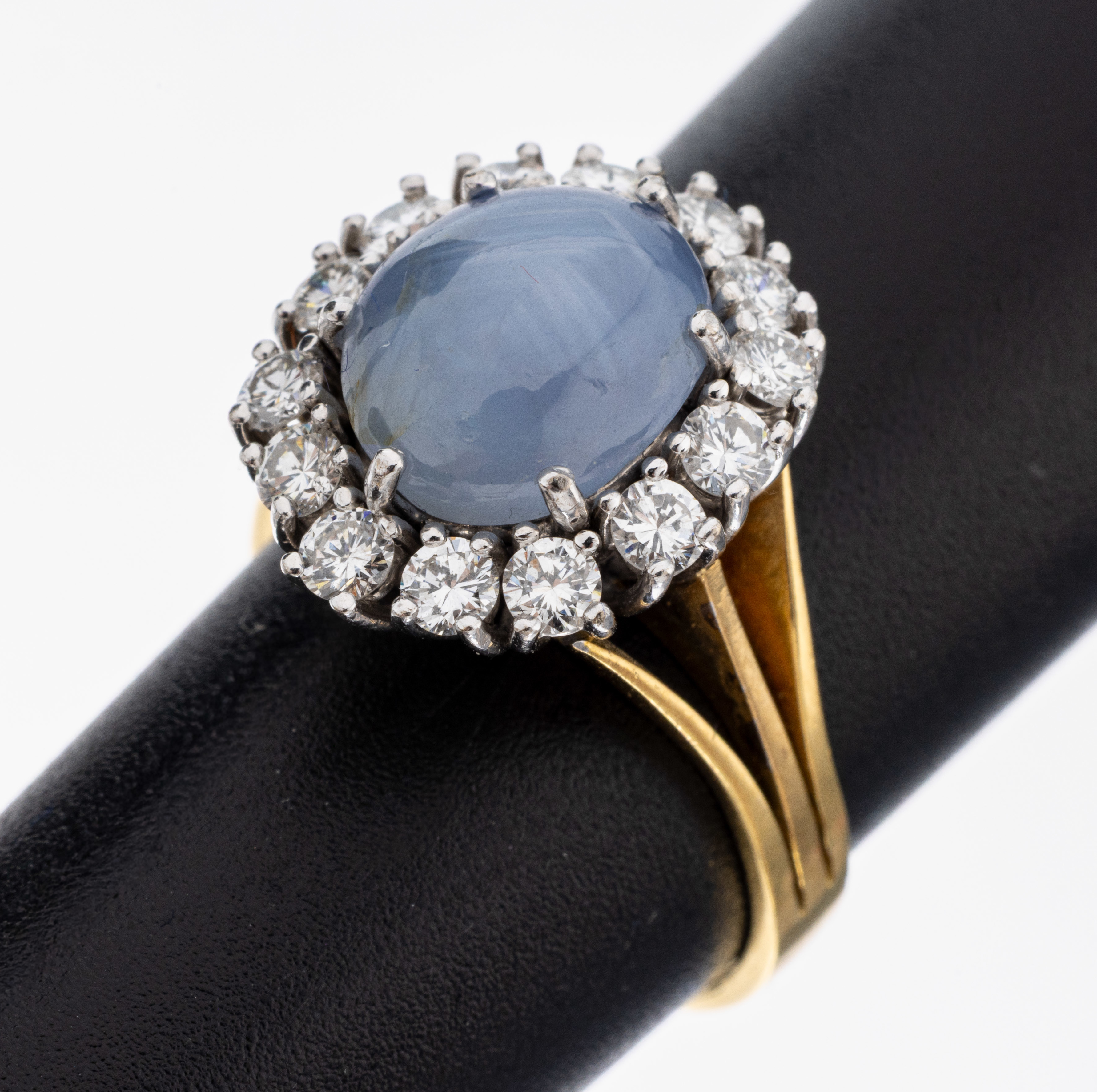 18 kt gold sapphire-brilliant-ring , YG/WG 750/000, centered oval star sapphire-cabochon