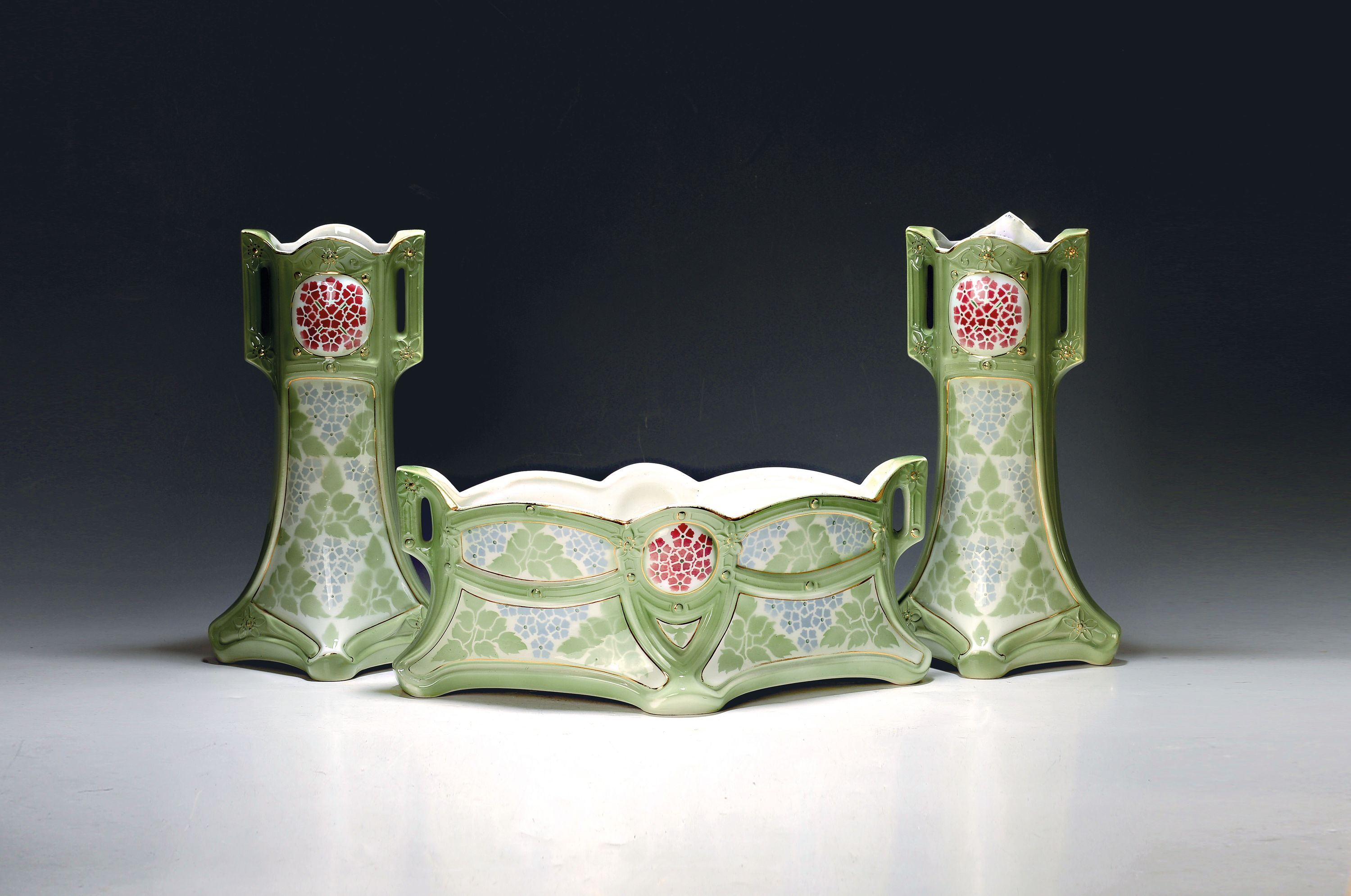 Fond mit floralem Dekor, Goldstaffage, Formnr. 147, Vasen H. 33cm, J. 17x40x20 cm,