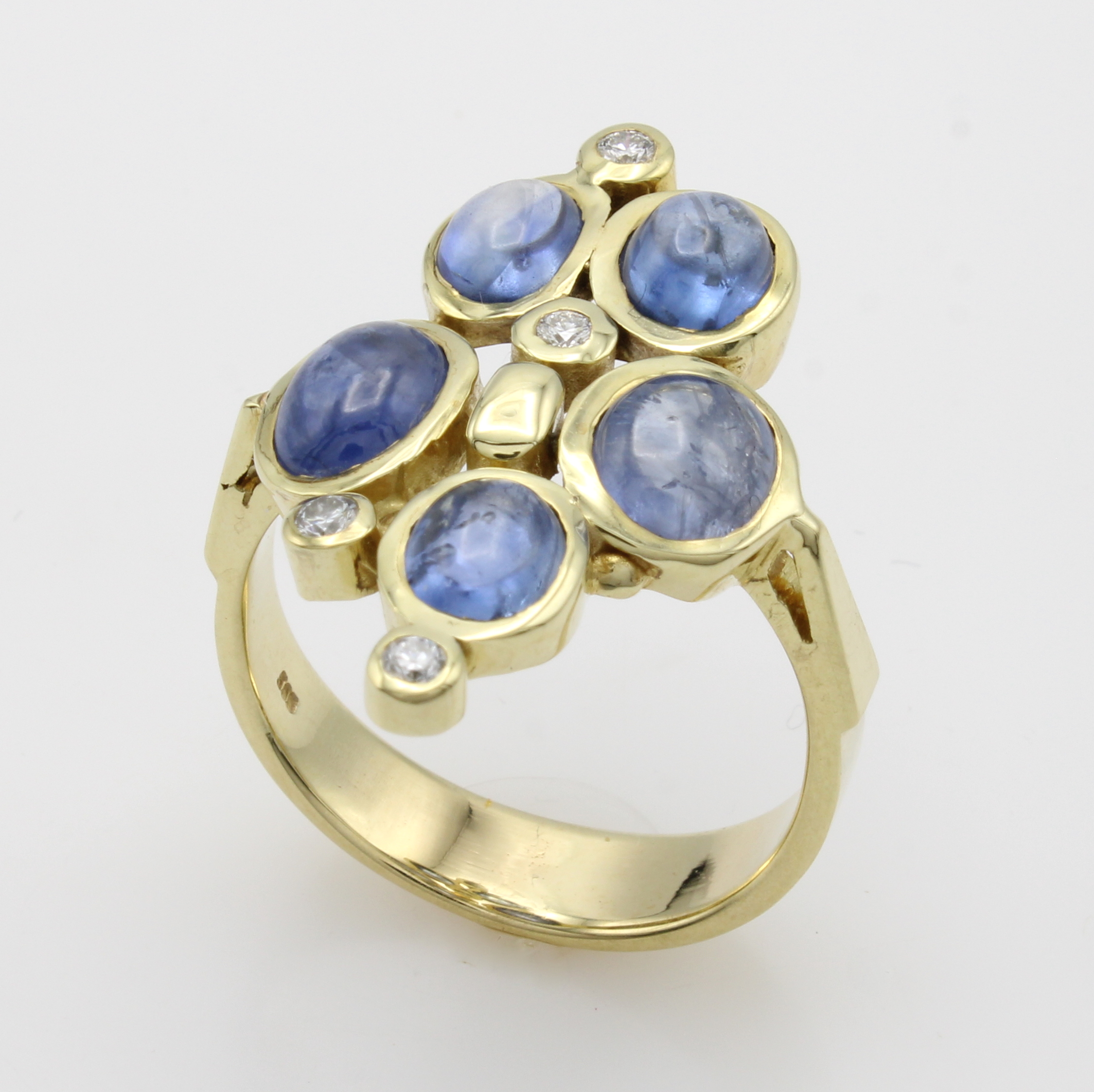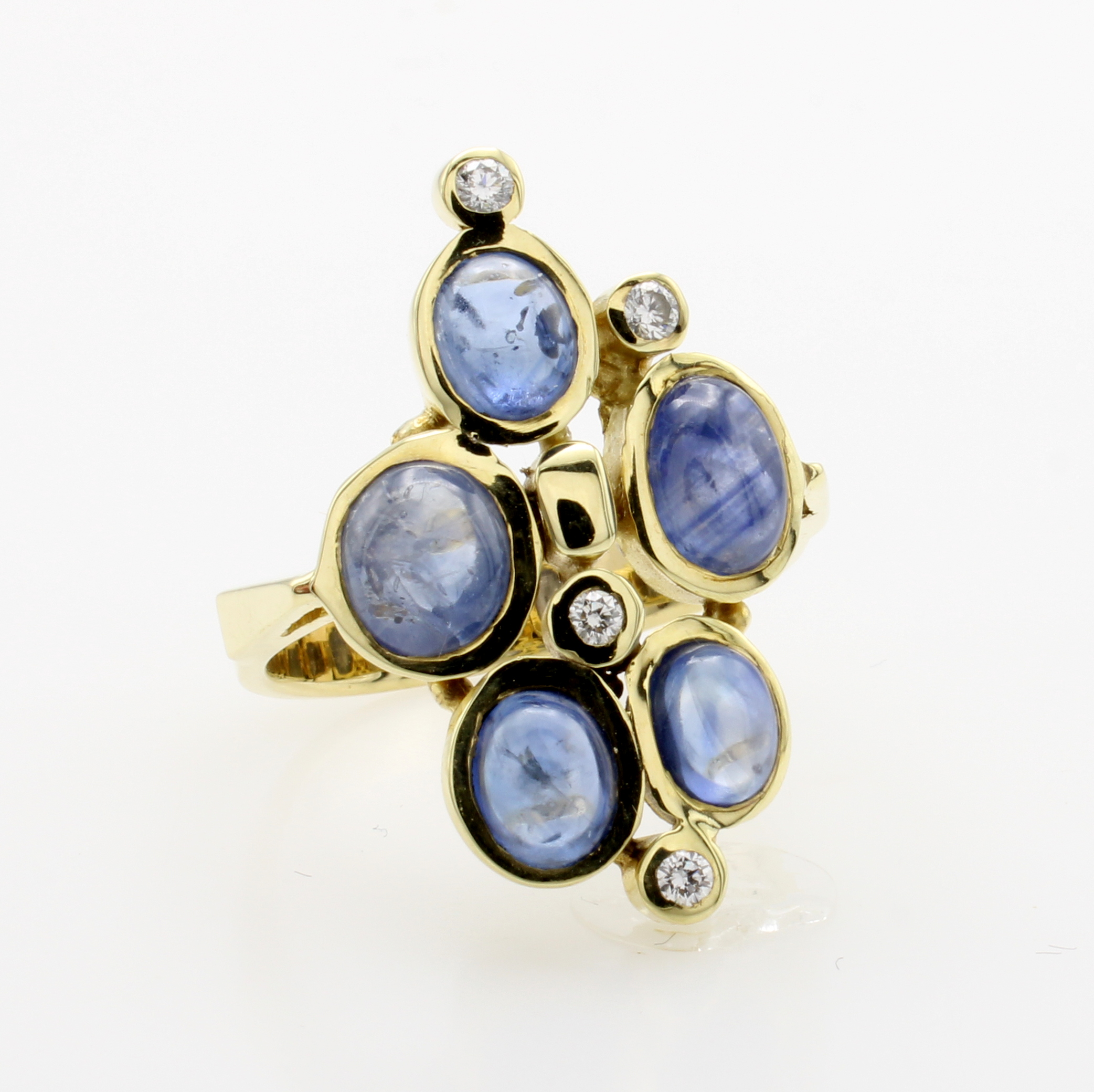 Ring mit Saphiren und Brillanten, GG 585/000, 5 Saphircabochons zus. ca. 6 ct, 4 Brill. zus. ca. 0.13 ct feines Weiß/vs, RW ca. 61 Schätzpreis: 3800, - EUR