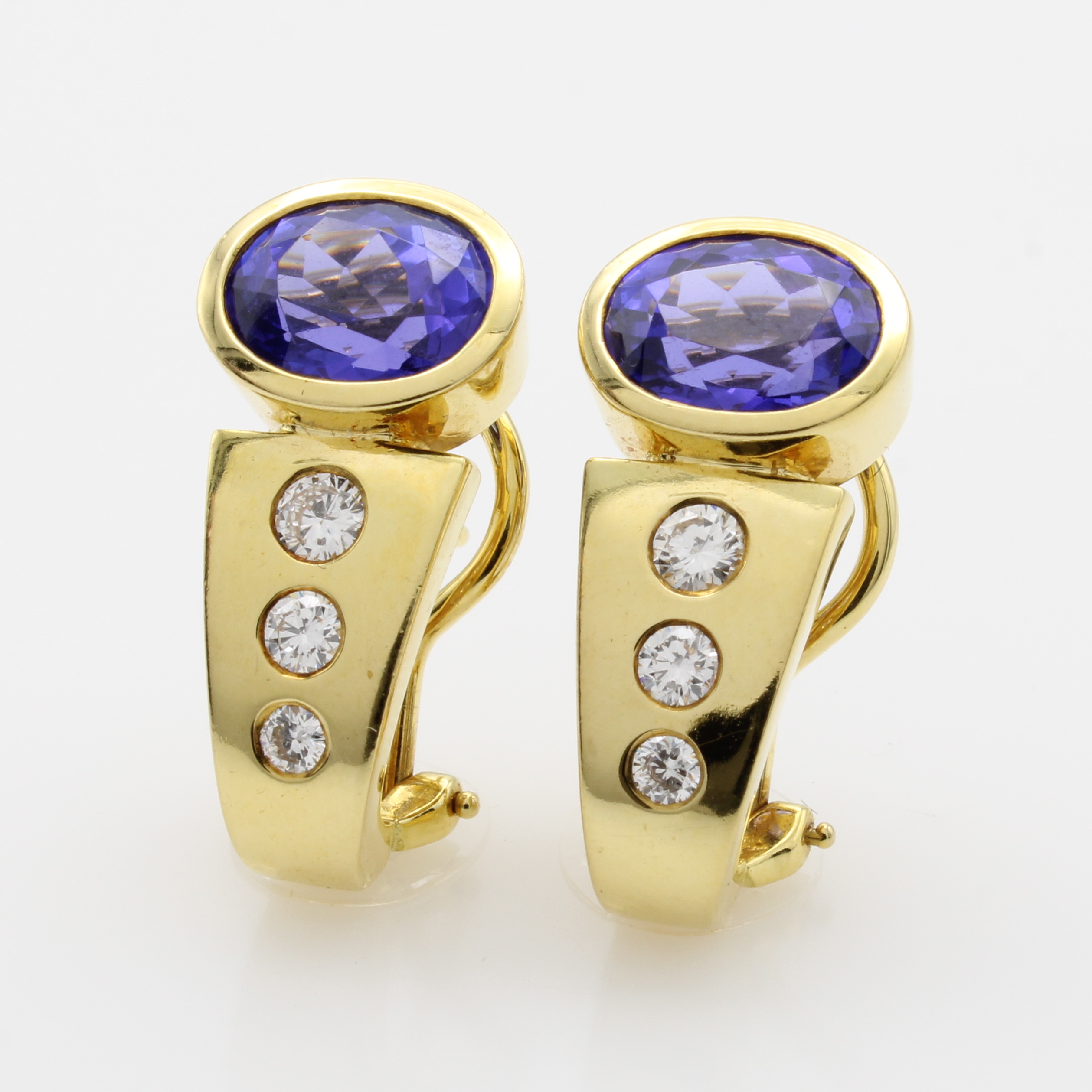 Paar Ohrstecker mit Tansaniten und Brillanten, GG 750/000, 2 ovale Tansanite zus. ca. 4.41 ct, 6 Brill. zus. ca. 0.41 ct feines Weiß/si, l. gebogene Form, m. Clipbrisur Schätzpreis: 9980, - EUR