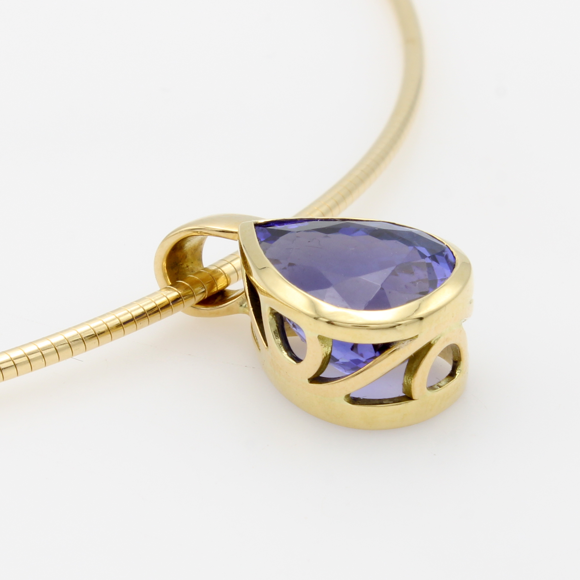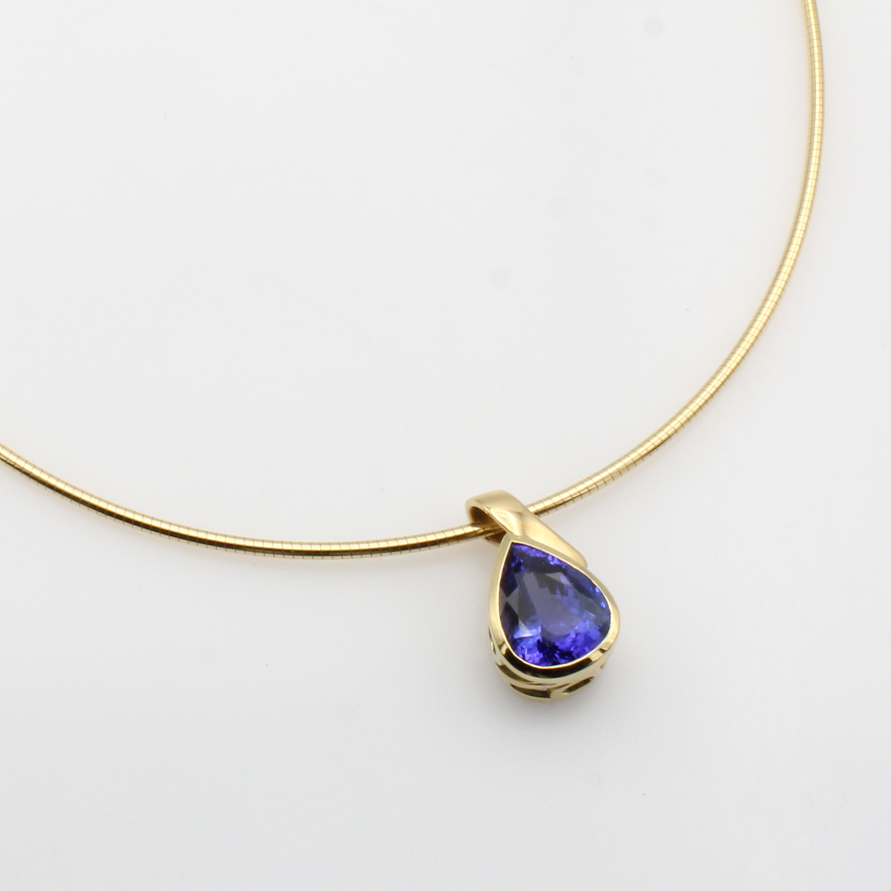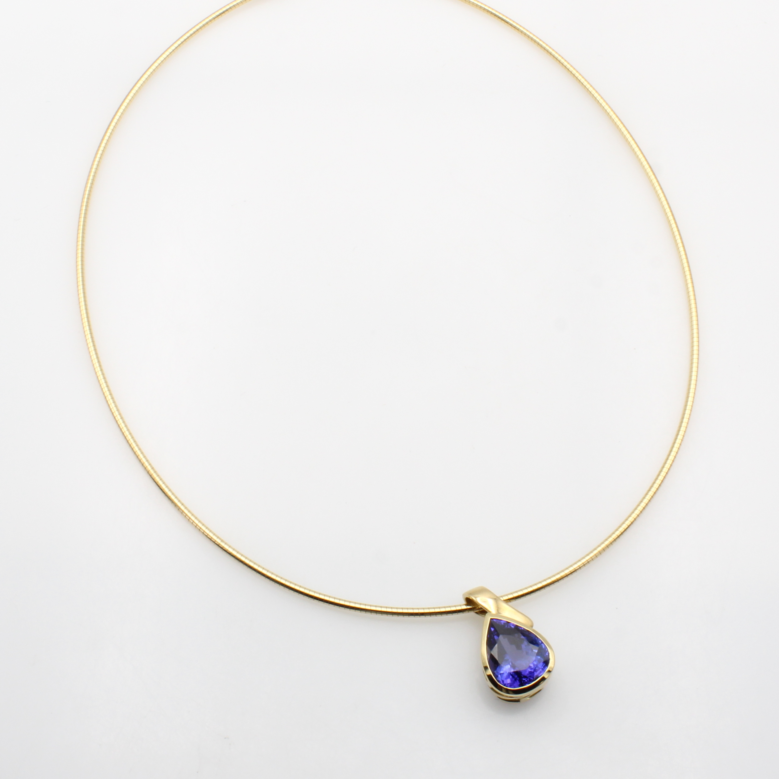 Anhänger mit Tansanit an Omegareif, GG 750/ 000, Tansanittropfen v. sehr schöner Farbe ca. 8.6 ct, L. ca. 45 cm Schätzpreis: 16000, - EUR