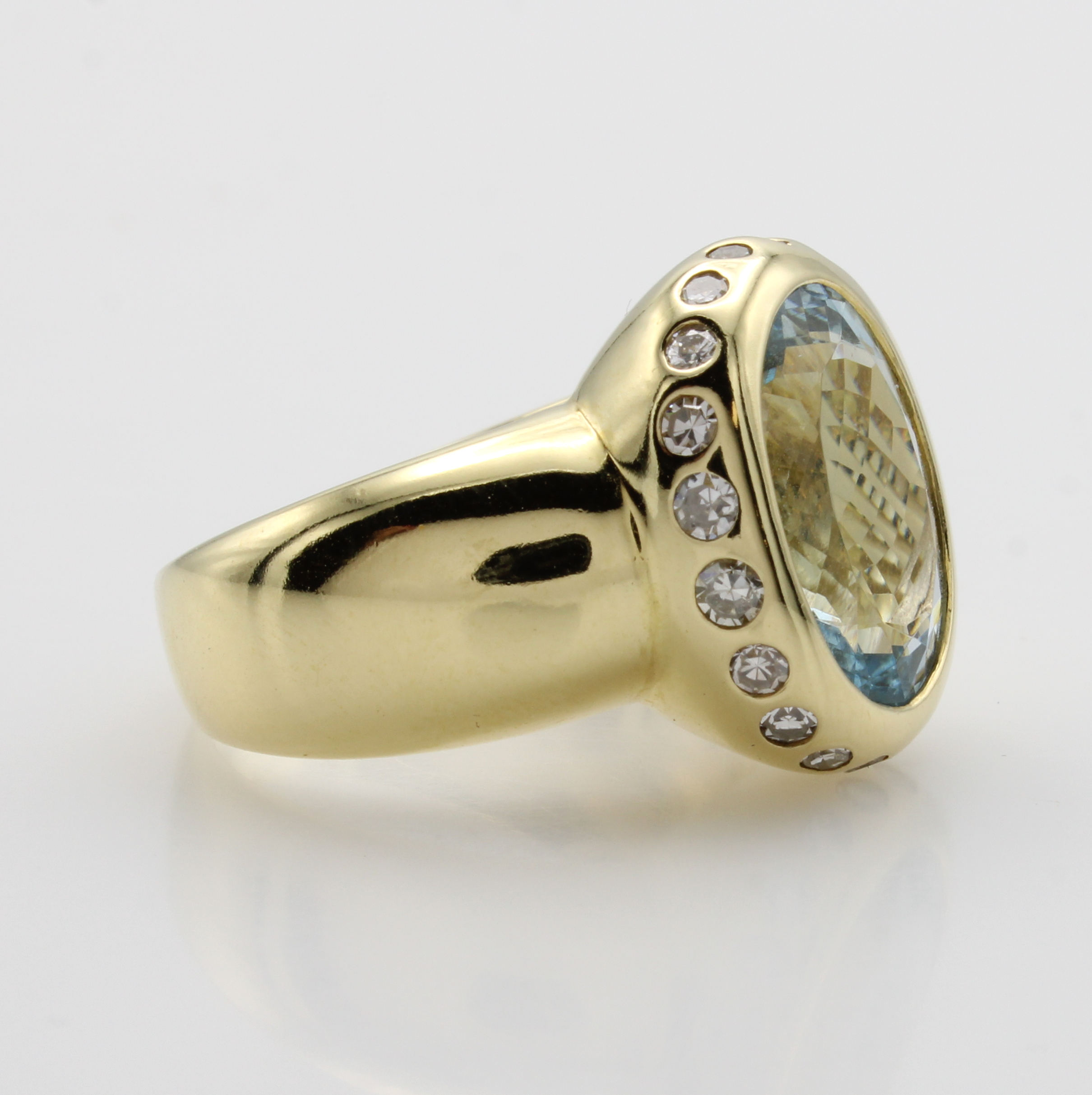 Ring mit Aquamarin und Diamanten, GG 585/ 000, ovaler Aquam. ca. 5.12 ct, Diam. an Außenseite v. Ringkopf gef. zus. ca. 0.55 ct Weiß/si, RW ca. 55.5 Schätzpreis: 7200, - EUR