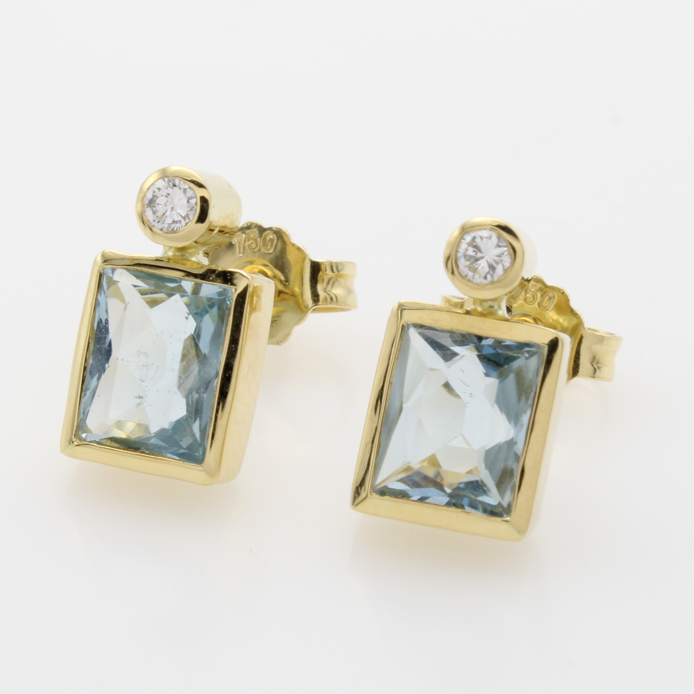 Paar Ohrstecker mit Aquamarinen und Brillanten, GG 750/000, 2 rechteckige Aquam. zus. ca. 1.8 ct, 2 Brill. zus. ca. 0.05 ct feines Weiß/vs-si Schätzpreis: 3000, - EUR