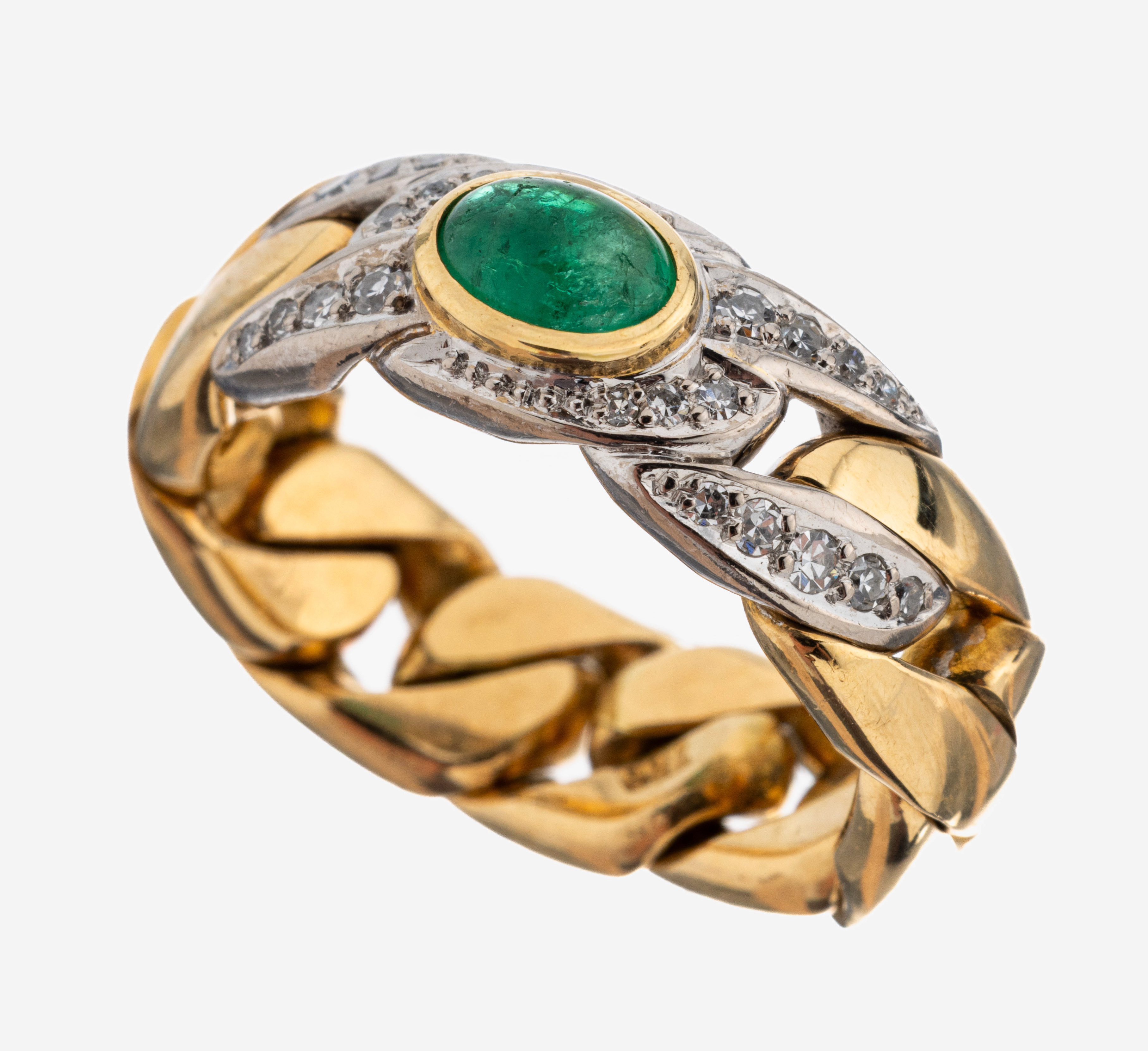 18 kt gold emerald-diamond-chainring , YG/WG750/000, centered oval emerald cabochon