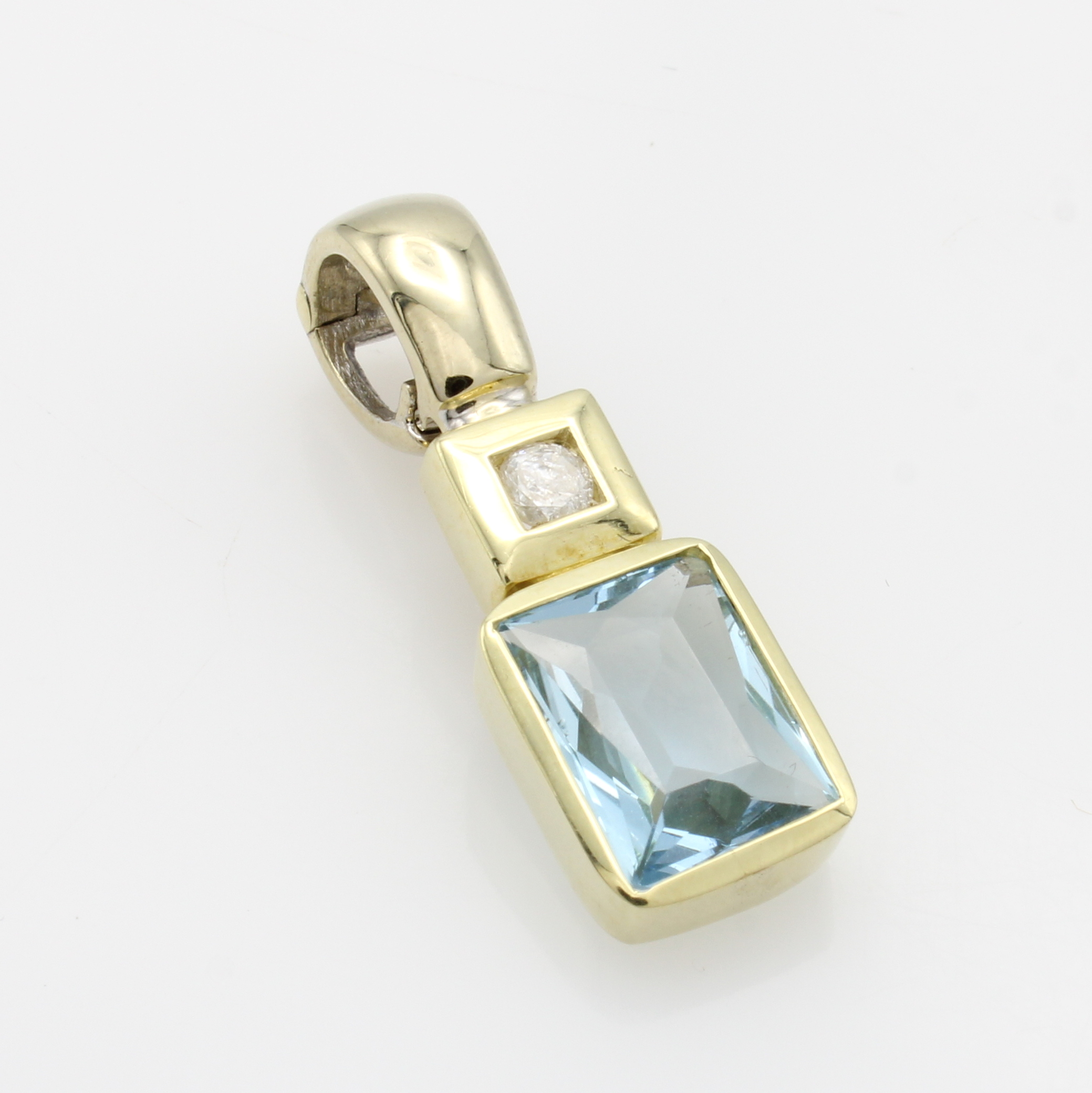 Clipanhänger mit Aquamarin und Brillant, GG 585/000, rechteckiger Aquam. ca. 1.75 ct, Brill. in carréef. Fassung ca. 0.06 ct Weiß/p Schätzpreis: 2200, - EUR