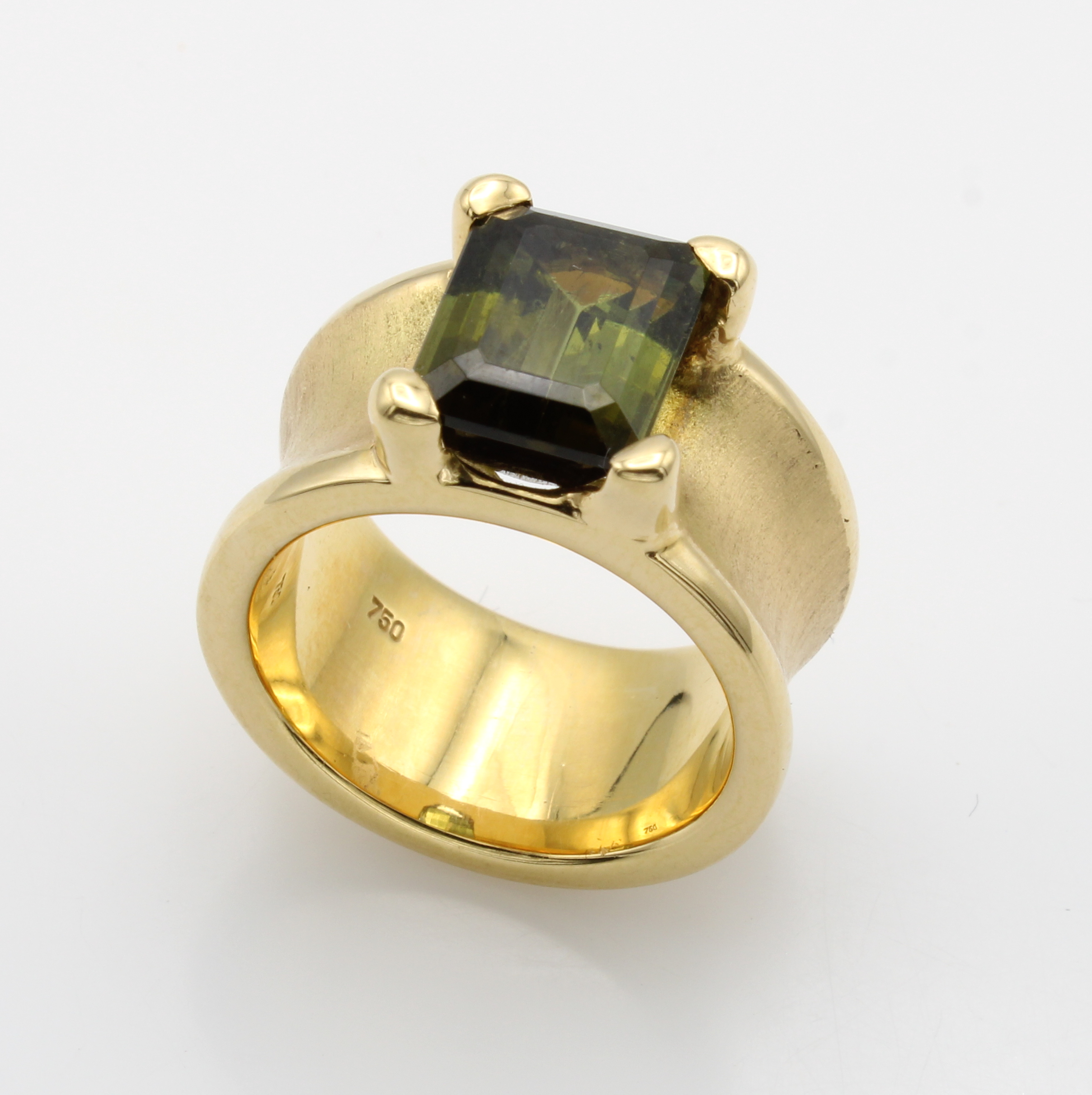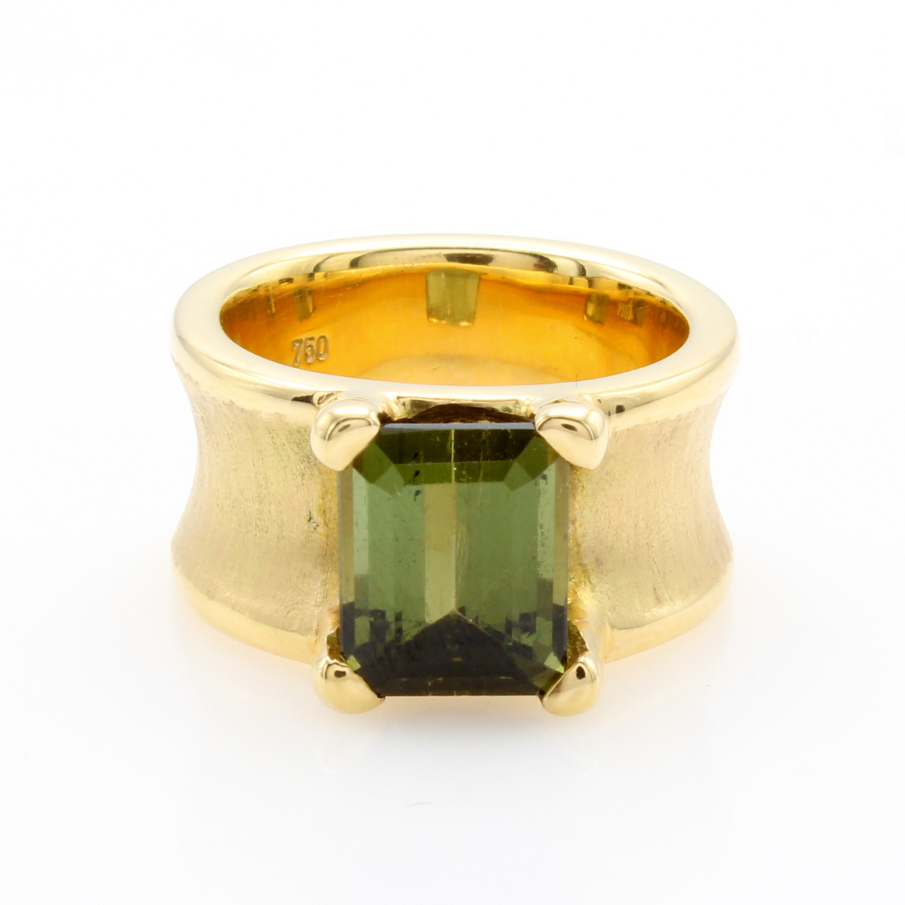 Ring mit Turmalin, GG 585/000, konkave Schiene z.T. matt., grüner Turmalin in Krappenfassung ca. 5.24 ct, RW ca. 52.5 Schätzpreis: 8800, - EUR