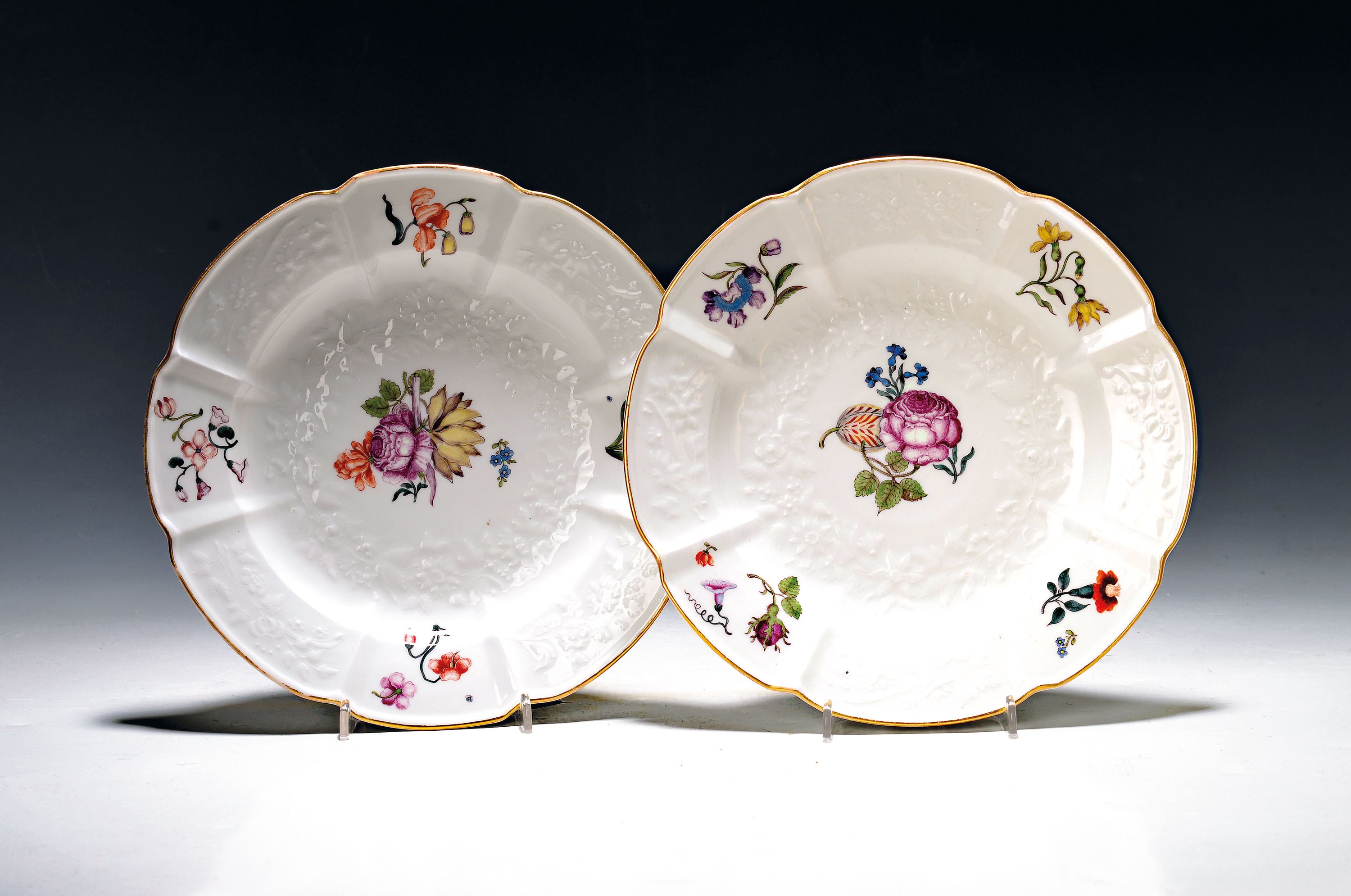 Paar barocke Teller, Meissen, um 1750, Gotzkowski Relief, feine Holzschnittblumen,