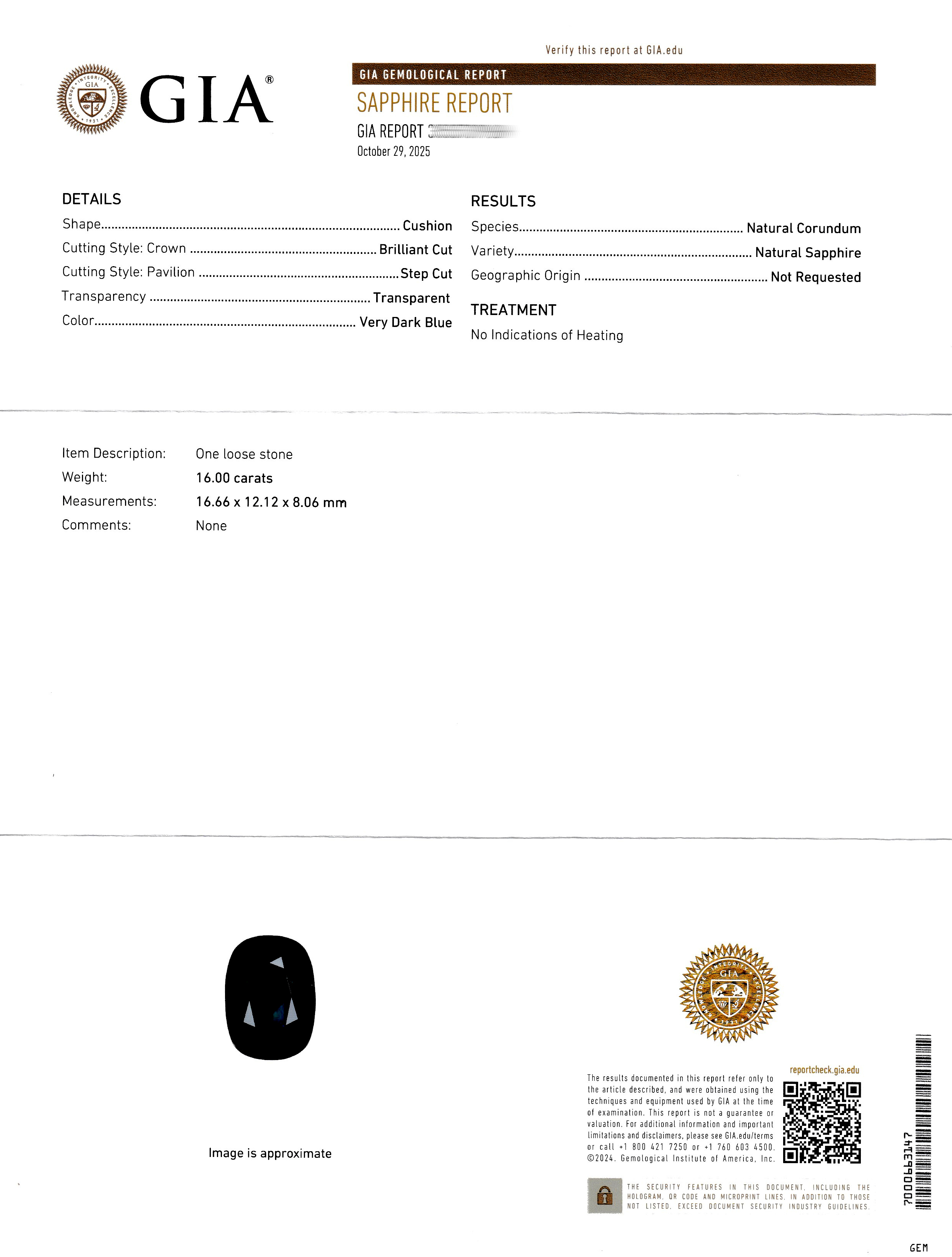 Loser Saphir, 16.00 ct, Brillant Step Cut, very dark blue, 16.66 x 12.12 x 8.06 mm,