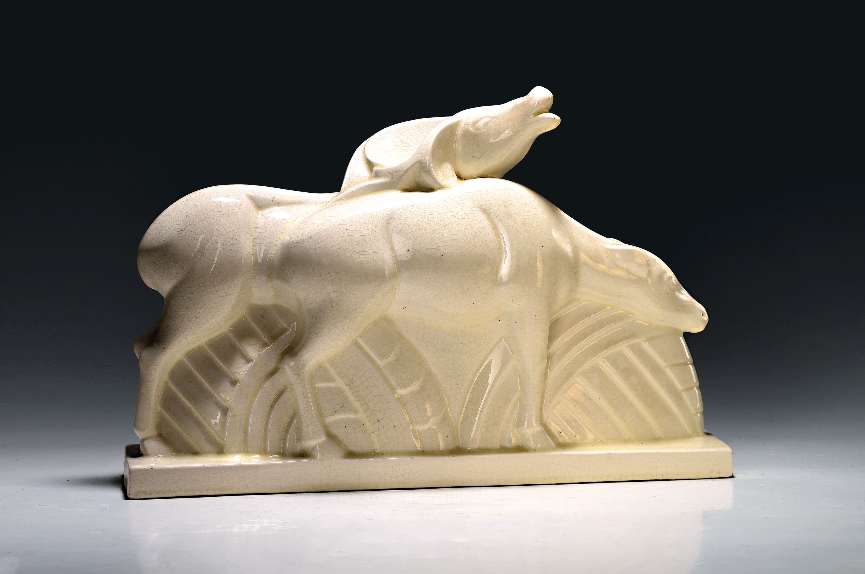 im Art Deco-Stil, Paar Antilopen, cremefarbene Krakeleglasur, grüner Firmenstempel,