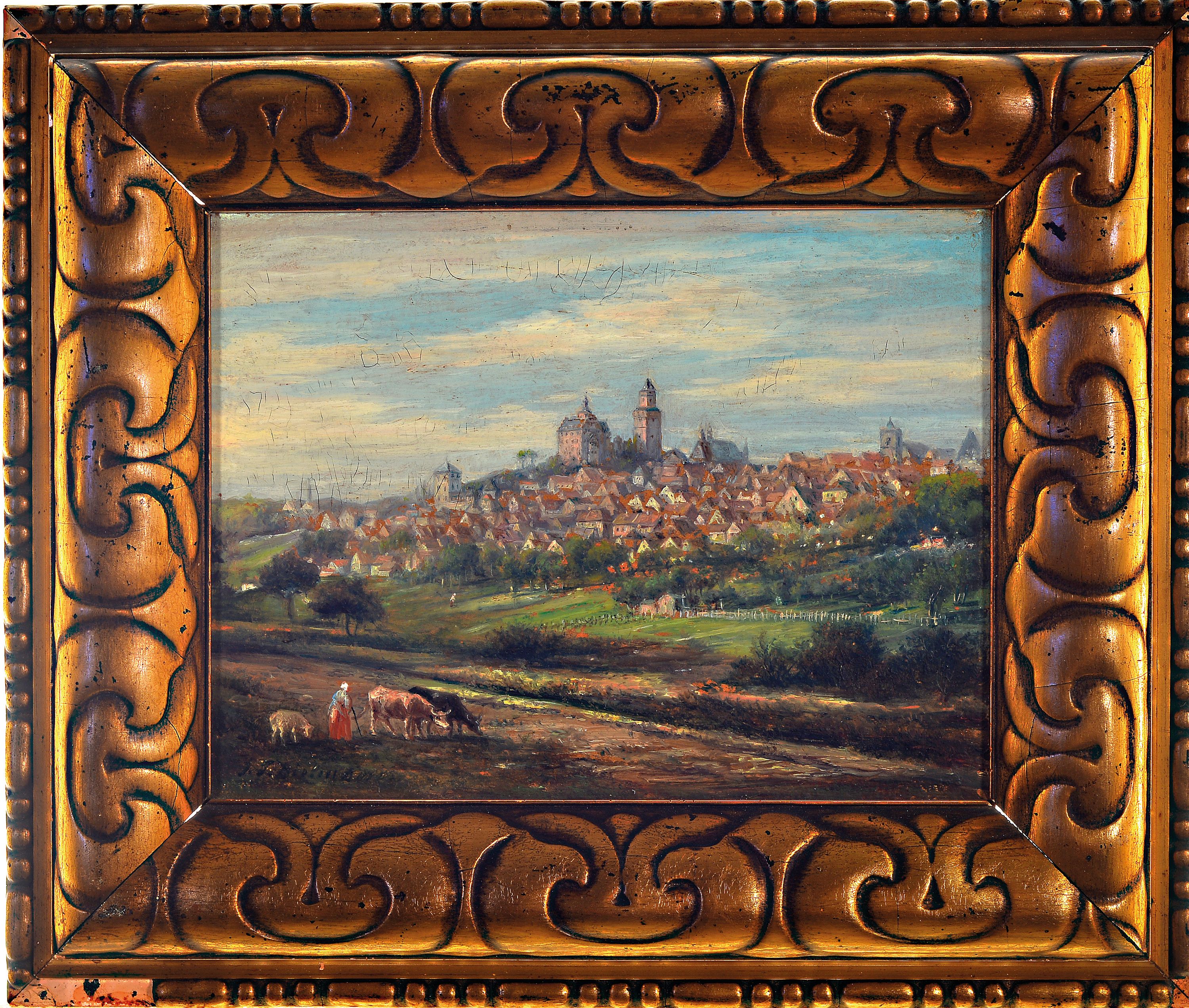 im Taunus mit der Burg Kronberg, im Vordergrund Magd mit Tieren, Öl/Pappe, li. unten