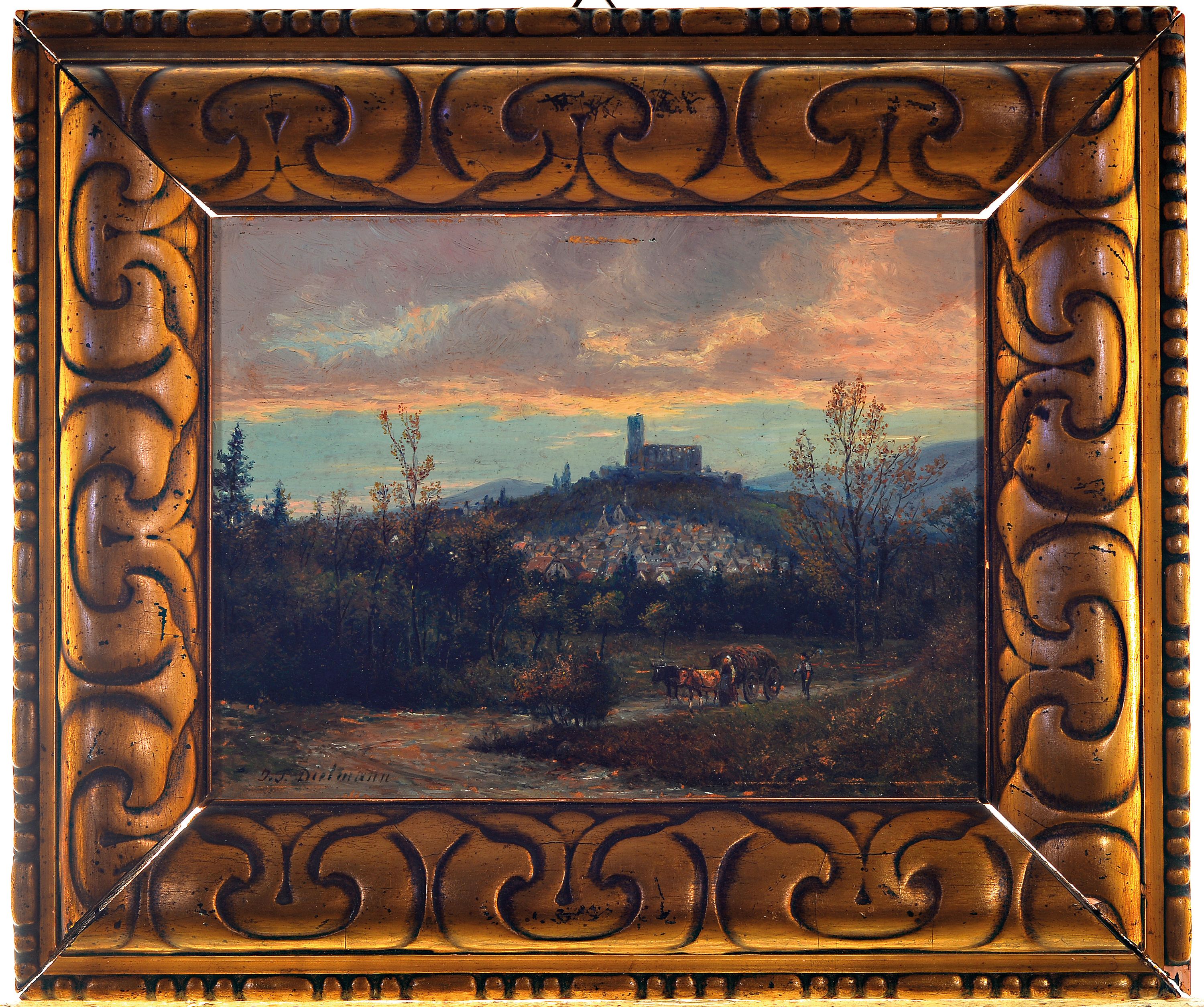 Taunus witha view of the castle, in the foreground an ox cart, oil/cardboard, left.