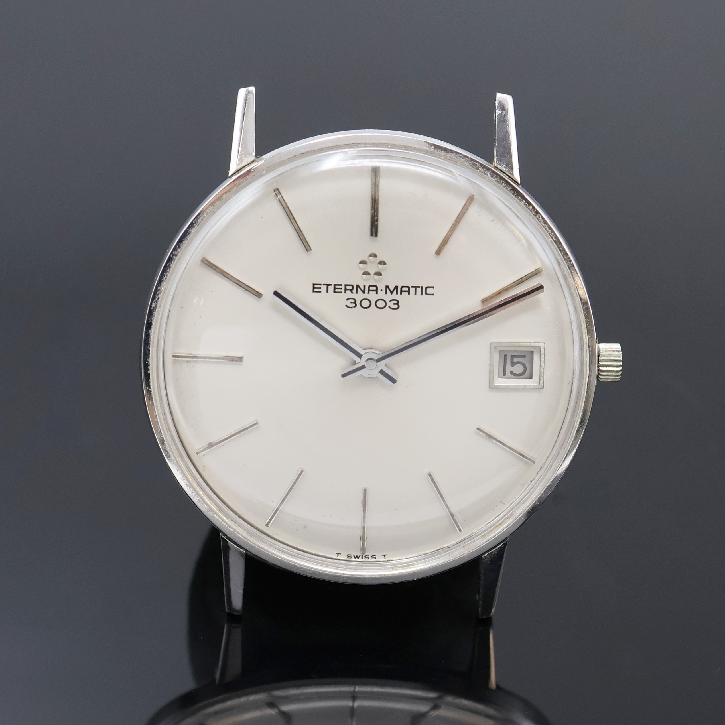 Boden aufgedr., silb. Zifferbl. m. Tritium-Leuchtind., silb. Zeiger, Datum b. 3,