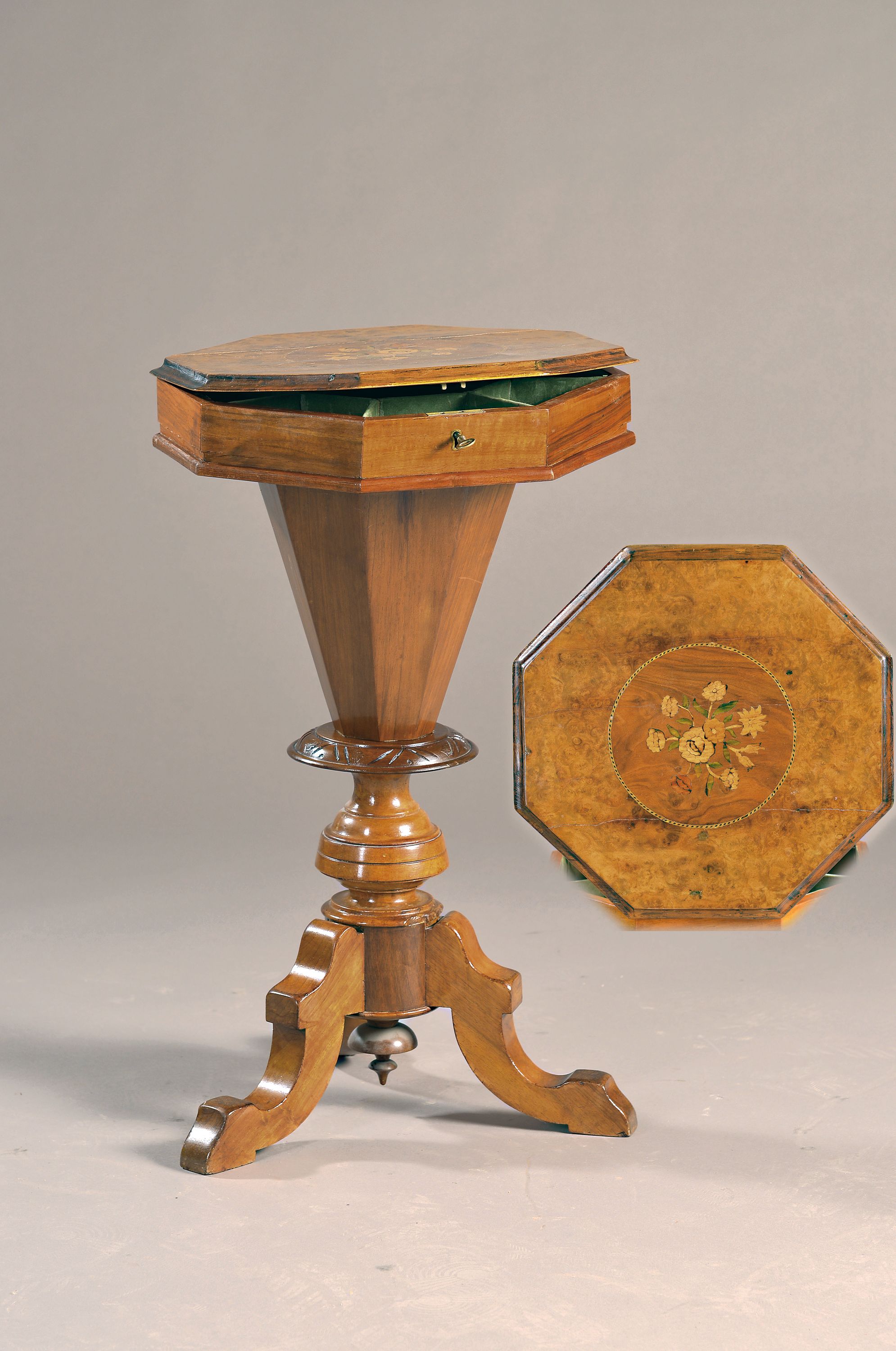 Beistelltischchen, 19.Jh., Kirschbaumfurnier, Deckplatte aufwendig mit Blumenintarsien,
