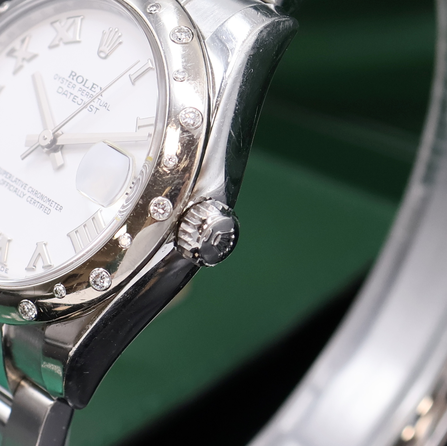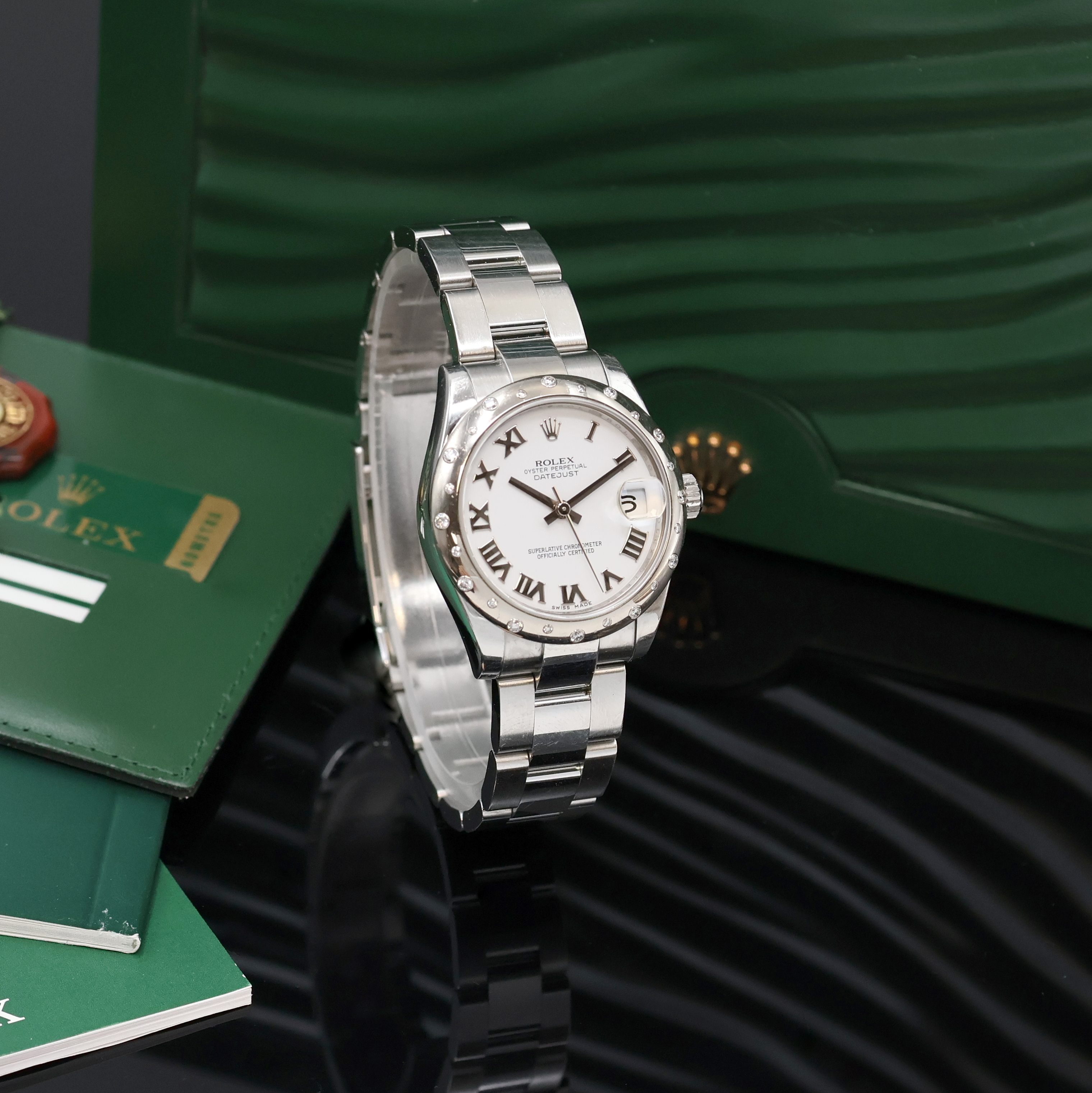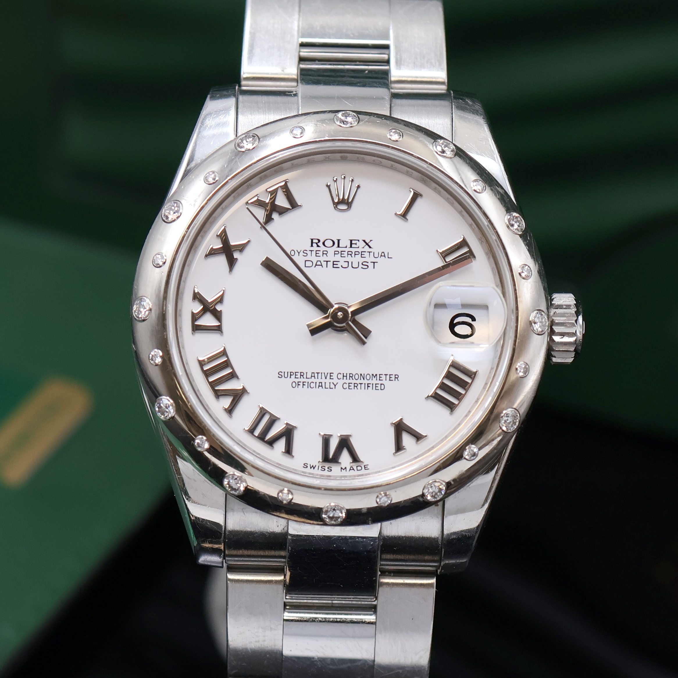 ROLEX Armbanduhr Oyster Perpetual Datejust 31 Referenz 178344, Automatik, LC 100, Edelstahlgeh. inkl. Oysterband m. Faltschl., Boden und Krone verschr., ab Herst. wasserd., WG-Lünette m. 24 Brillanten, weißes Zifferbl. m. röm. Std., Anz. v. Std., Min., Zentralsek. und Datum unter Saphirlupenglas, D. ca. 31 mm, L. ca. 20 cm, orig. Etui, Hangtag und Papiere, demnach gek. 12/2010, Nutzsp. altersbed., EZG 2-3, EZW 2
