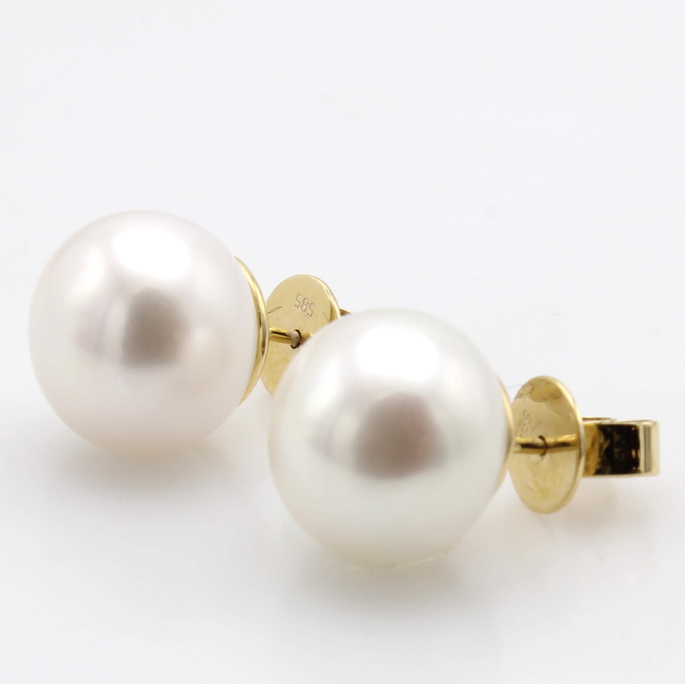 Paar Ohrstecker mit Süßwasserzuchtperlen, GG585/000, buttonf. Perlen v. weißem Lüster, D. ca. 11-12 mm Schätzpreis: 990, - EUR