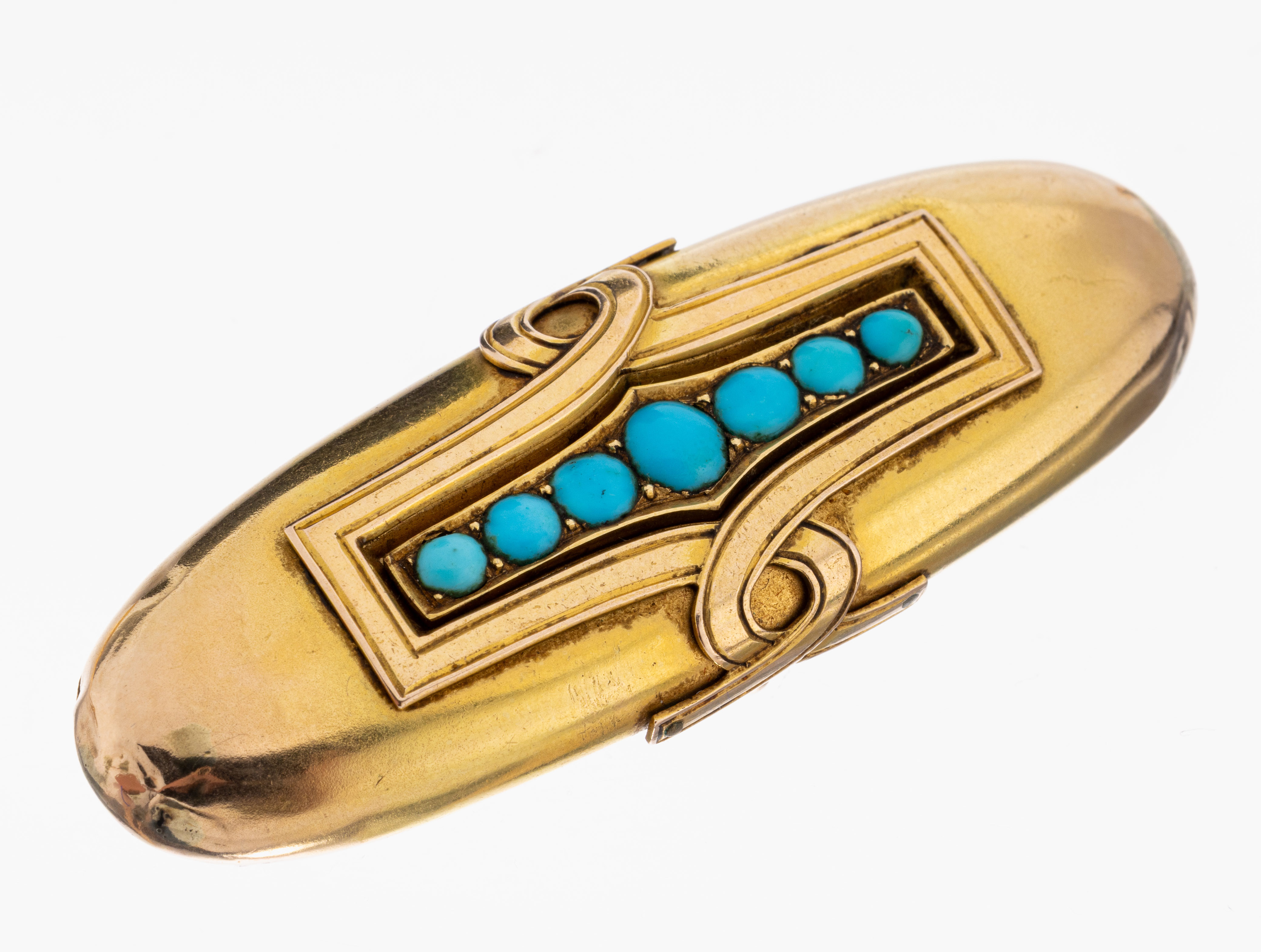 Vergoldung part. berieben, hohl gearbeitet, ovale Grundform, 7 Türkis-Cabochons