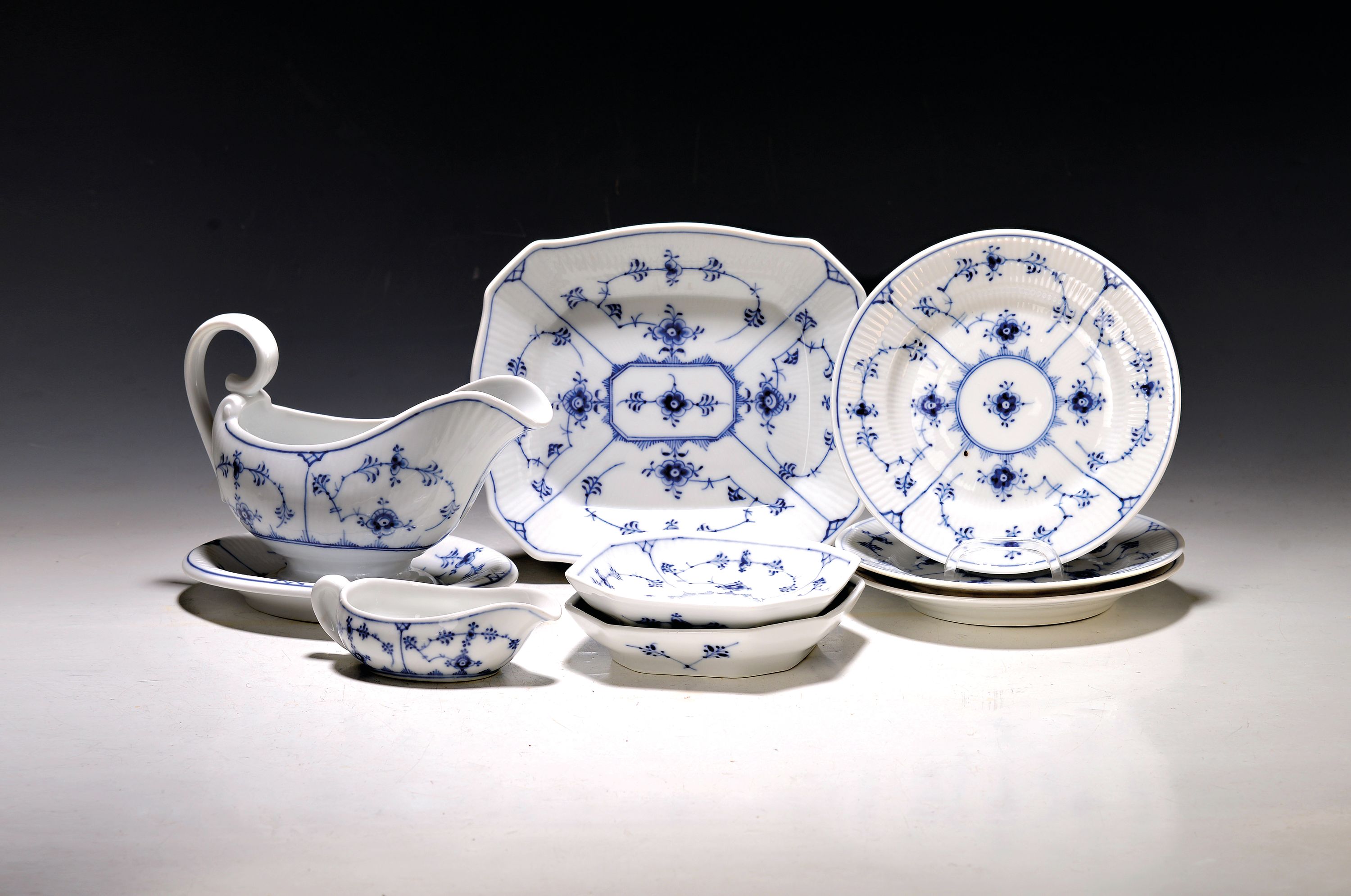 8 Serviceteile, Royal Copenhagen, Musselmalet, Porzellan, 3 Kuchenteller D.ca. 16,5
